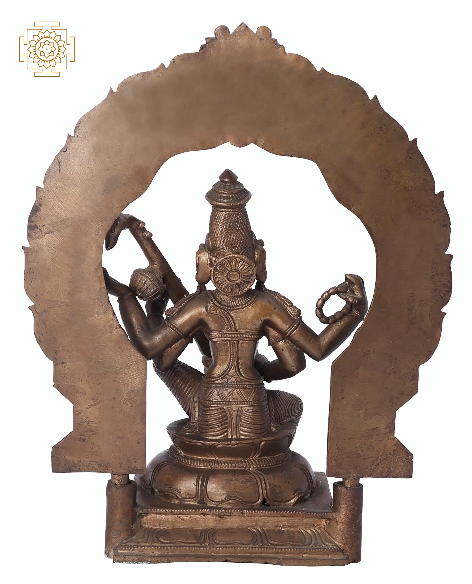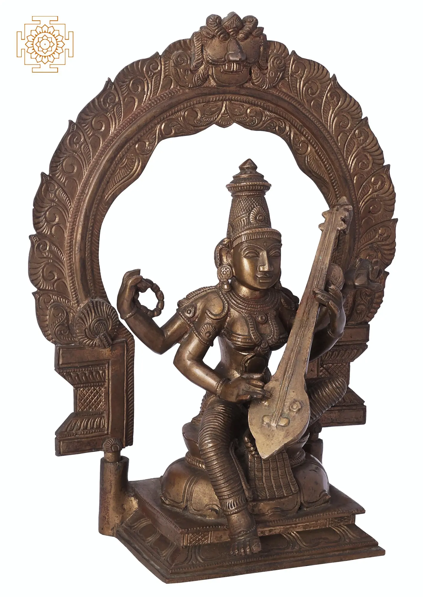 The throne of the supreme bestwoer of Gyan is a splendid element of this Panchaloha murti, with a lotus seat and an awe-inspiring aureole, embellished by the Kirtimukha at the centre, with two Makaras emerging from its gaping mouth. Kirtimukha in Hindu tradition represents the virtue of self-surrender and annihilation of pride, qualities that a devotee of Devi Saraswati needs to embody in order to evoke her powers within.