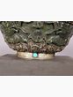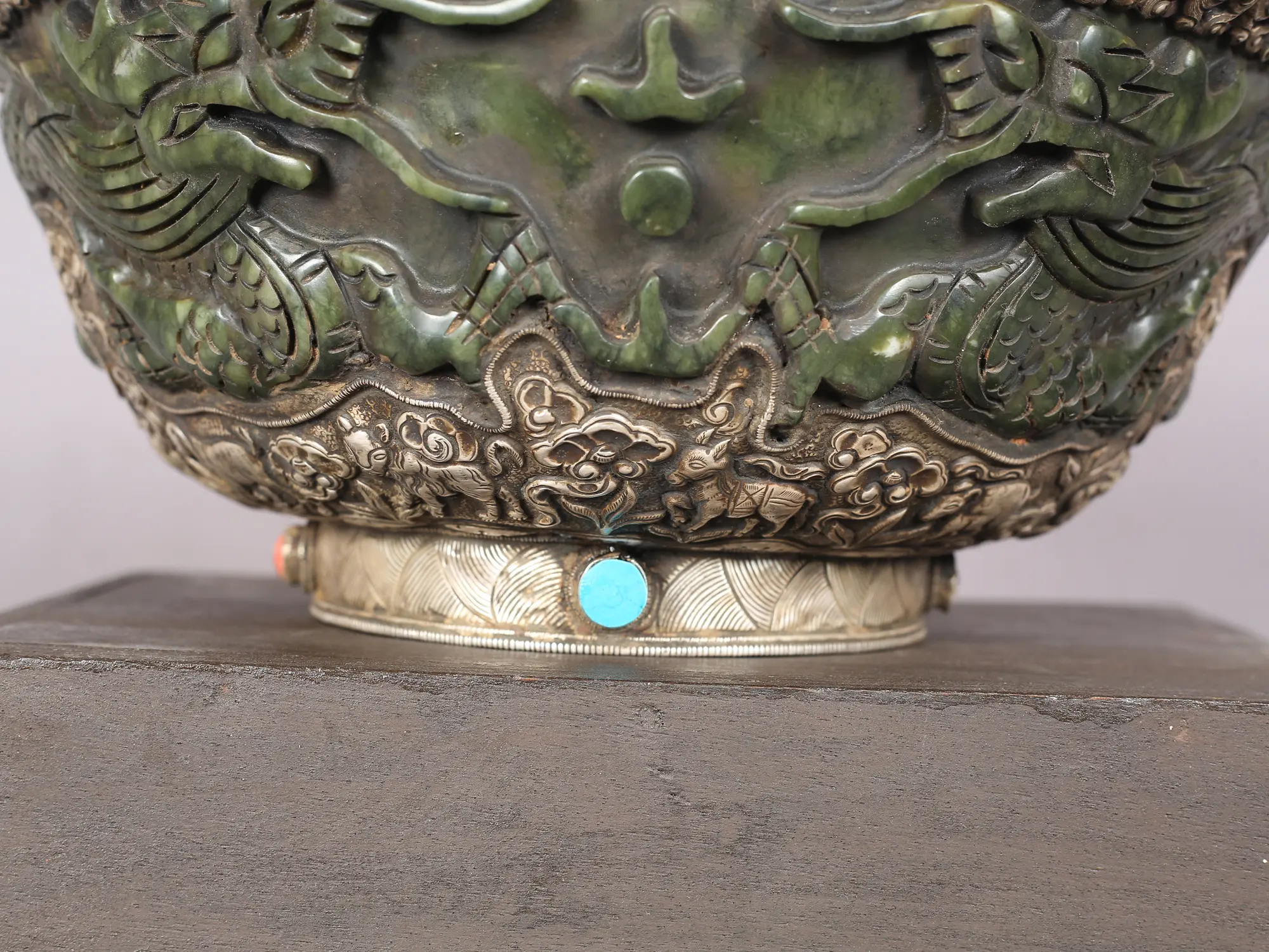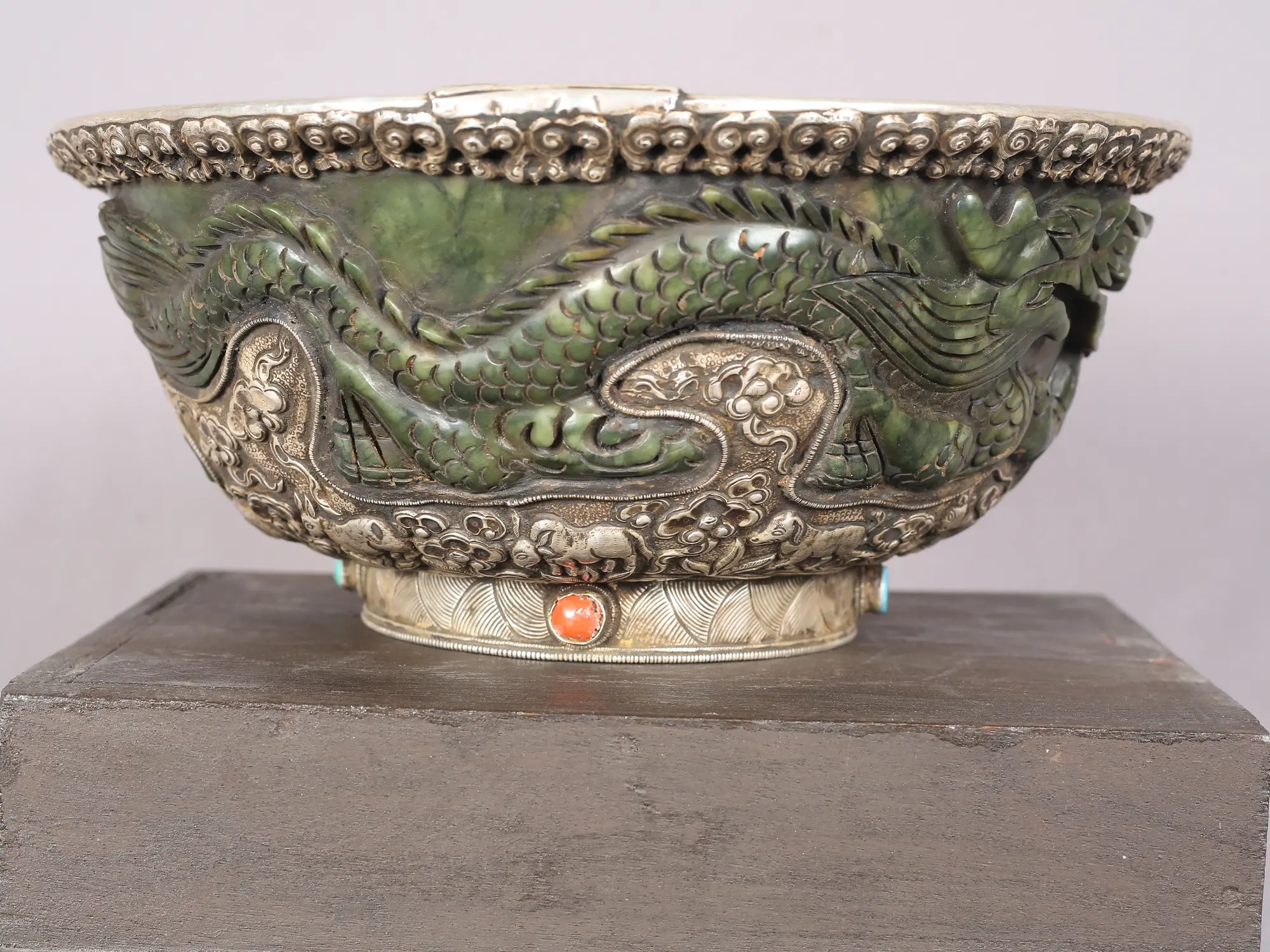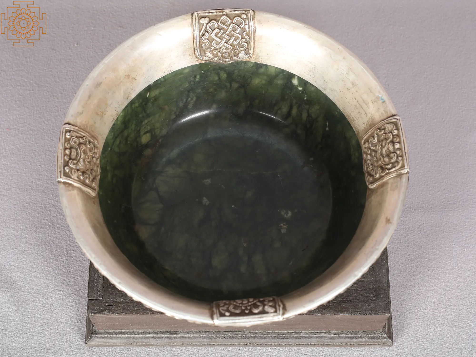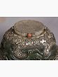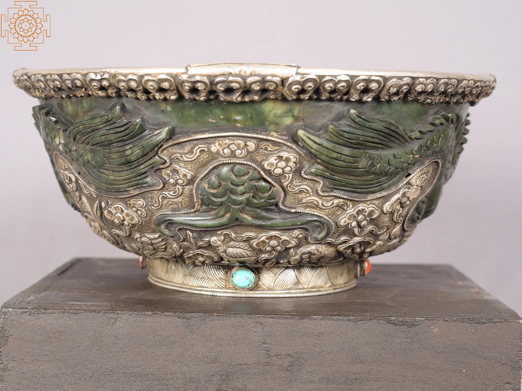 Emerging from the captivating landscapes of Nepal, this exquisite silver bowl stands as a remarkable embodiment of artistic and cultural resonance. Adorned lavishly across its surface, the silver bowl's features traverse its entirety, transcending the mere realm of materiality to become a profound vessel of significance. The upper rim of the bowl is adorned with a meticulously crafted symmetrical design depicting hearts, while the middle portion boasts intricate artwork portraying various animals. The base of the bowl is adorned with turquoise and red stones arranged in a captivating v-shaped pattern. Rooted in the tapestry of Hindu tradition, silver assumes a role as a symbol intertwined with the celestial domain of the moon, carrying the inherent ability to cleanse and elevate one's consciousness.
