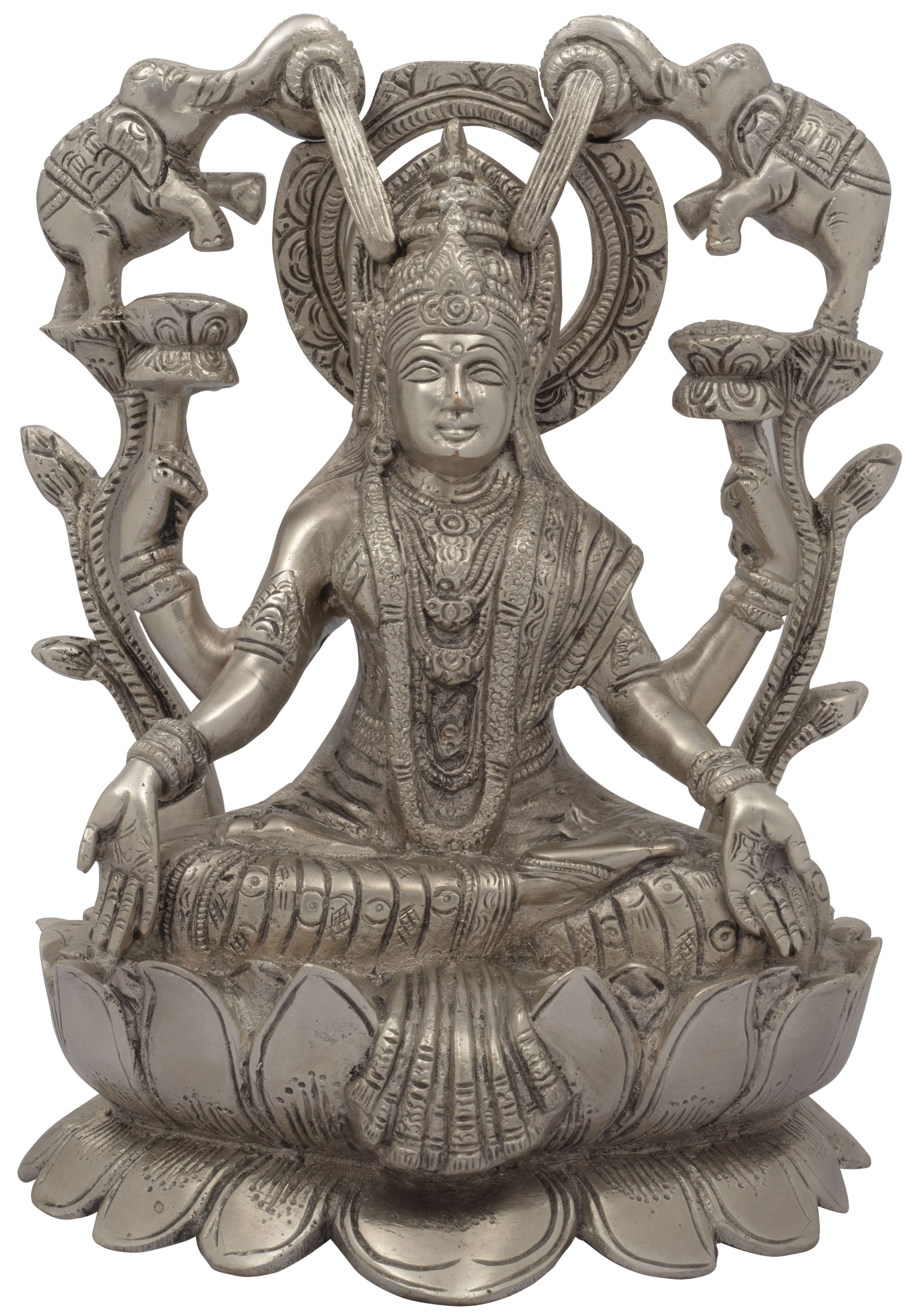This exquisite Gaja-Lakshmi brass sculpture, meticulously handcrafted in India, is a powerful representation of wealth, fortune, and well-being. Gaja-Lakshmi, a revered form of the Hindu goddess Lakshmi, is depicted seated serenely on a blooming lotus, a symbol of purity, beauty, and spiritual enlightenment. The goddess is adorned with intricate jewelry, her form radiating grace and divine benevolence. Her four arms, a common iconographic feature, symbolize her multifaceted nature and her ability to bestow manifold blessings upon her devotees. In one hand, she often holds a lotus, signifying spiritual power, while another may be in the abhaya mudra, offering protection and dispelling fear. ––––––––––
