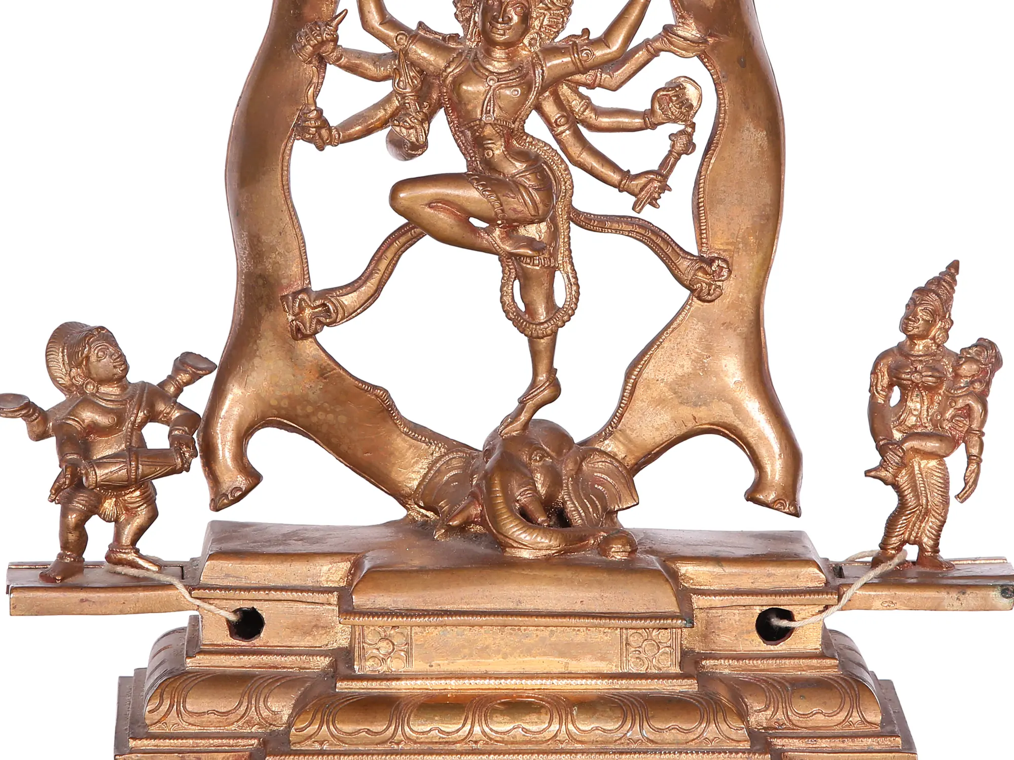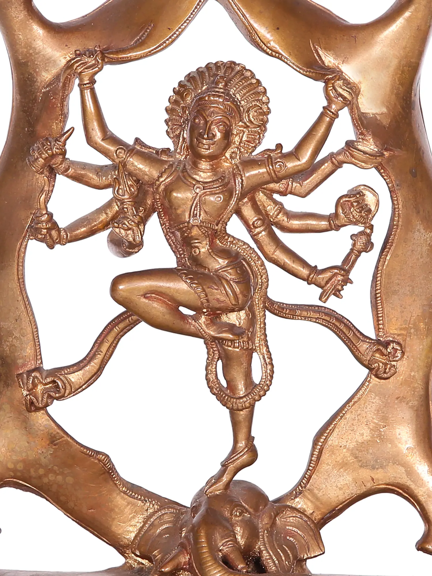 With his hands digging into the elephant's skin, Shiva holds its body, while balancing his form rather gracefully on the head of the demon. His left leg is arrested in the air, and swaying garments and garland suggest an atmosphere of motion. His celestial form is adorned by the crescent moon in his hair, earrings, Yajnopavita, Baaghacharma (tiger hide) dhoti, anklets, and armlets.