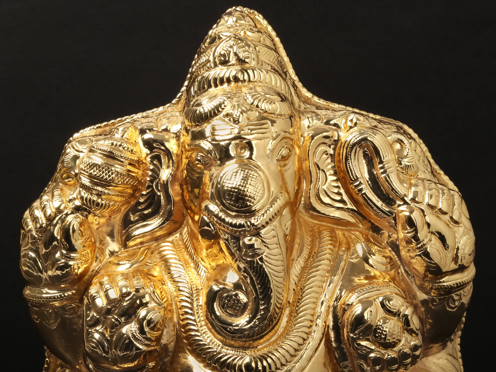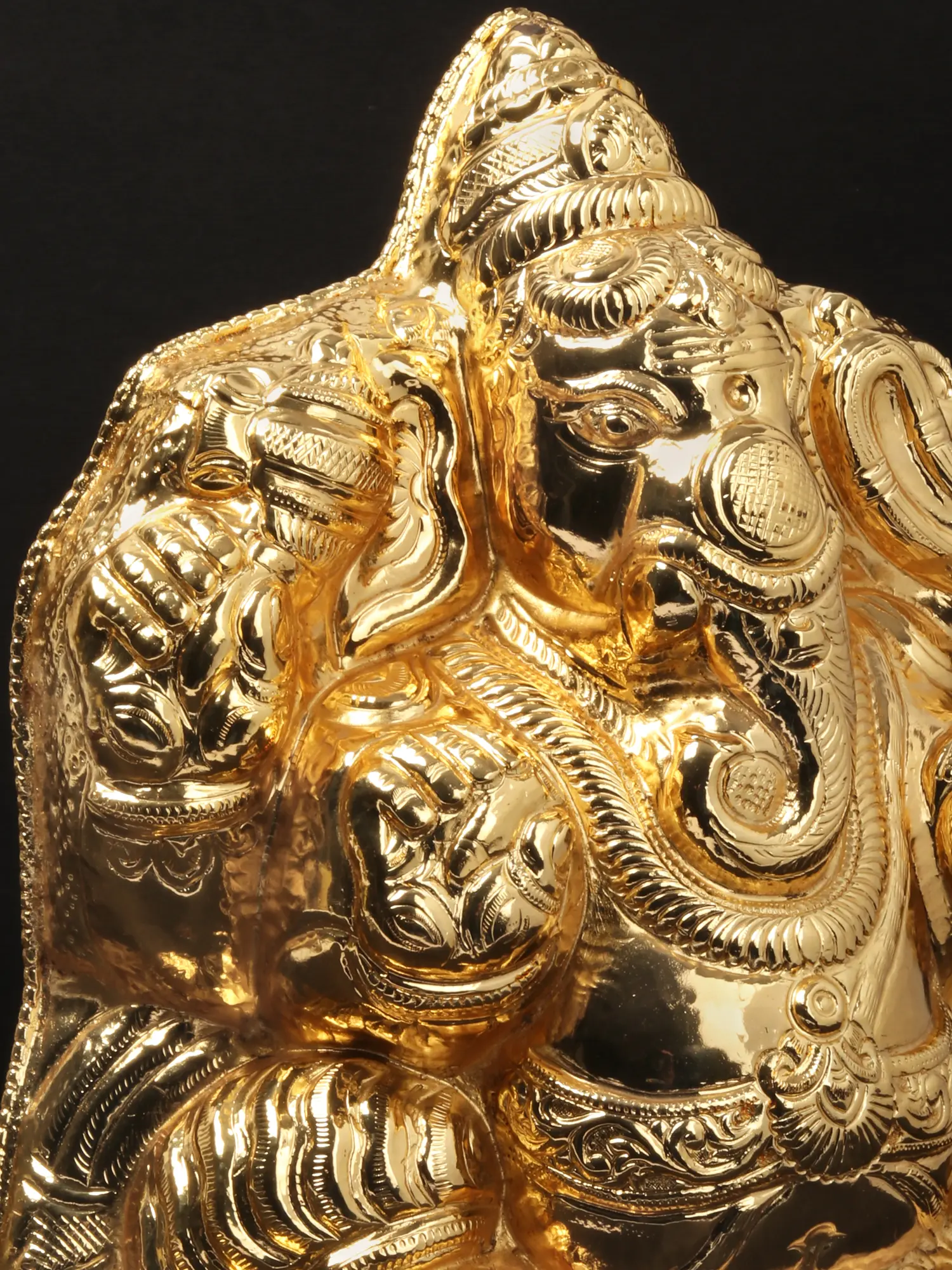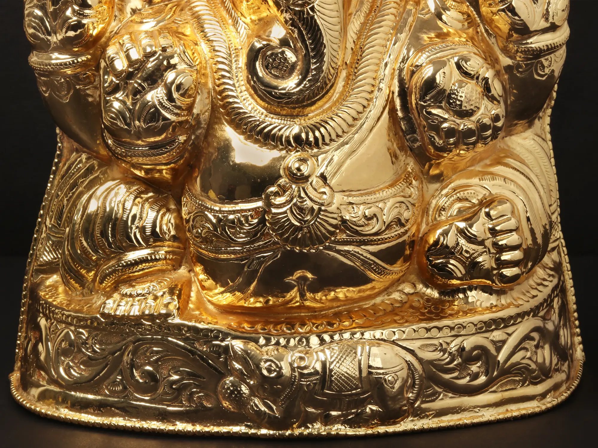 The entire surface of this brass idol is adorned with intricate carvings, showcasing the skill of the artisan. From the elaborate crown gracing Ganesha's head to the ornate designs on his robes and the base, every element speaks of traditional craftsmanship and devotion. The lustrous brass lends a radiant glow, enhancing the divine beauty of the deity. In Hindu mythology, brass is considered a sacred metal, often used in religious artifacts and rituals, believed to possess purifying properties and to attract positive energies. This pratima is not merely an object of art; it is a conduit for spiritual connection and a symbol of auspicious beginnings, embodying the rich cultural heritage of South India. ––––––––––––––––––––