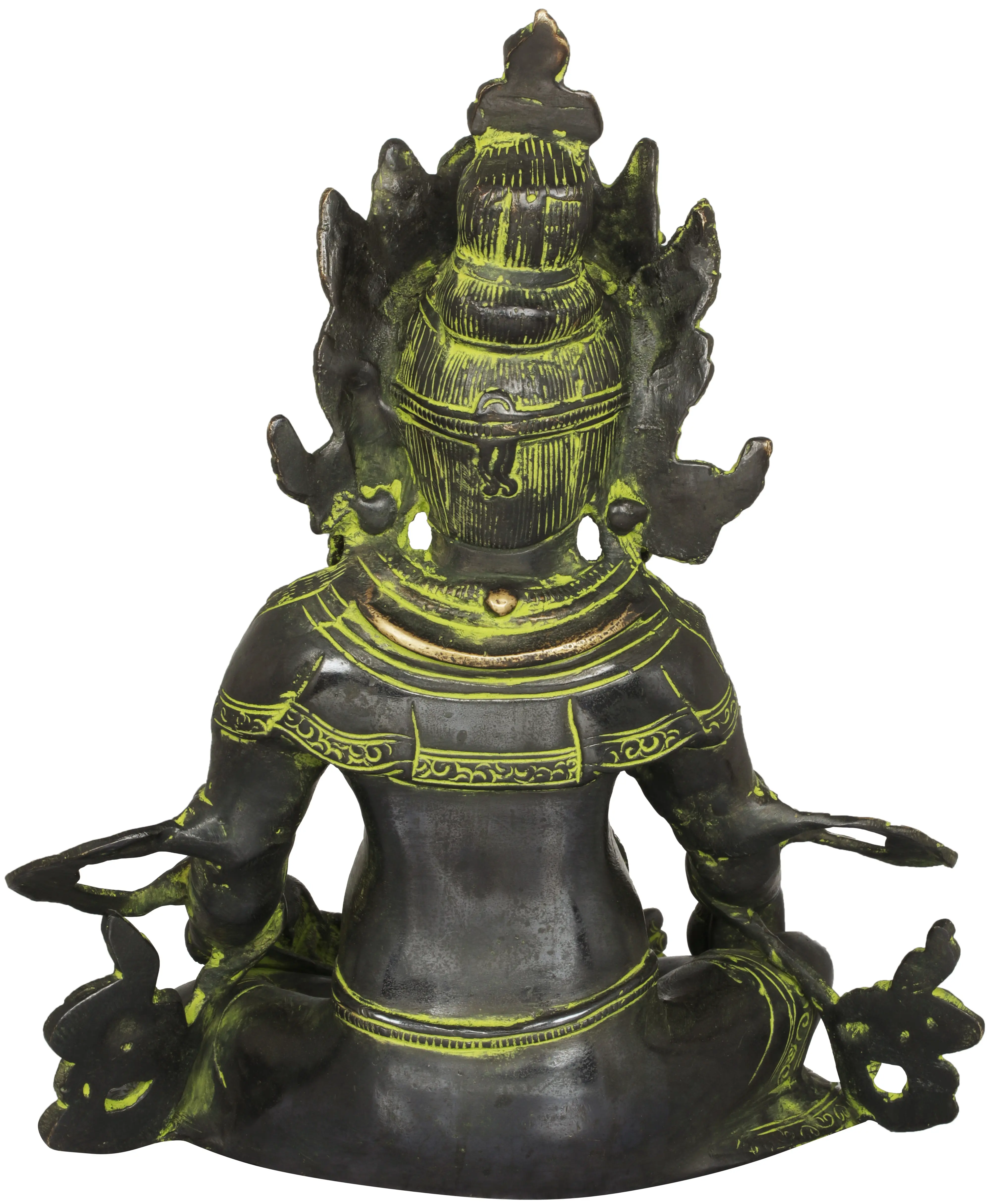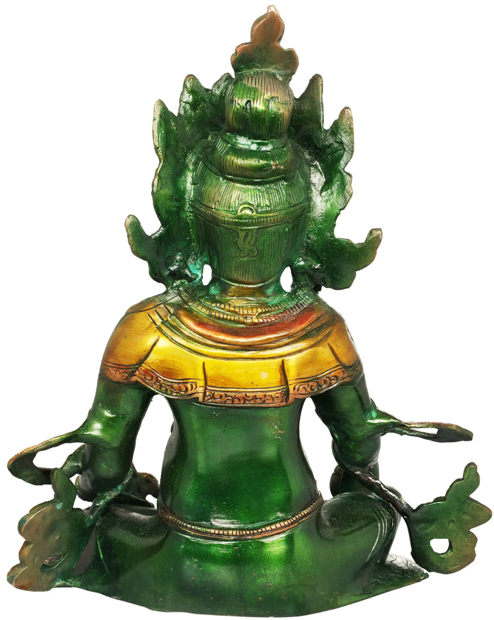 Each detail of this statue is a testament to the skill and dedication of Indian artisans. The use of brass, a metal known for its durability and ability to hold intricate designs, allows for a level of detail that brings the divine figure to life. The skillful application of the green patina, enhanced by touches of warm copper and gold, creates a visual depth and richness that is both striking and aesthetically pleasing. This handmade creation carries the spirit of traditional craftsmanship, infusing the piece with a unique soul and character. Displaying this statue in your home or office is an invitation for prosperity and a celebration of divine abundance, meticulously brought to you from the heart of India.