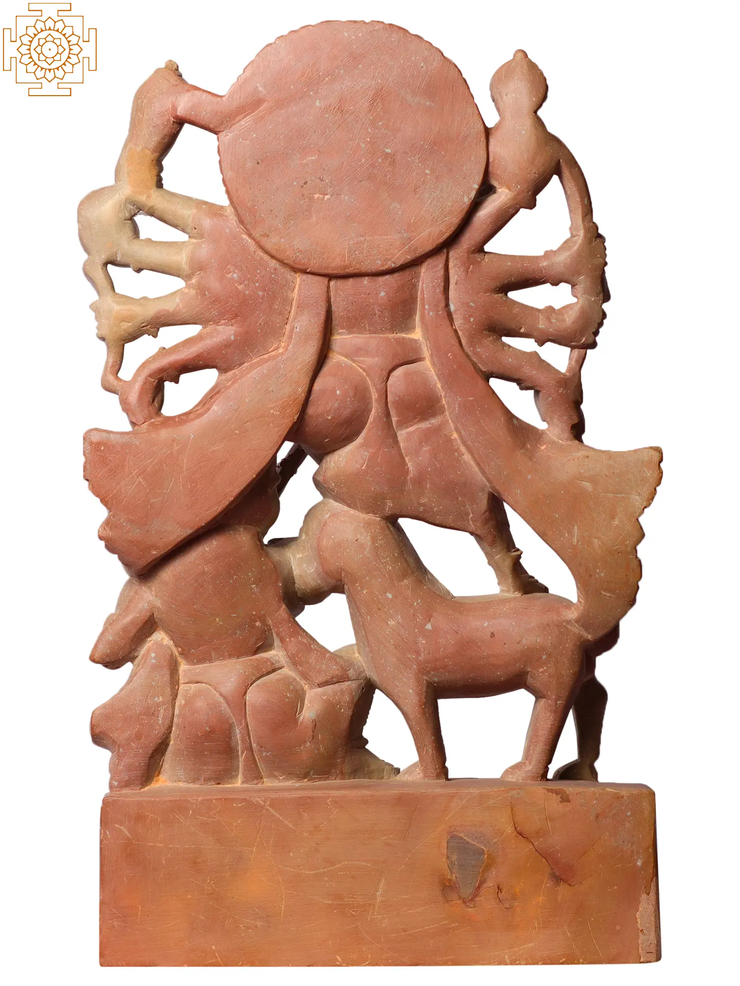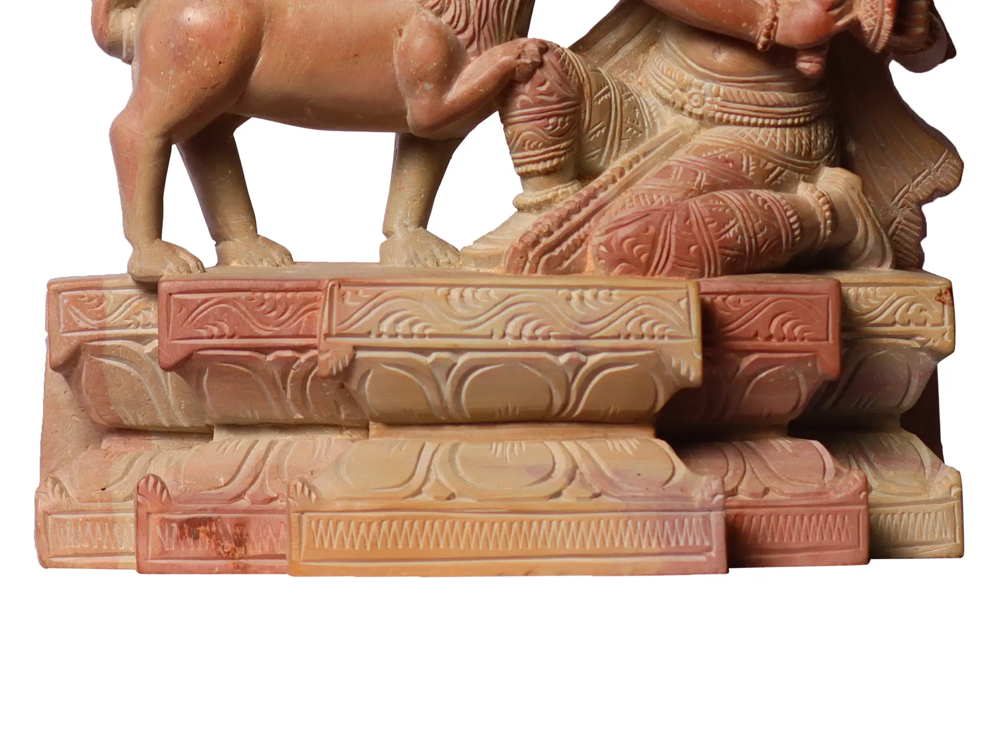 The Goddess Durga is a powerful pink stone statue that embodies the fierce and protective aspect of the divine mother. Goddess Durga, with her ten arms wielding sacred weapons, stands victoriously over a defeated demon. Her expression reflects her fearlessness and determination to protect her devotees from evil. This sculpture inspires us to confront our fears and challenges with courage and resilience. It symbolizes the triumph of good over evil, urging us to embrace our own inner strength and divine potential to overcome any obstacle in life.