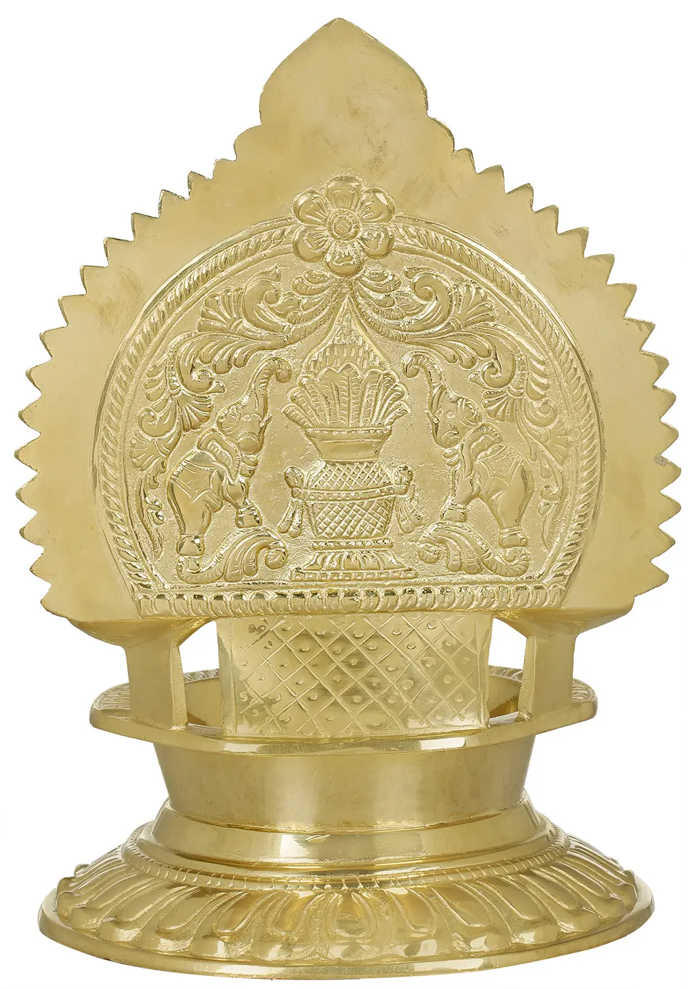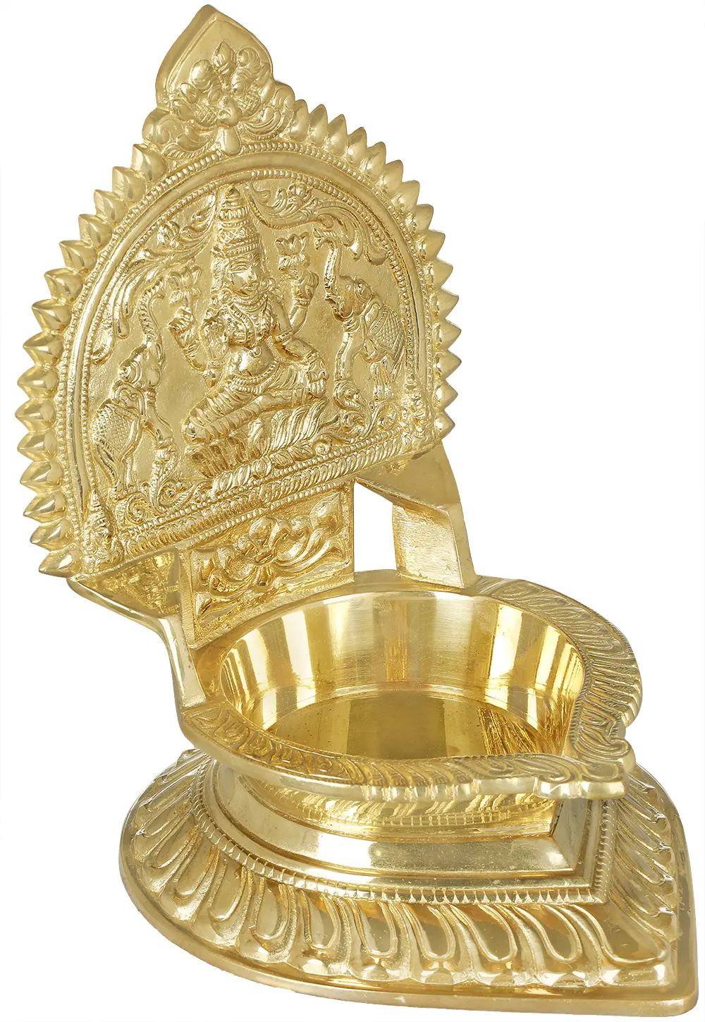 The "Goddess Gajalakshmi Seated on Lotus" is a meticulously crafted brass sculpture from India, showcasing divine grace and prosperity. Handmade with intricate detailing, it portrays the goddess Gajalakshmi, an embodiment of wealth and auspiciousness, seated gracefully on a lotus. The sculpture doubles as a large oil lamp, fusing artistic beauty with functional elegance. Representing traditional Indian craftsmanship, this piece is a testament to cultural heritage and reverence. Its skillful design and meaningful symbolism make it a captivating addition to any space, radiating the blessings of prosperity and spirituality while honoring India's artistic traditions.