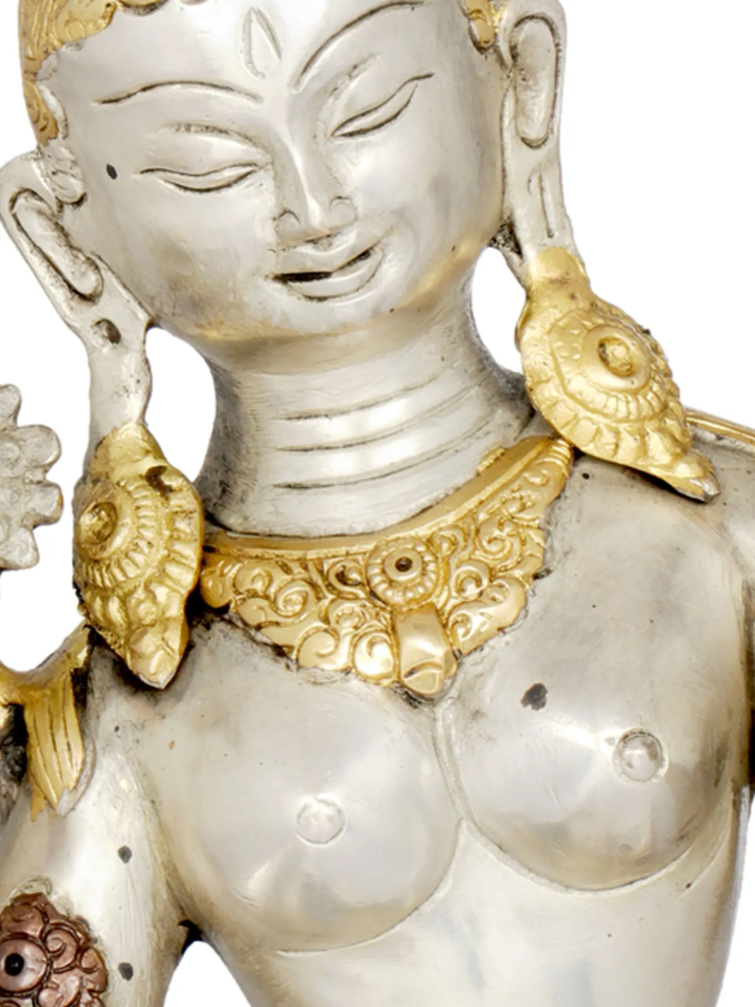 Tara is an important and revered deity in Tibetan Buddhism who appears as a female Bodhisattva. Buddhist monks and followers meditate on the image or deity of Tara to develop some good qualities such as compassion and kindness. Tara is known as the mother of compassion or liberation and is considered the female aspect of Avalokiteshvara (who possesses the compassion of all Buddhas). She manifests in different forms such as Green Tara and White Tara. Green Tara is associated with fearlessness and White Tara, as radiant as the moon, is associated with good health. Tara also appears in red, blue, and yellow colors.
