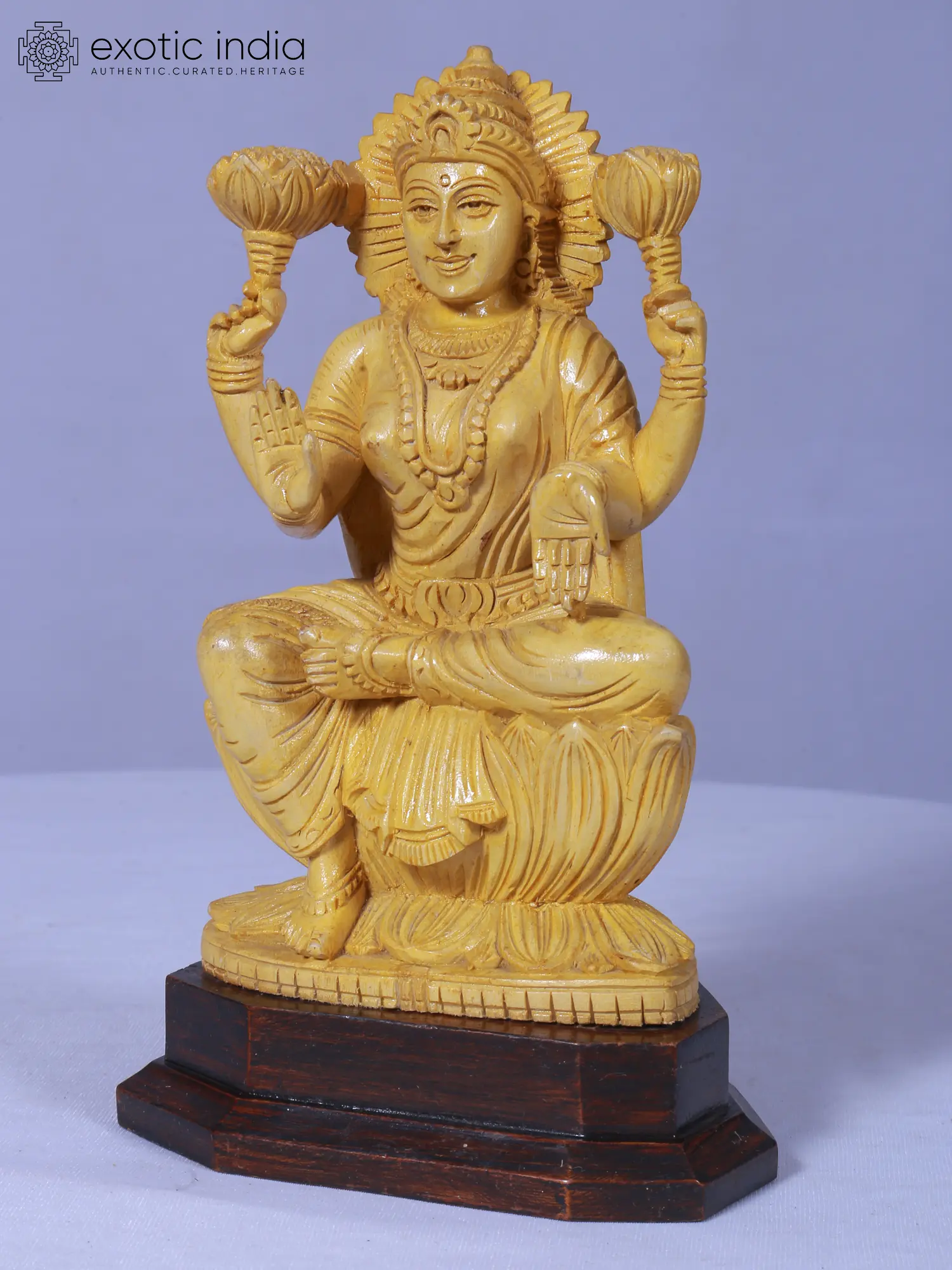 Invoking the blessings of prosperity and good fortune, this exquisite hand-carved wooden statue captures the serene and benevolent visage of Goddess Lakshmi. As the divine consort of Lord Vishnu and the embodiment of wealth, beauty, and auspiciousness, Lakshmi is revered throughout Hindu tradition as the ultimate bestower of material and spiritual abundance. Her presence is believed to usher in harmony, success, and well-being for all who seek her grace. Crafted from fine wood, this sculpture is a testament to the skill and dedication of traditional artisans. Each detail, from the gentle curve of her smile to the intricate folds of her attire, is meticulously rendered, imbuing the statue with a lifelike quality and spiritual depth. The warm, natural tones of the wood lend an earthy elegance, making it a captivating addition to any home or sacred space. Seated gracefully upon a lotus, a symbol of purity, beauty, and spiritual awakening, Lakshmi holds aloft lotuses in two of her four hands, signifying her power to nurture and bring forth abundance. Her other hands are in the Abhaya Mudra (fear-allaying gesture) and the Varada Mudra (boon-bestowing gesture), offering protection and the promise of fulfillment. ––––––––––––––––––––