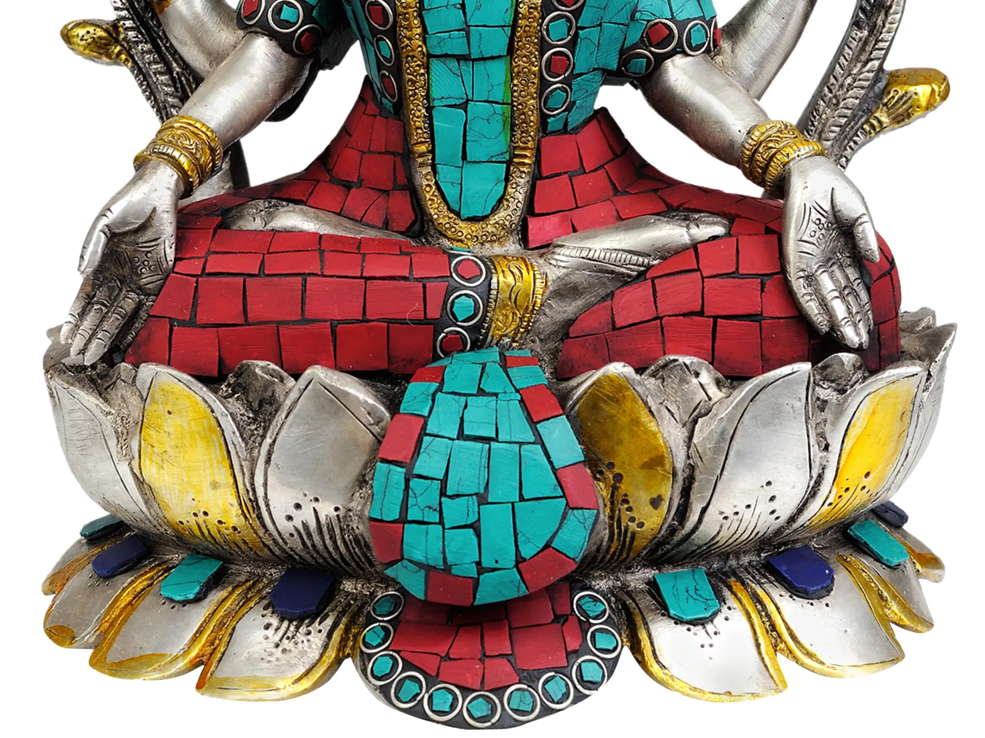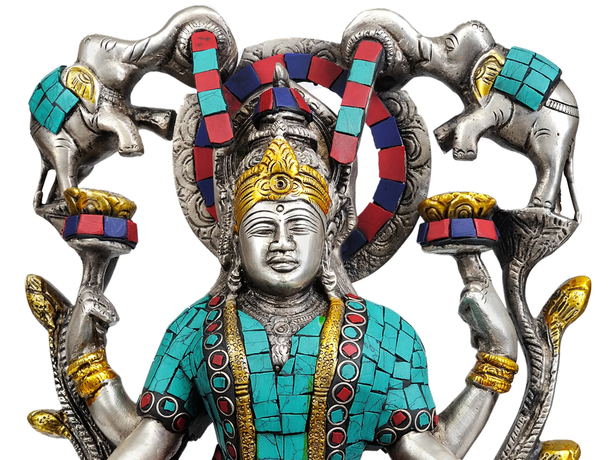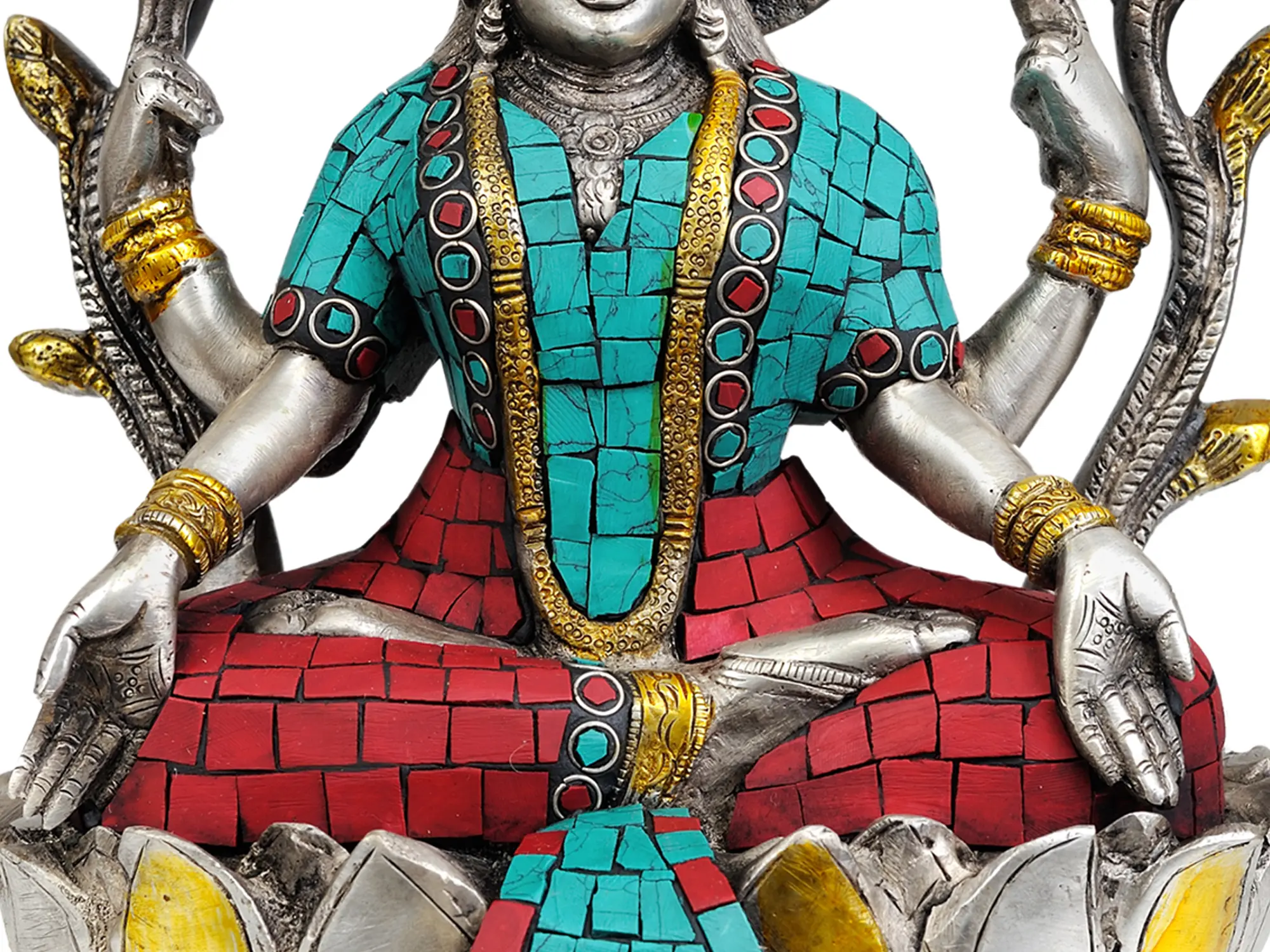 This exquisite brass statue presents a captivating vision of Lakshmi, the Hindu goddess of wealth, fortune, love, and prosperity. Crafted with meticulous detail and adorned with vibrant inlay work, this representation of the divine mother embodies the abundance and blessings she bestows upon her devotees. Seated gracefully on a lotus, the symbol of purity and enlightenment, Lakshmi radiates serenity and grace. Her multiple arms signify her ability to fulfill the desires of those who seek her blessings. The artistry captures the essence of the goddess, offering a focal point for devotion and a reminder of the potential for prosperity in all aspects of life.
