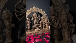 This exquisite 10-inch brass statue depicts Goddess Mahishasura Mardini, a powerful symbol of the victory of good over evil in Hindu mythology. The statue, crafted using the ancient Dhokra art technique, showcases the goddess in all her glory, poised to vanquish the demon Mahishasura. The intricate details and rich golden hue of the brass bring the mythological narrative to life. Mahishasura, a shape-shifting demon, terrorized the gods and humankind until the Goddess Durga, in her Mahishasura Mardini form, emerged to combat him. This iconic battle is a powerful representation of the continuous fight against injustice and tyranny. The goddess’s multiple arms wield various weapons, symbolizing her comprehensive power and ability to overcome any adversary. Her fierce yet graceful stance captures the essence of her divine strength and unwavering determination.