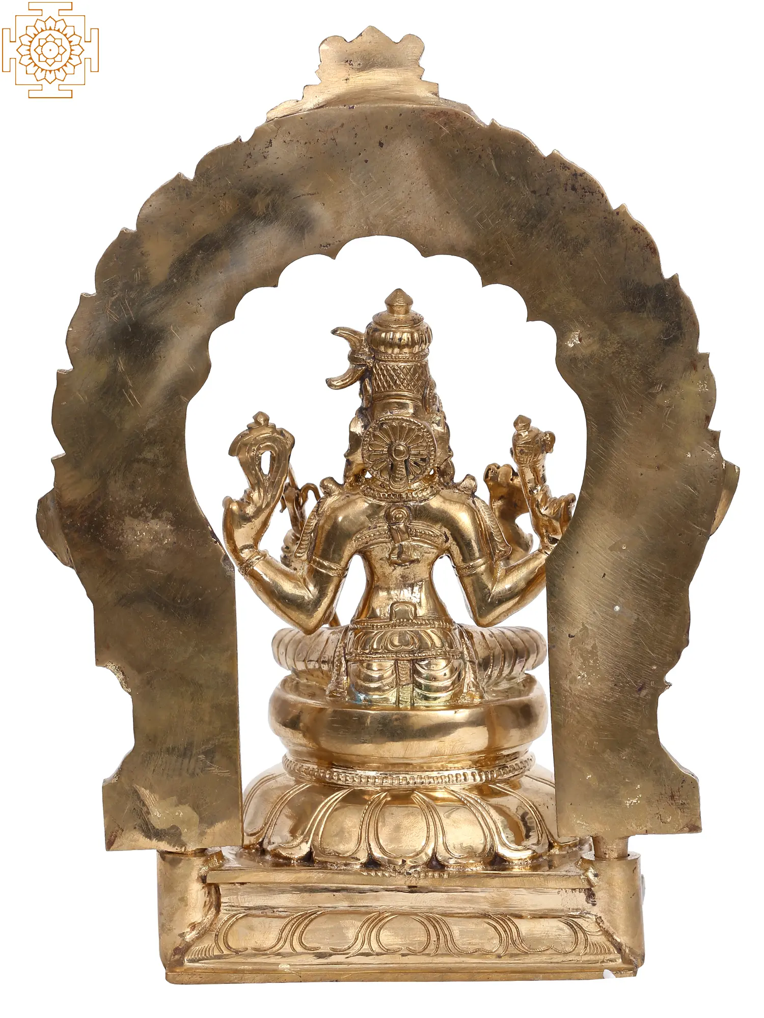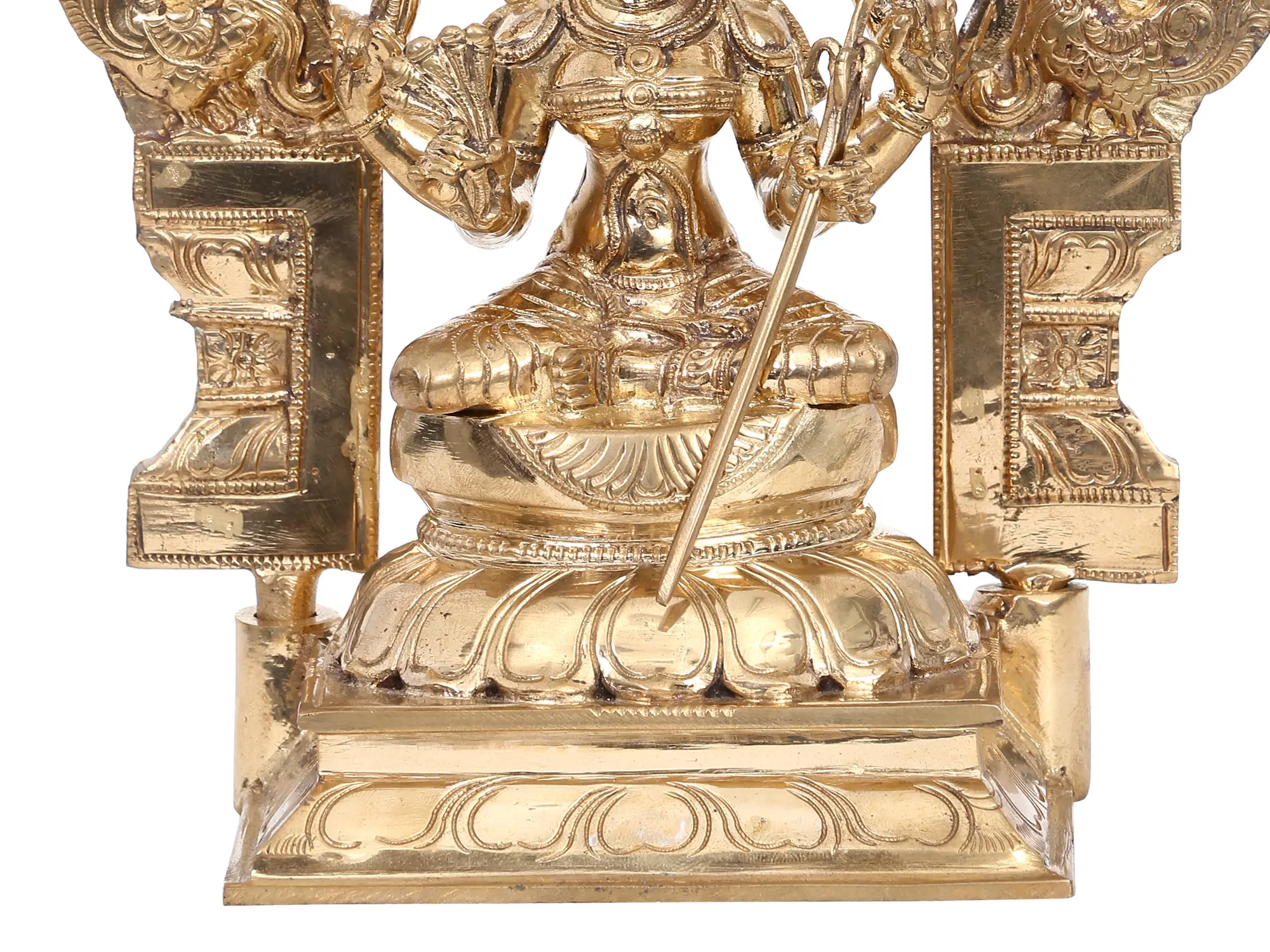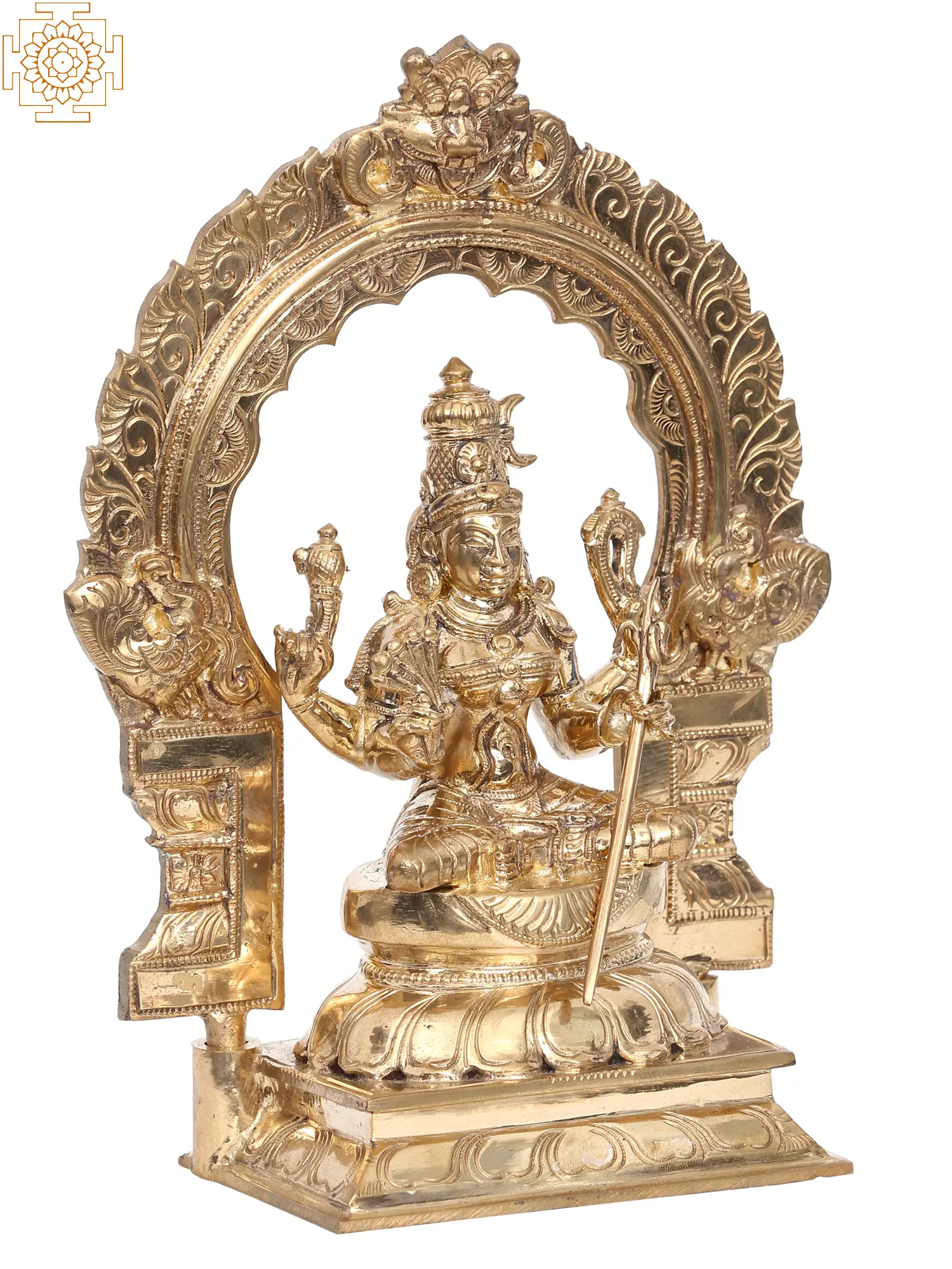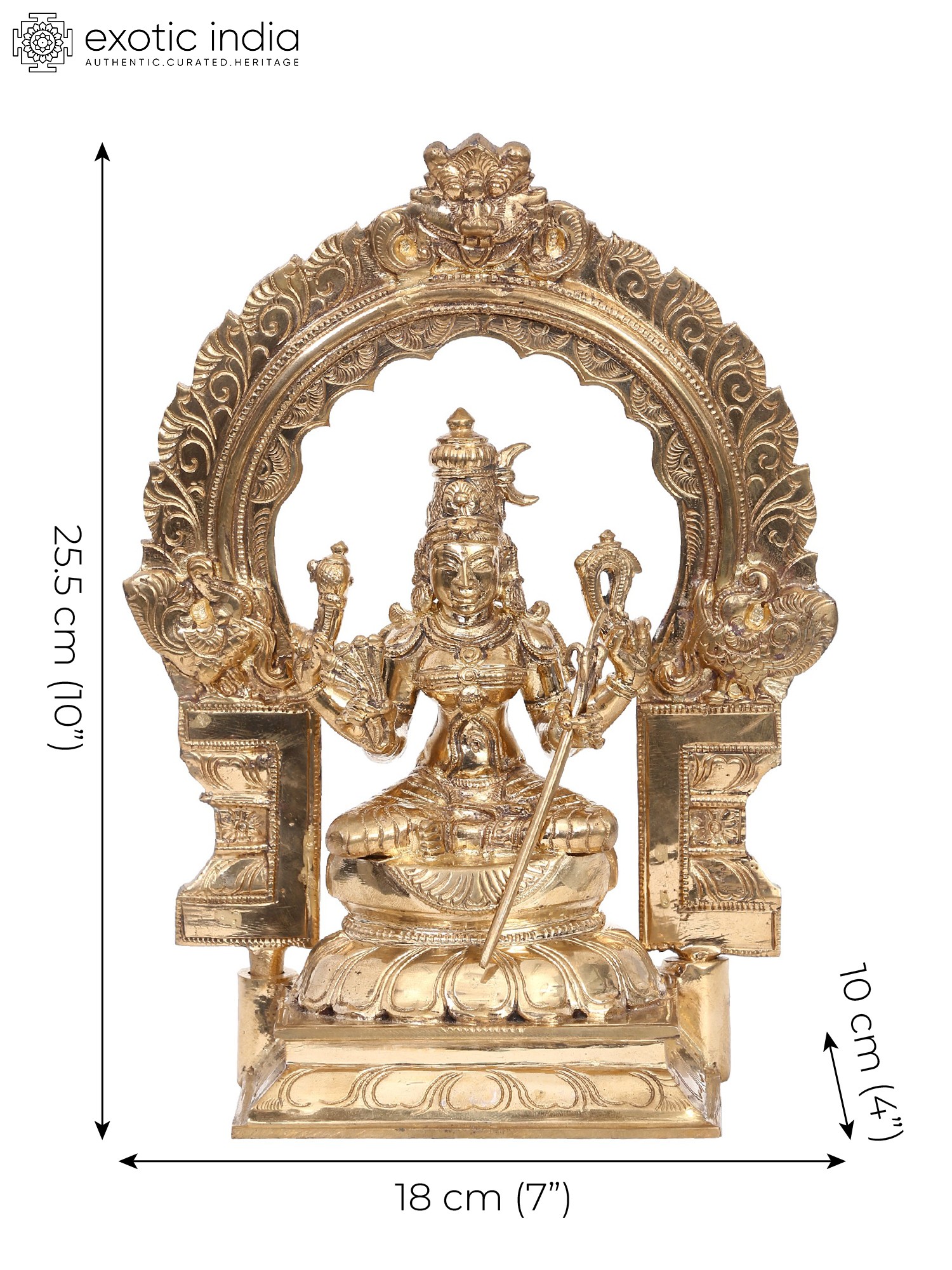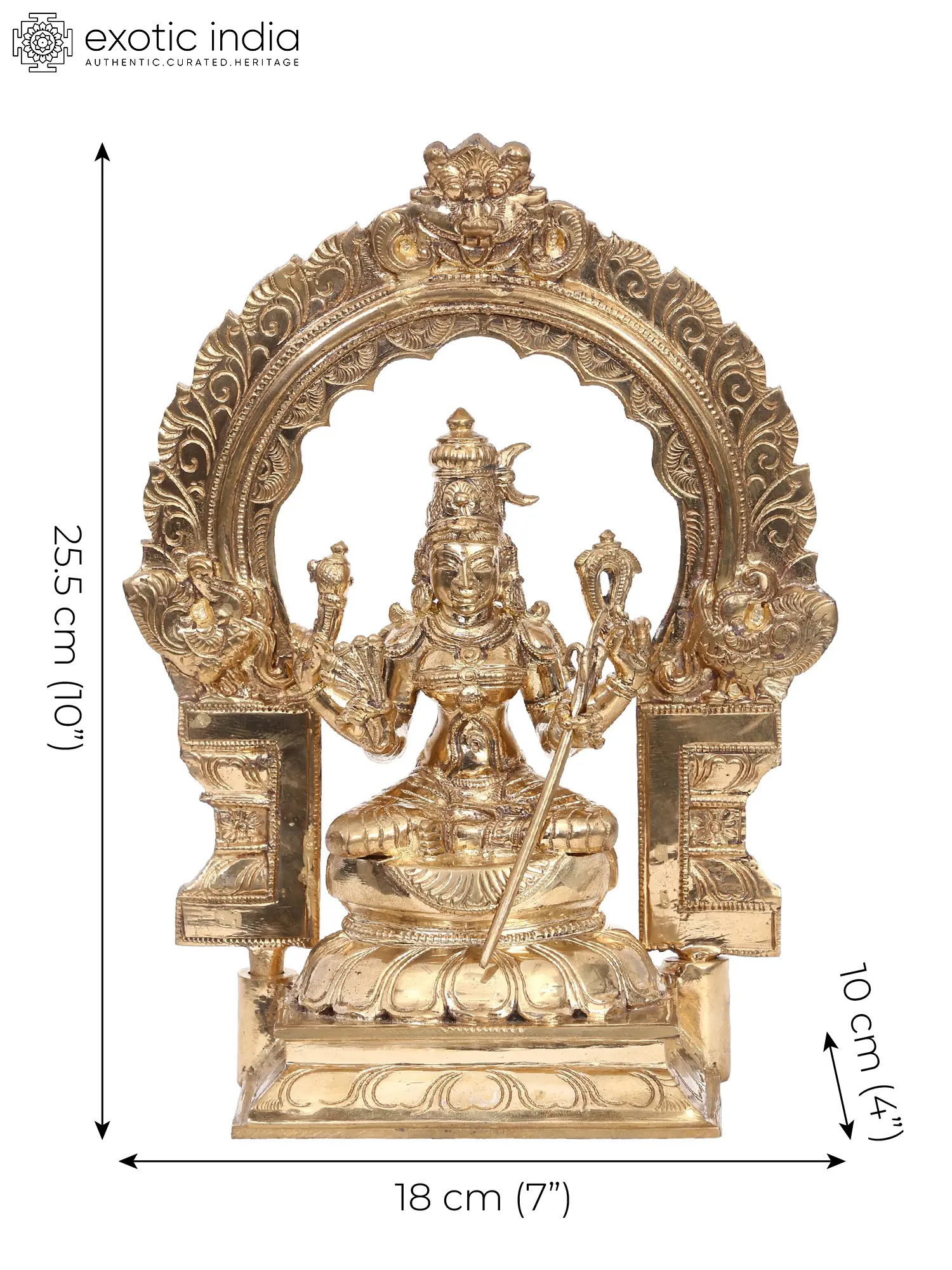Goddess Rajarajeshwari, “also known as Tirupra Sundari”, the enchanting embodiment of divine grace, sits serenely upon the Kirtimukha throne in lalitasana, an epitome of celestial elegance. Her upper hands wield “a goad and a noose”, symbols of control over desires and liberation, while delicate flowers rest in her right hand, radiating beauty. In her left hand, a sugarcane bow signifies the sweet pursuit of spiritual growth. Adorned in regal attire, Rajarajeshwari personifies the harmonious blend of power and beauty. Crafted using the ancient “Madhuchista Vidhana (Lost-Wax) technique”, this bronze statue signifies her role as Tripura Sundari, the goddess of the three worlds, captivating all with her divine charm and guiding seekers towards inner bliss.