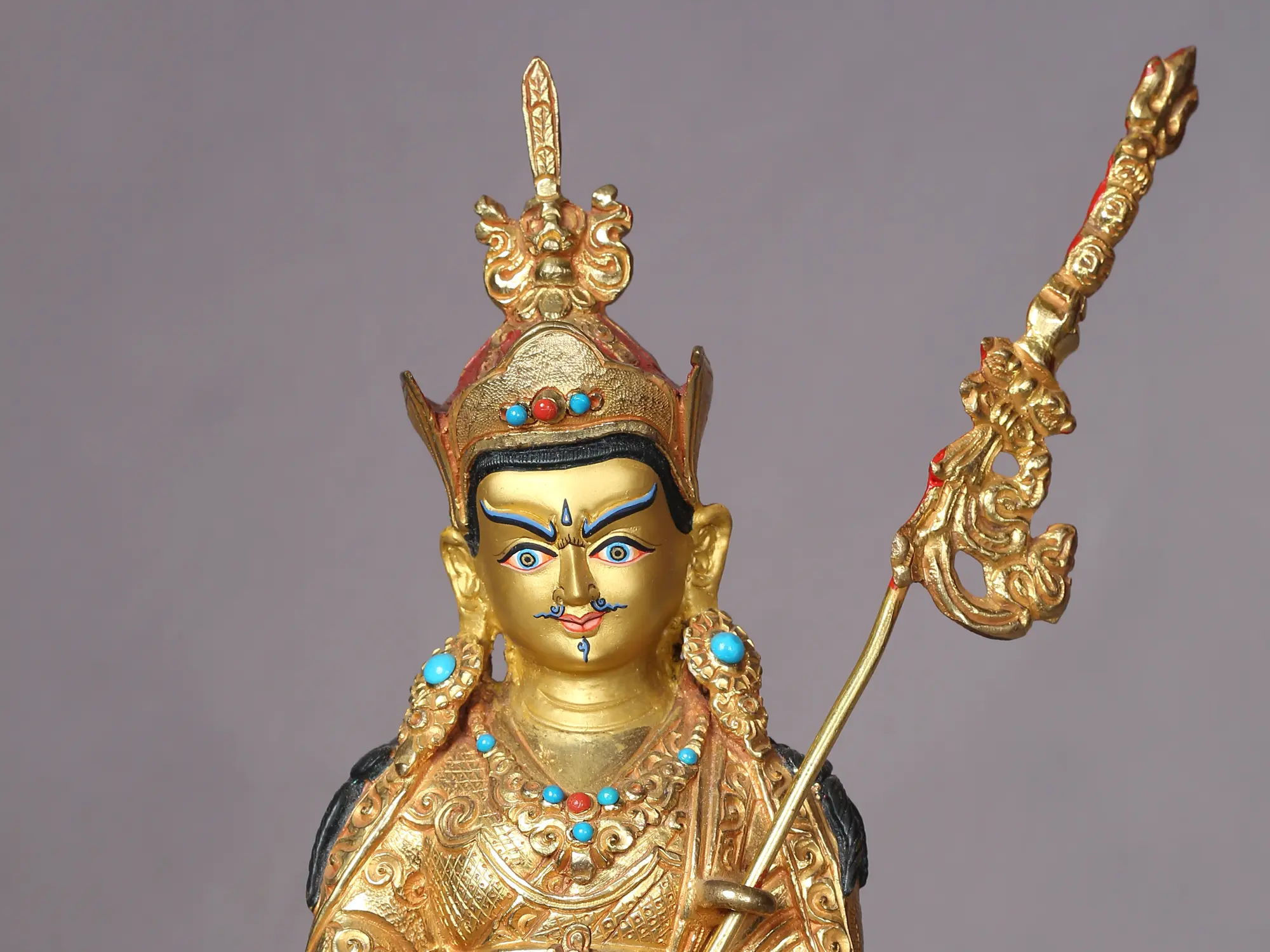 In this statue from Nepal, Padmasambhava, who is born from the Padma (lotus), is portrayed in a magnificent attitude, with frowning brows, huge eyes, and a compassionate countenance. His headgear's frills, ear flaps, and staff decorations are swaying to add movement to his stillness. The statue is constructed with remarkable artistic skill, with lines that are precisely etched and painted. The jewel-encrusted robes of the Guru were given to him to keep him warm when he traveled over mountainous territory to spread the Dhamma's teachings.
