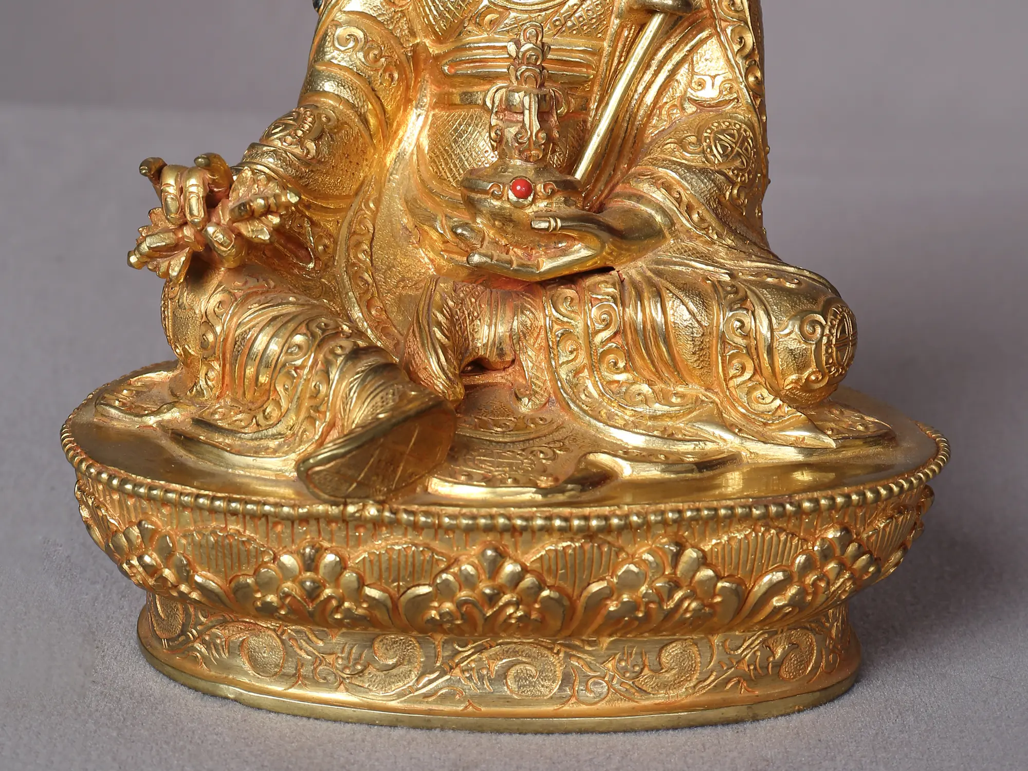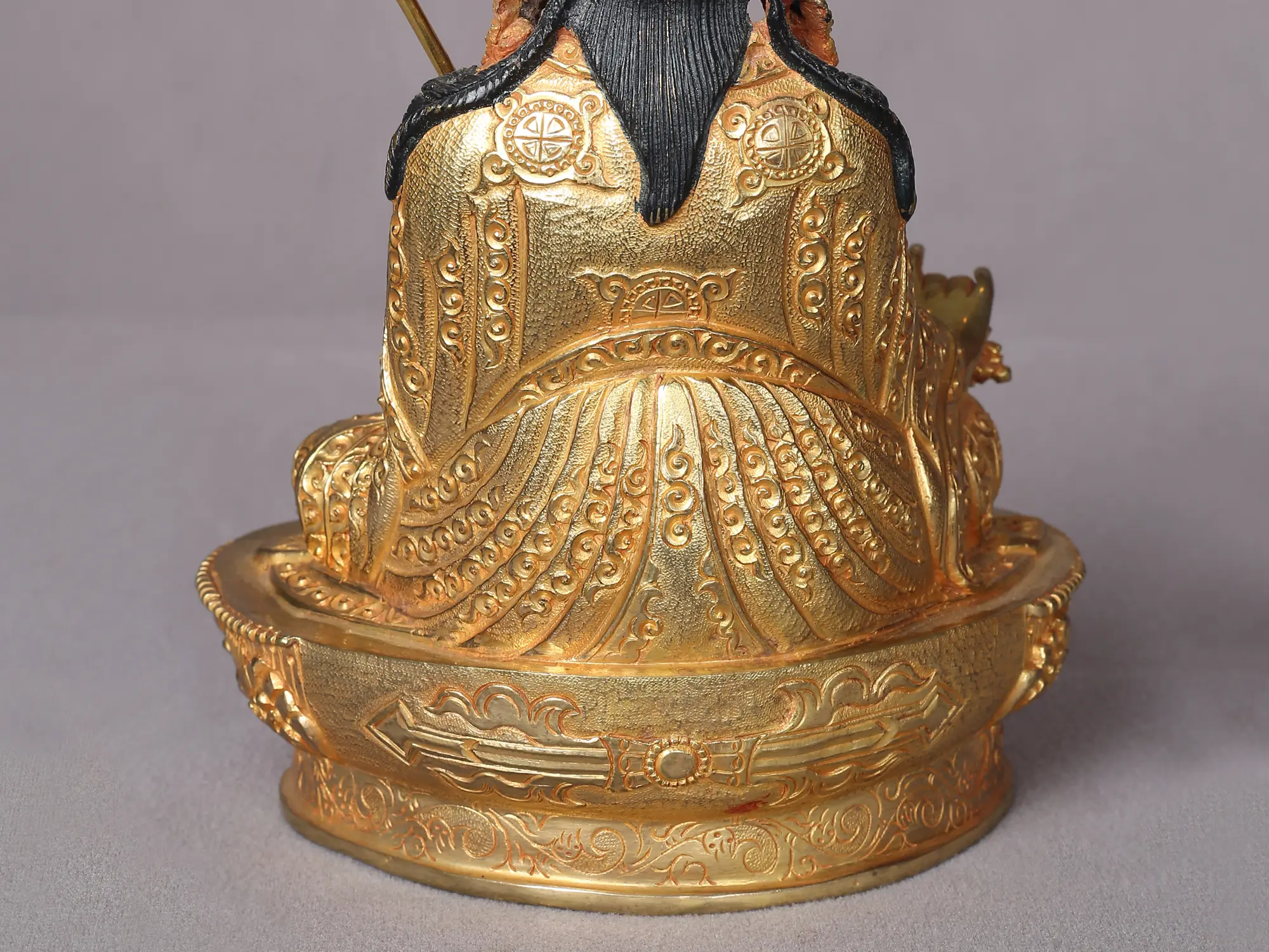 The process of creating such a sacred image is steeped in tradition and spiritual intent. The selection of copper as the base material, a metal associated with purification and beauty, is significant. The subsequent gilding with gold signifies the divine nature of Guru Padmasambhava and the illumination of wisdom. Each detail, from the gentle curve of his smile to the precise rendering of his robes, reflects the artisan's deep respect and devotion to the Dharma. This statue is a tangible expression of centuries of artistic heritage and profound spiritual understanding, making it a cherished addition to any collection seeking to honor the path to enlightenment.