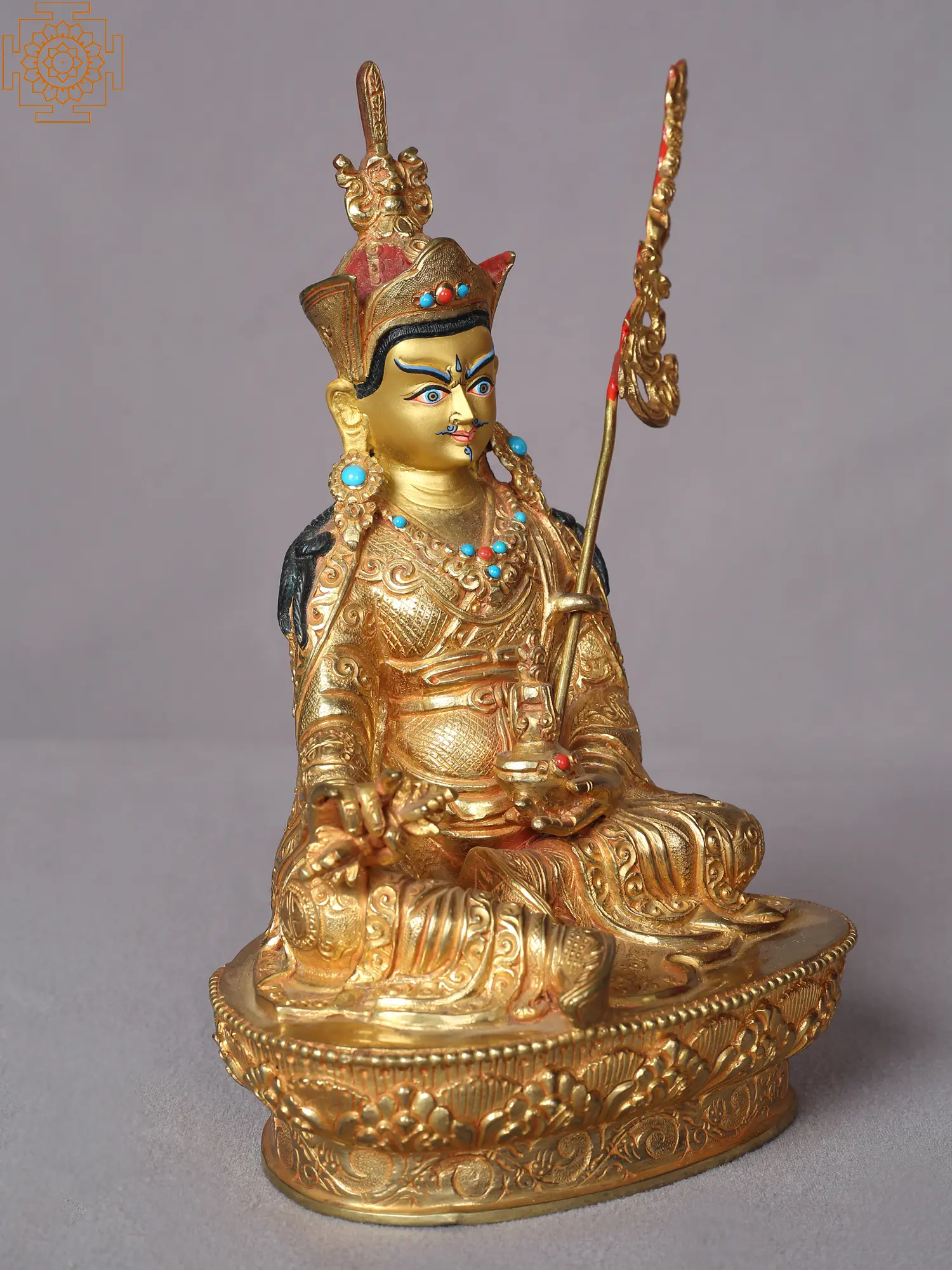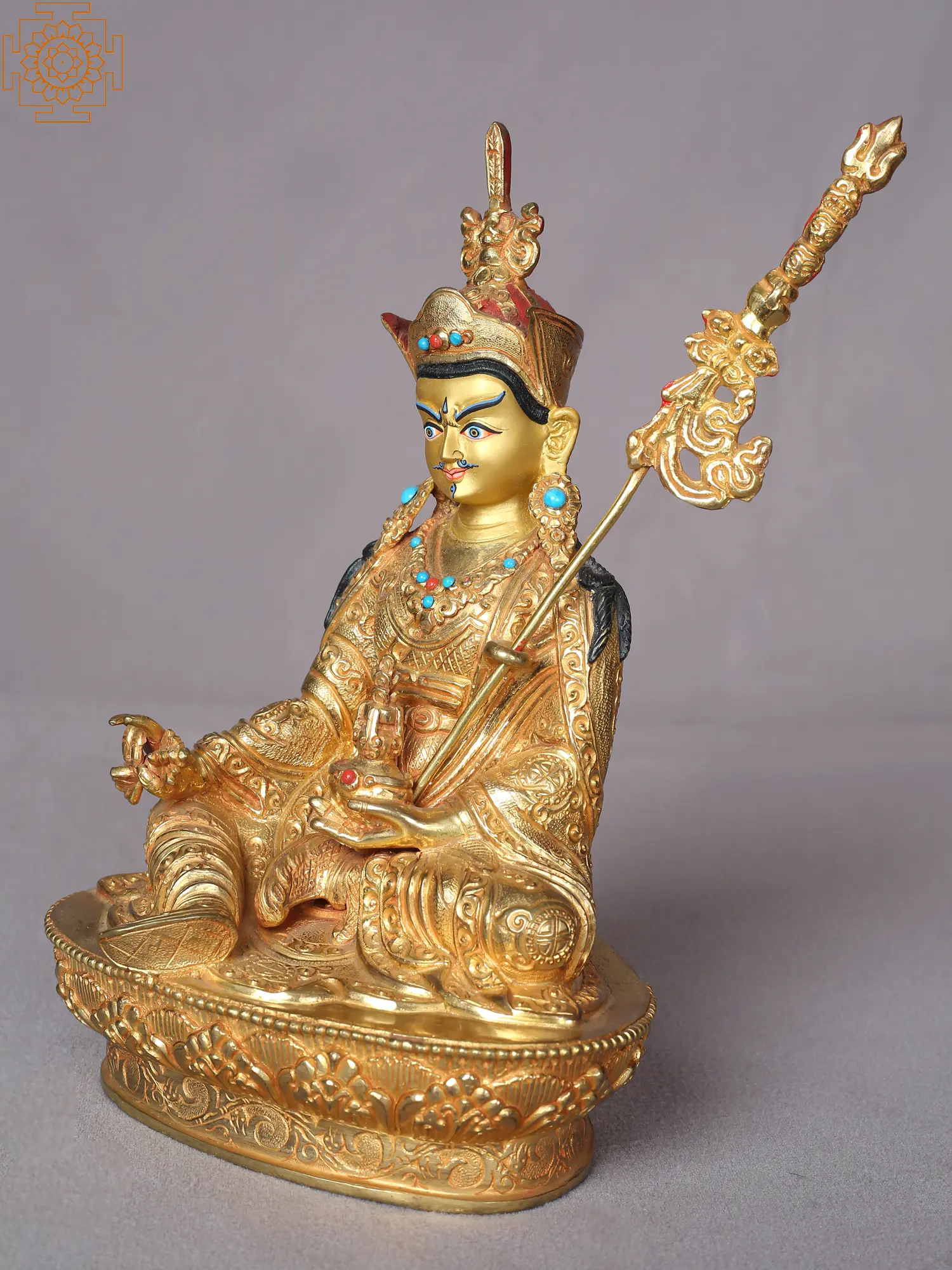 This exquisite statue captures the benevolent presence of Guru Padmasambhava, also known as the Precious Guru, a pivotal figure in Tibetan Buddhism. Crafted with meticulous detail, this representation is a testament to the enduring artistry and spiritual devotion of Nepalese artisans. The radiant gleam of the copper, expertly gilded with pure gold, imbues the deity with an aura of divine majesty and timeless wisdom.