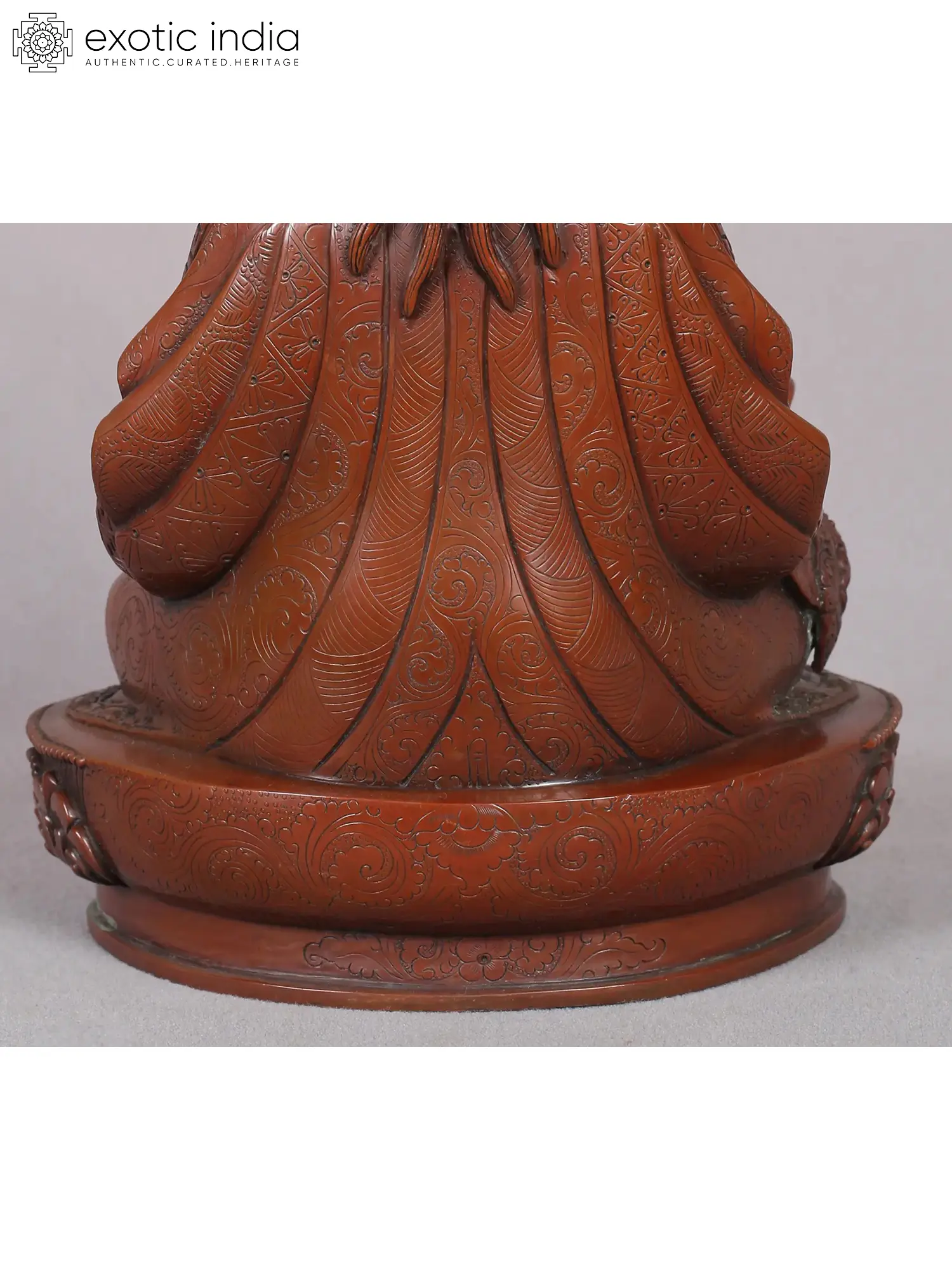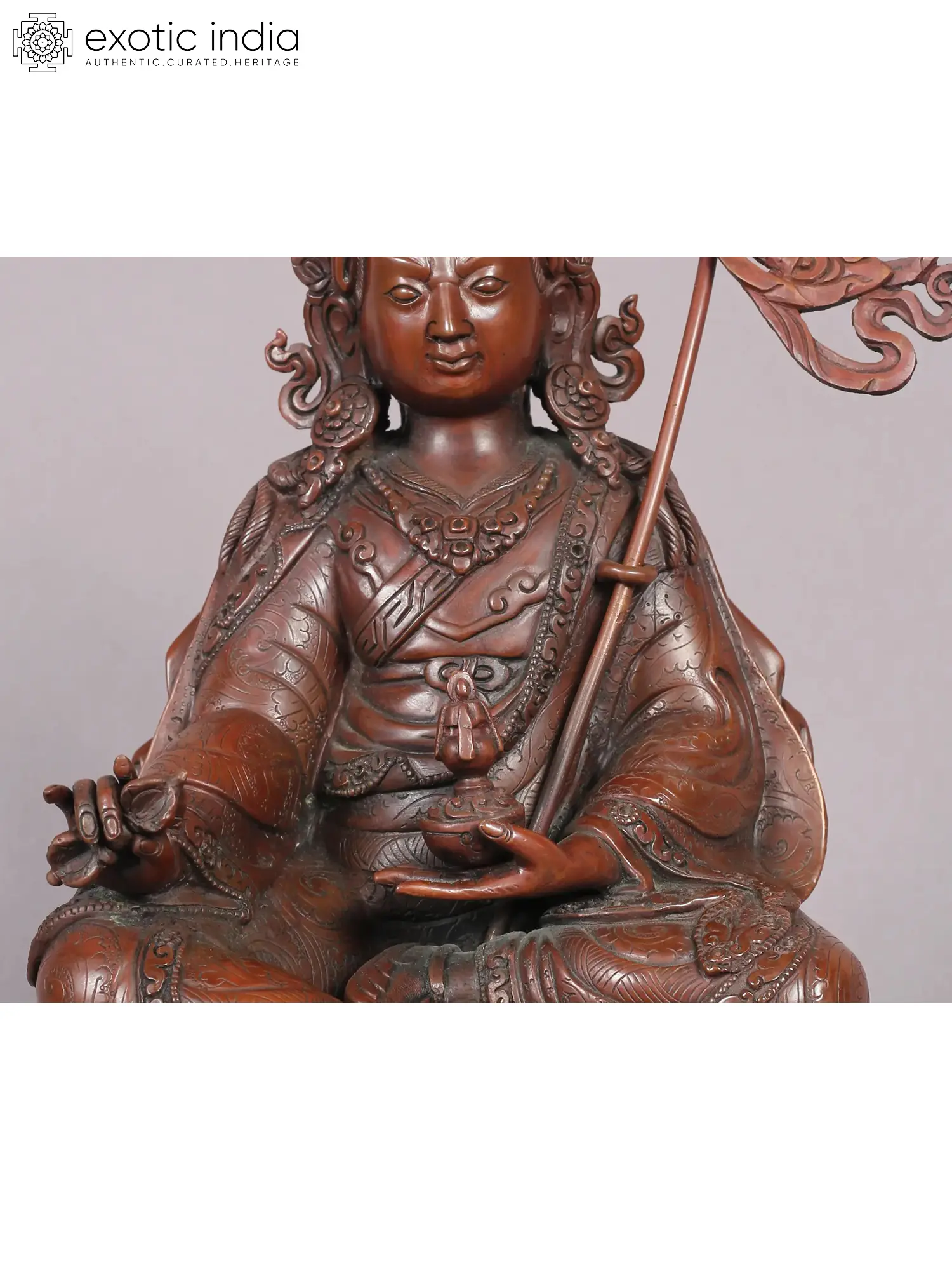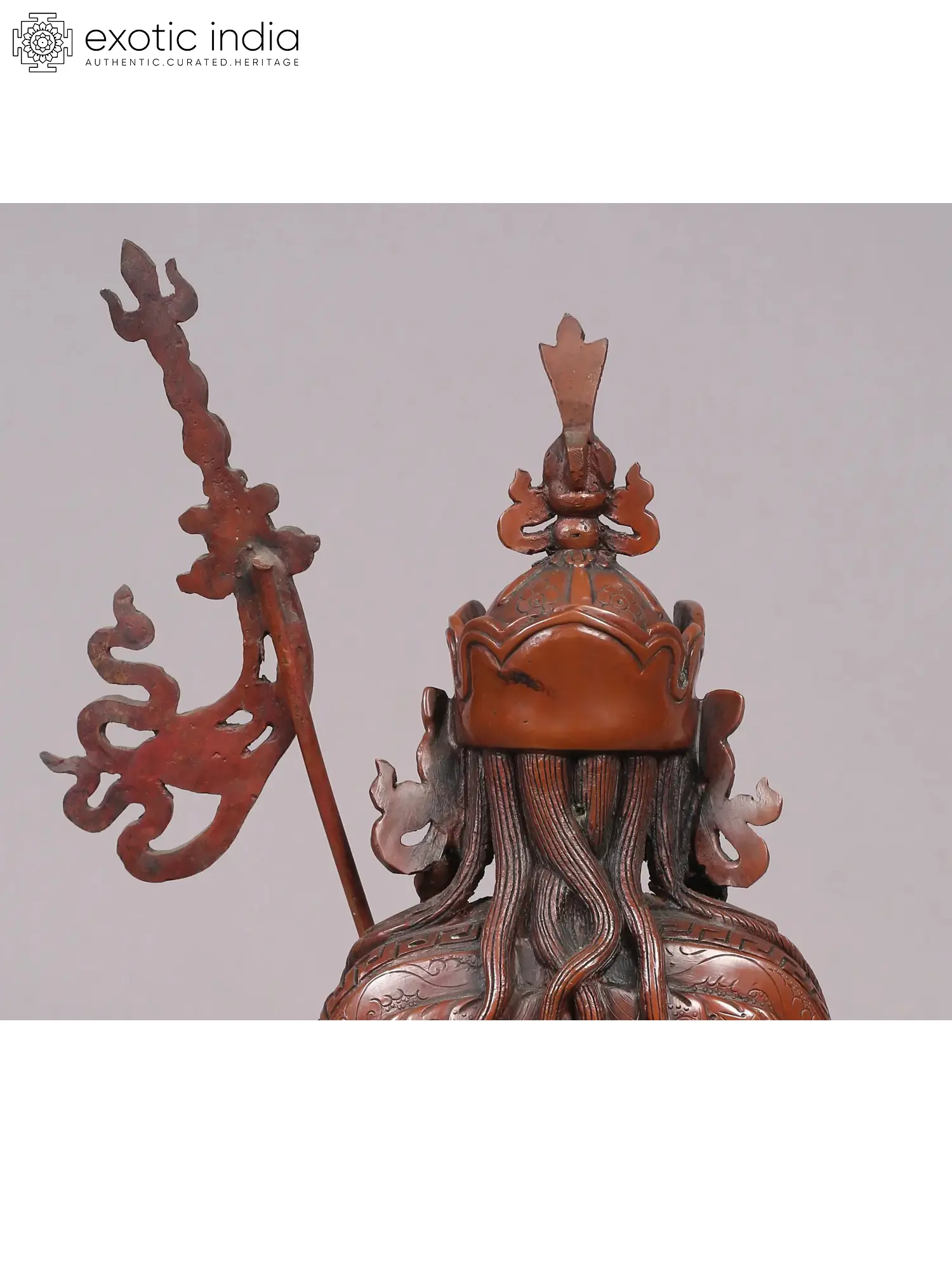 Guru Tshokey Dorje, revered as Guru Rinpoche or Guru Padmasambhava, holds a significant place as a precious guru credited with introducing Vajrayana and Buddhism to Tibet. Seated gracefully upon a moon disc, his majestic presence is accentuated by the iconic lotus hat adorning his copper form, symbolizing his enlightened insight.