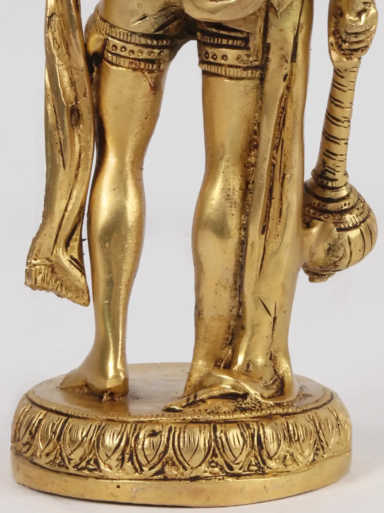 In this brass creation, Lord Hanuman, “the Son of Vayu, the destroyer of all illusions”, emerges as the “Formidable Warrior”, a mesmerising embodiment of valour and devotion. Standing atop a lotus pedestal, “Maruti” radiates a transcendent glory, a testament to his unwavering dedication to “Lord Rama”. In his right hand, He wields the mighty “Mace” (Gada), a symbol of his indomitable strength and unwavering commitment to righteousness. Adorned in regal attire, his “Langot”, “flowing robe”, “Pitambara Mukut”, “Necklaces”, Kundals (Earrings), and “lotus garland” exude regal splendour, accentuating his divine majesty. This artwork signifies Hanuman’s unparalleled bravery, loyalty, and his eternal presence as a guardian and inspiration, forever enshrined in the hearts of countless devotees.