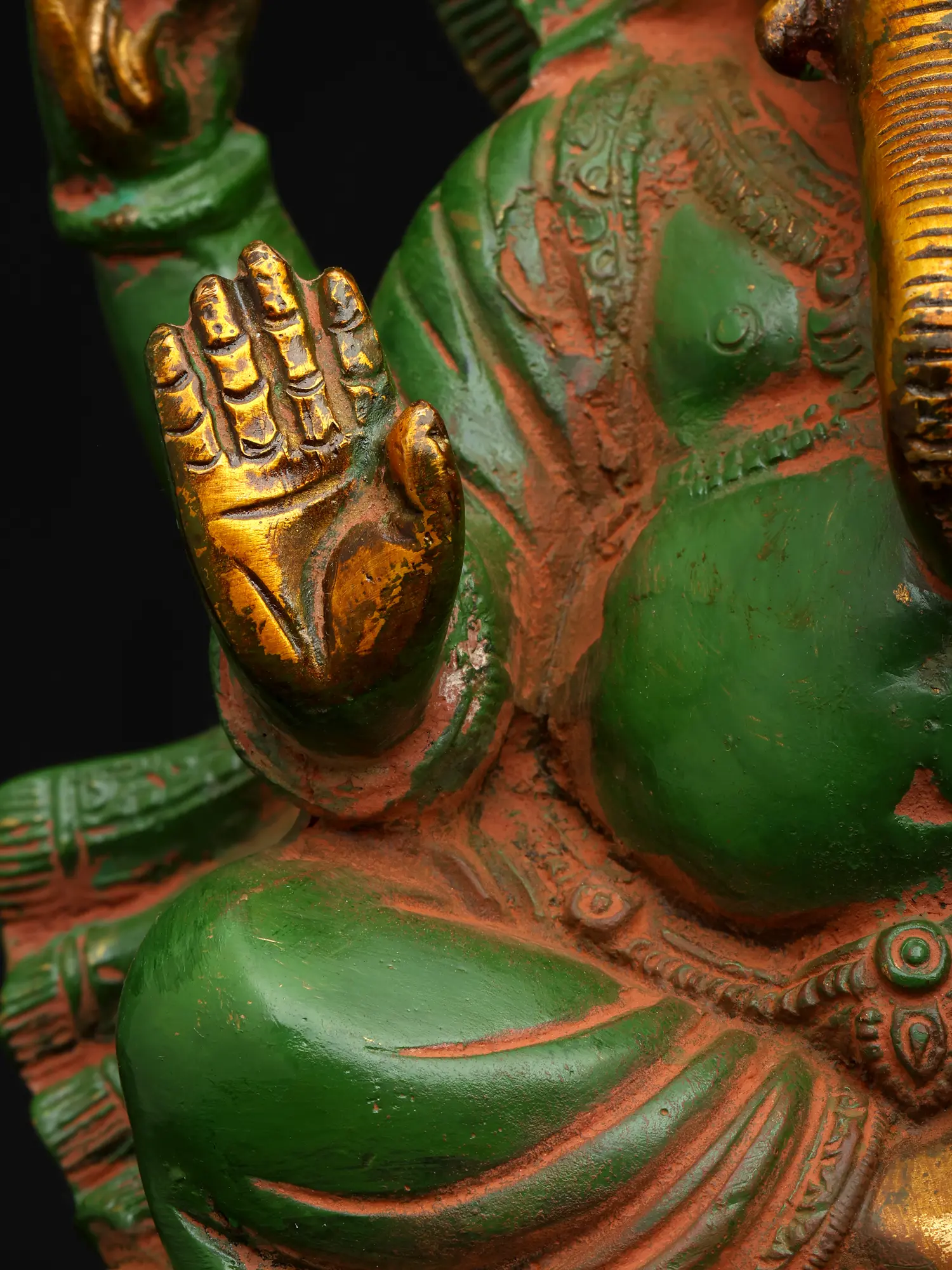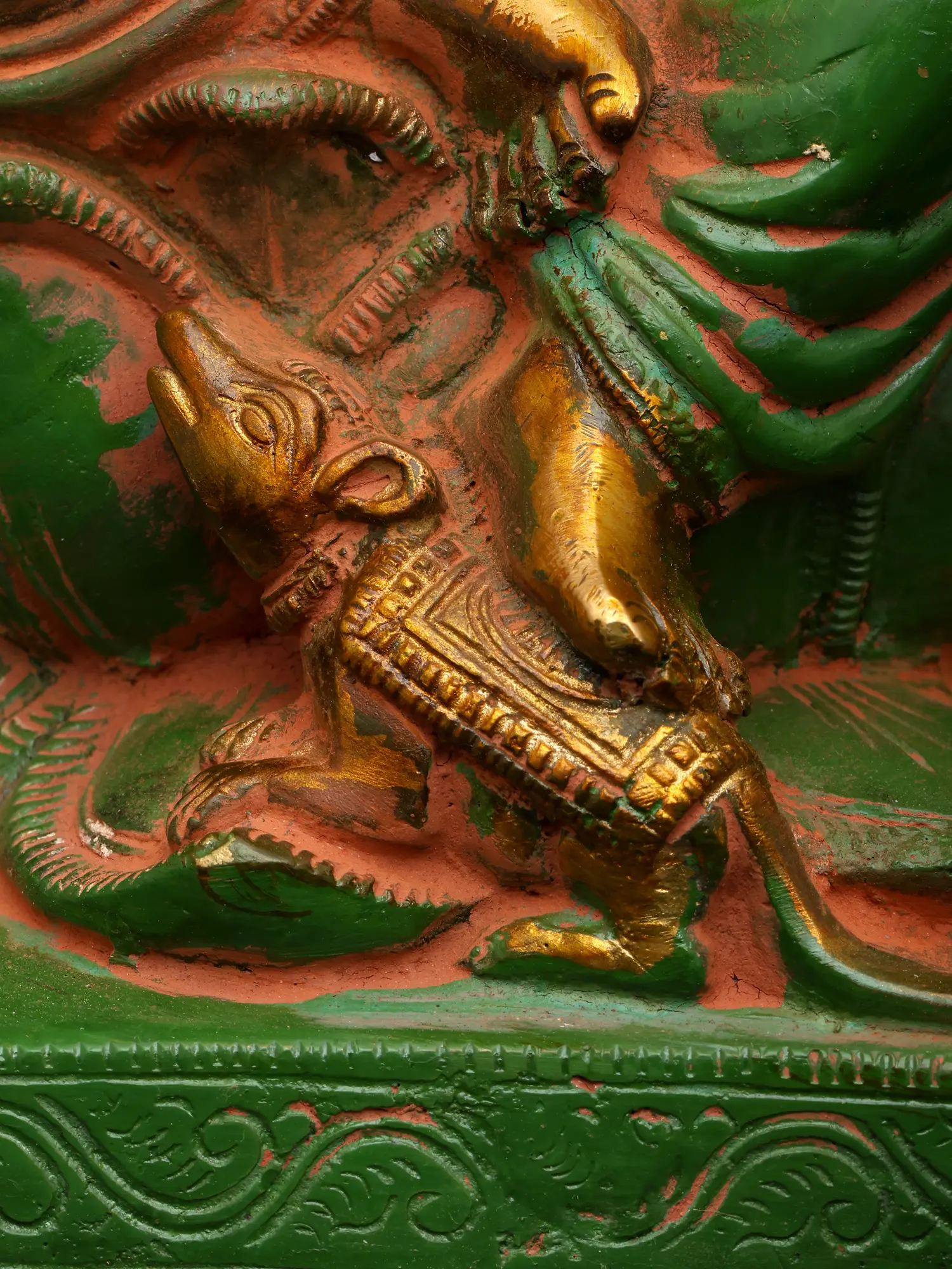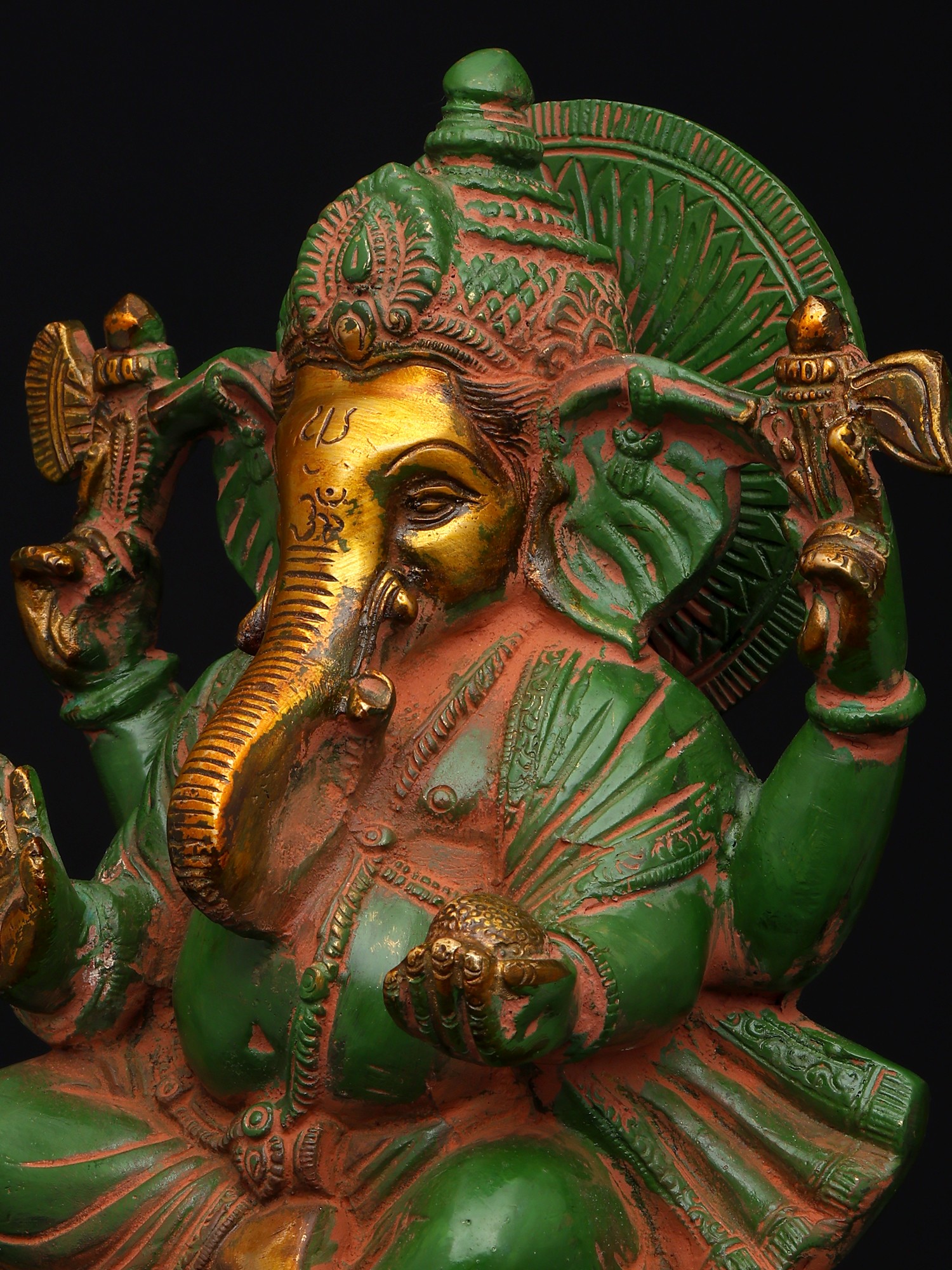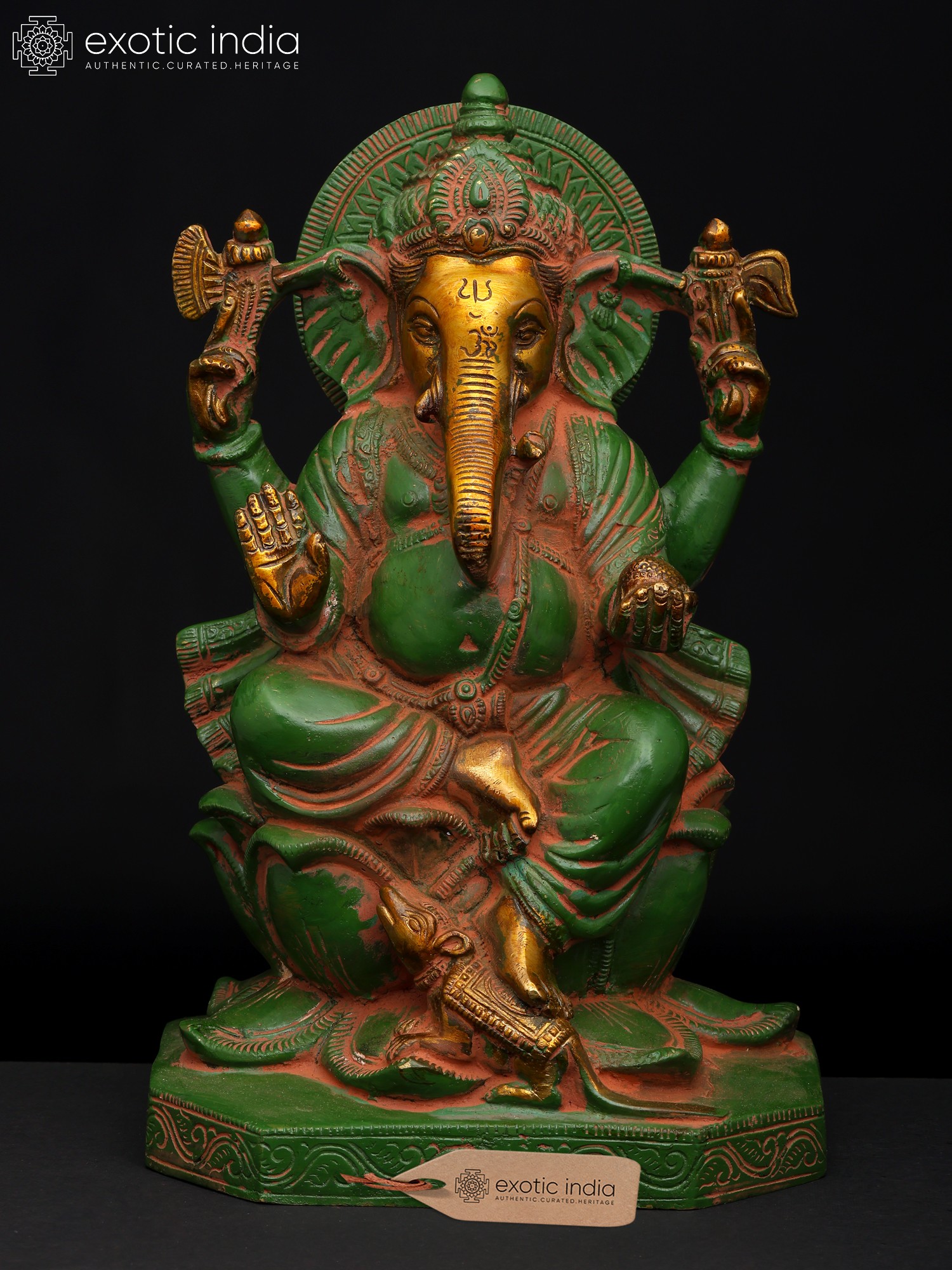 Handmade with meticulous attention to detail in India, this statue embodies the rich heritage of Indian artistry. The use of brass, a metal known for its durability and lustrous sheen, ensures that this piece will be a cherished heirloom for generations. The artisan has skillfully brought forth the serene countenance of Ganesha, his characteristic elephantine features exuding wisdom and benevolence. The intricate carving showcases the texture of his skin, the folds of his garments, and the divine embellishments that adorn him. The vibrant green patina, complemented by the warm golden hues of the brass, creates a striking visual appeal, highlighting the divine form.