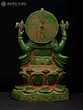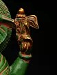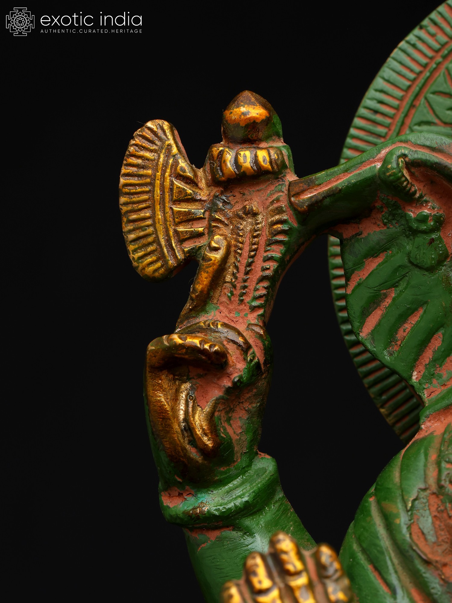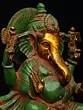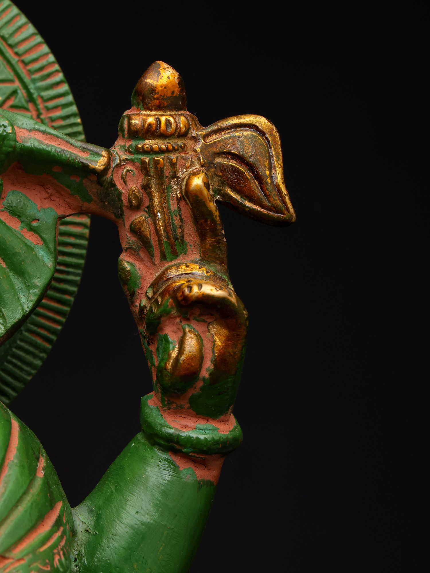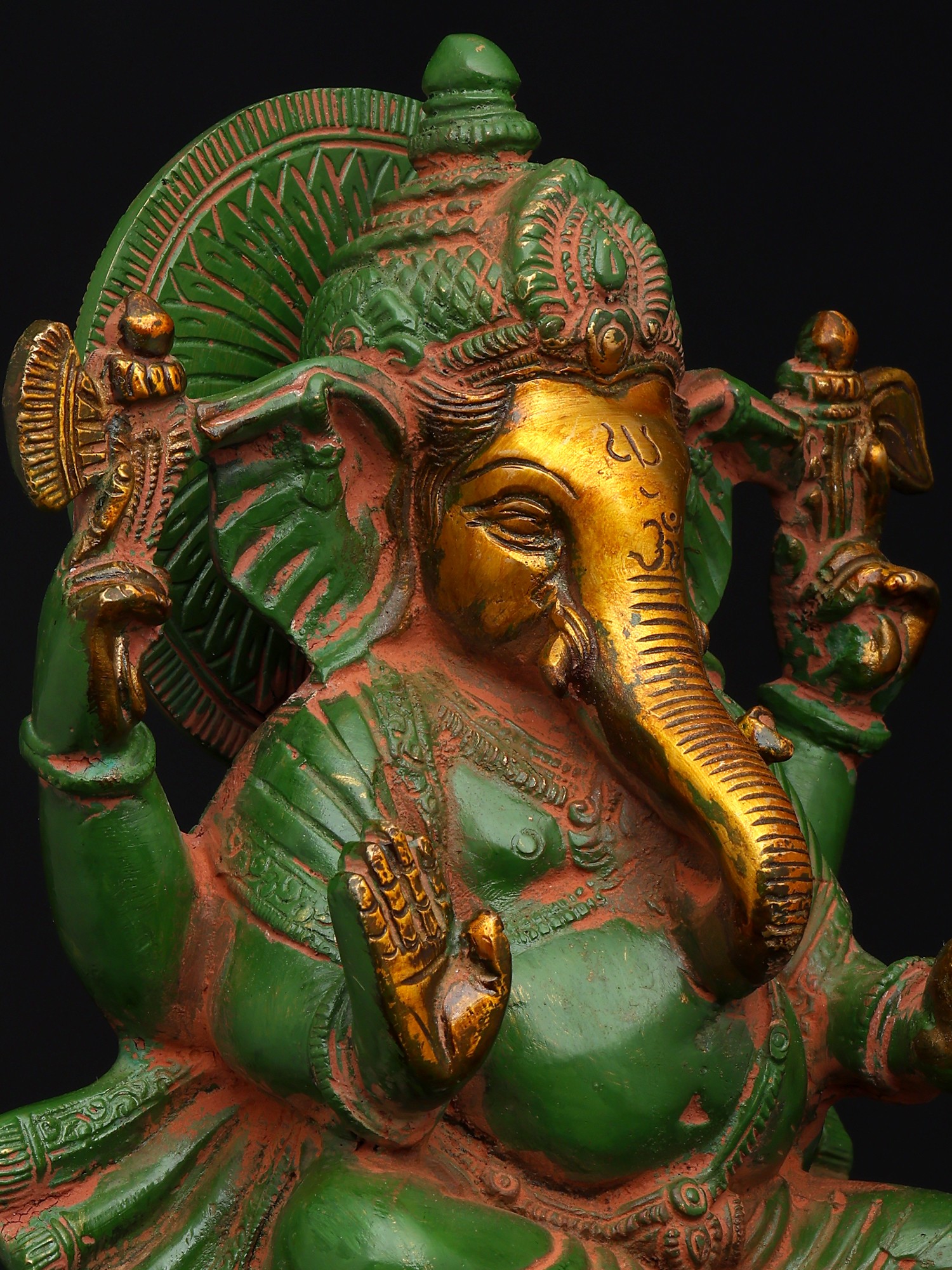 Handmade with meticulous attention to detail in India, this statue embodies the rich heritage of Indian artistry. The use of brass, a metal known for its durability and lustrous sheen, ensures that this piece will be a cherished heirloom for generations. The artisan has skillfully brought forth the serene countenance of Ganesha, his characteristic elephantine features exuding wisdom and benevolence. The intricate carving showcases the texture of his skin, the folds of his garments, and the divine embellishments that adorn him. The vibrant green patina, complemented by the warm golden hues of the brass, creates a striking visual appeal, highlighting the divine form.