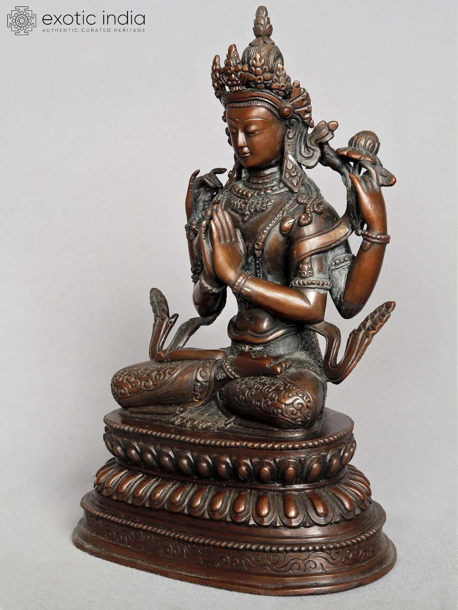This exquisite copper statue, originating from the rich artistic traditions of Nepal, embodies the profound spirit of a Bodhisattva, a being devoted to achieving enlightenment for the benefit of all sentient beings. The intricate craftsmanship and the lustrous copper medium speak to the deep spiritual reverence embedded in Nepalese art. The Bodhisattva is depicted in a state of serene contemplation, seated in the lotus posture, a symbol of purity and spiritual awakening, upon an elaborately decorated tiered base. The multifaceted nature of the Bodhisattva is visually represented by its multiple arms. Each hand is posed with distinct mudras, or symbolic gestures, conveying different aspects of spiritual power and wisdom. The central hands are joined in Anjali Mudra, the gesture of prayer and salutation, signifying reverence and devotion. The upper arms hold symbolic objects, often representing the tools of enlightenment and compassion. One arm might hold a lotus flower, a universal emblem of purity, rebirth, and the blossoming of consciousness, or perhaps a sacred text, the repository of profound teachings. The presence of multiple limbs is a common motif in Buddhist iconography, representing the boundless capabilities of a Bodhisattva to act in the world and alleviate suffering.