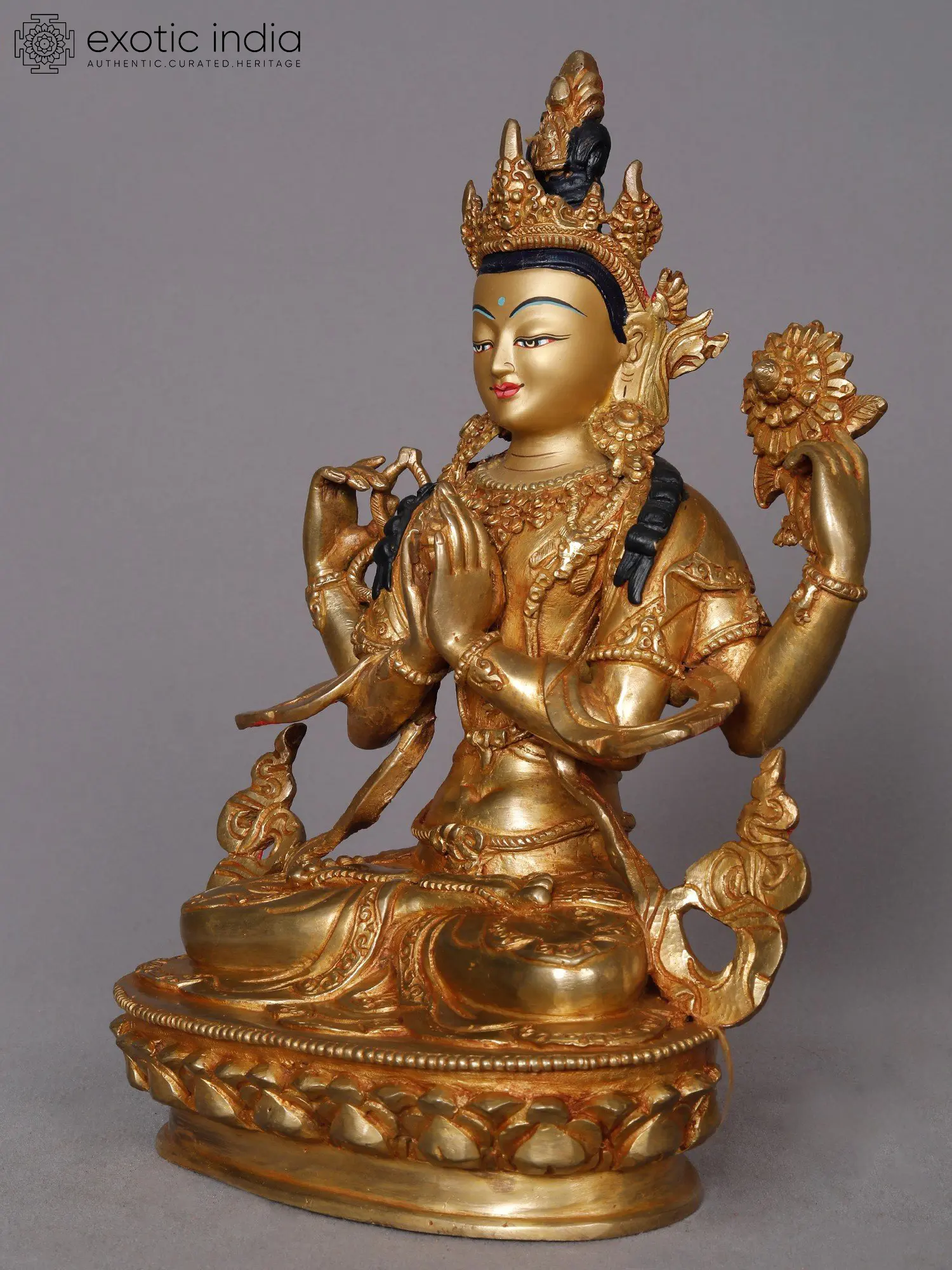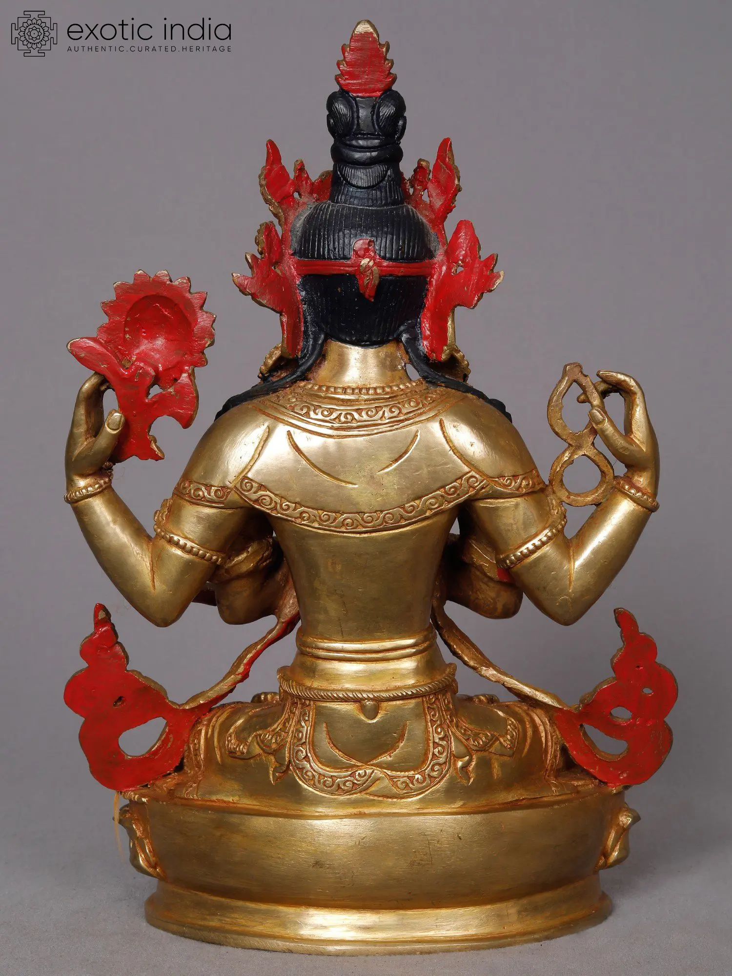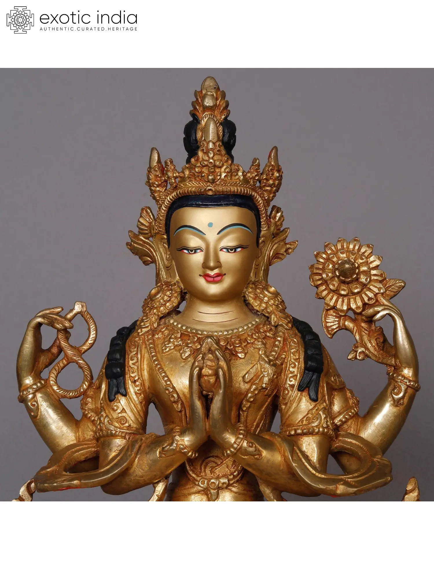 Kharchari makes an unyielding vow to never cease until he has liberated all sentient beings from the cycle of samsara, yet despite his earnest endeavors, the magnitude of this aspiration remains insurmountable. His two foremost hands are united in a gesture of reverence before his heart adorned with precious jewels. His upper right-hand cradles a crystal akshamala or rosary, an emblem of the eternal cycle, signifying his unique identity.