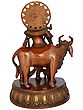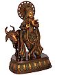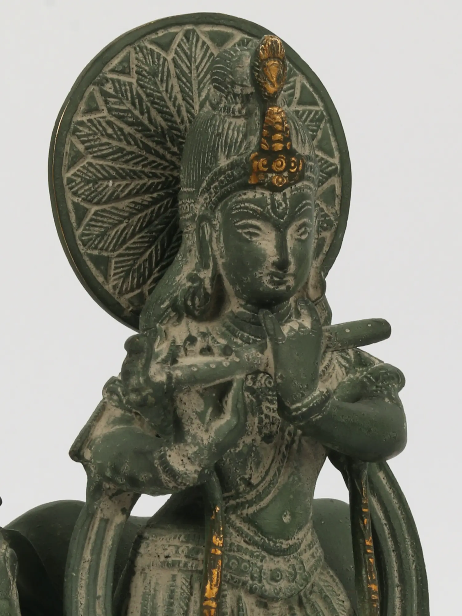 This exquisite brass sculpture beautifully captures Lord Krishna in his divine form. Standing in the classic Tribhanga pose, he skillfully plays the melodious flute, enchanting all who behold him. The statue is adorned with a green patina tint, adding a touch of antiquity to the piece. What makes this statue special is the depiction of Lord Krishna with a cow beside him, symbolizing the sacred and nurturing relationship between the divine and the bovine. Intricate detailing, including unique ornaments highlighted with a subtle golden tint, enhances the statue's visual appeal. This handmade creation not only exudes artistic brilliance but also radiates the divine love and harmony embodied by Lord Krishna and his beloved cows.