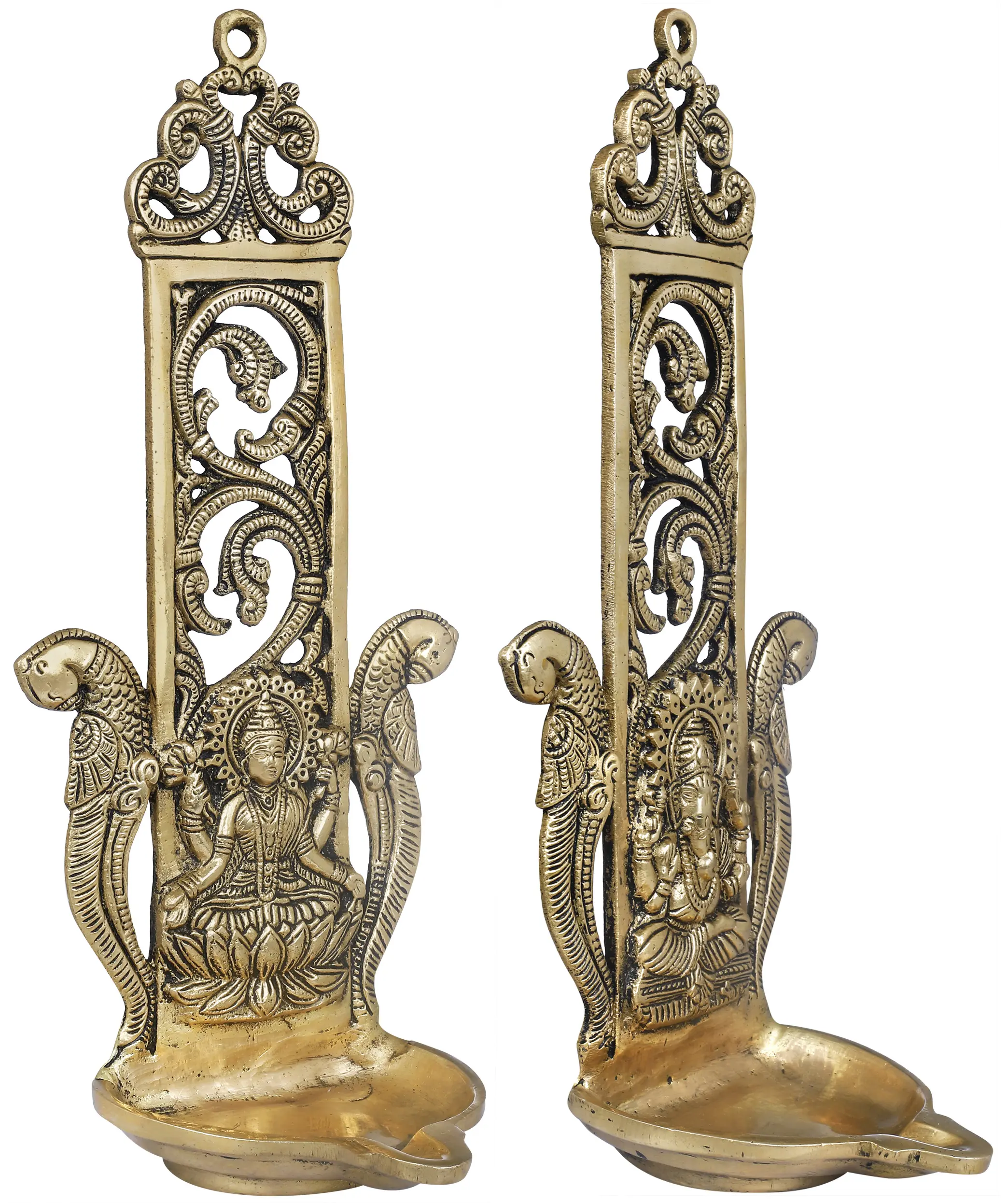 It is customary in India to embellish art with numerous spiritual symbols. In other cases, a basic depiction of a god has been aided by several natural components to express their relationship and to enhance the art piece with divine symbolism. This set of brass wall hanging lights has representations of Goddess Lakshmi and Lord Ganesha, as well as parrots on the sides. The panels are further embellished with vines that represent growth. The parrot, a sign of regality and frequently associated with Goddess Meenakshi, appears in this wall hanging to reinforce the auspiciousness of the representations of Lakshmi and Ganesha. The lamp's oil basin is shallow and located at the bottom of the panel. This wall-hanging lamp with a tint of antique brass is the apex of symbolism and divinity. It may be used as both a wall hanging and a ritual object.