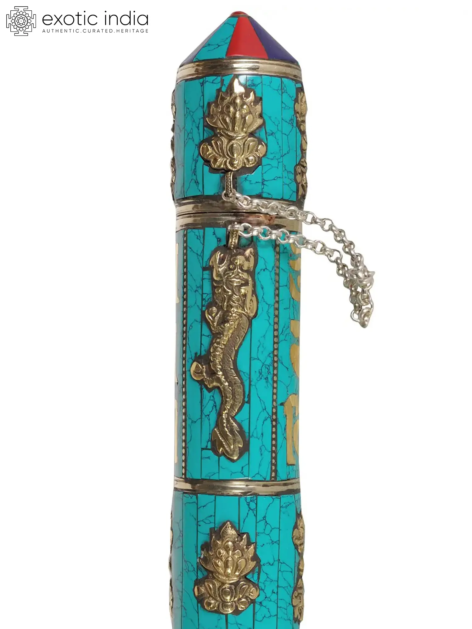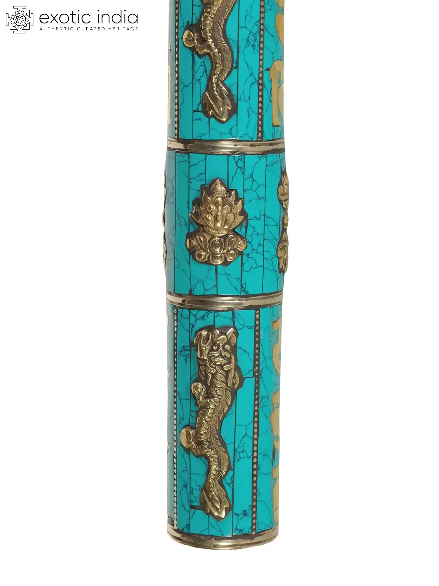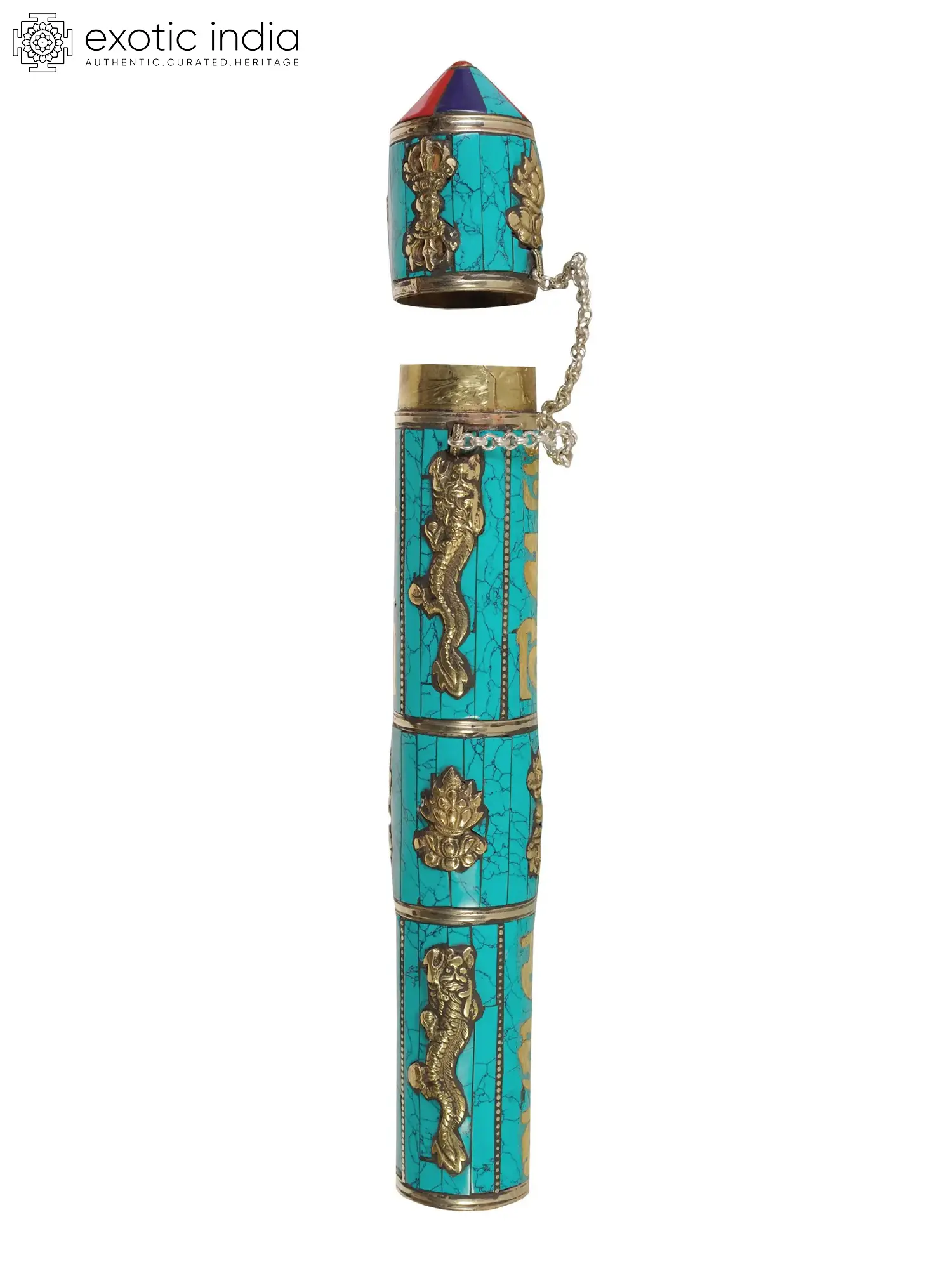 In the rituals of the East, incense holds a special significance, as tools to elevate any ambiance into a divine plane, where the devotee interacts with the powers of the heavenly beings. Crafted with pure copper and brass and embellished with inlay pieces, this large Tibetan incense holder is adorned with beautiful Buddhist motifs all over and has ample storage space to keep your incense sticks fresh and prepared to infuse your space with a mystical fragrance.