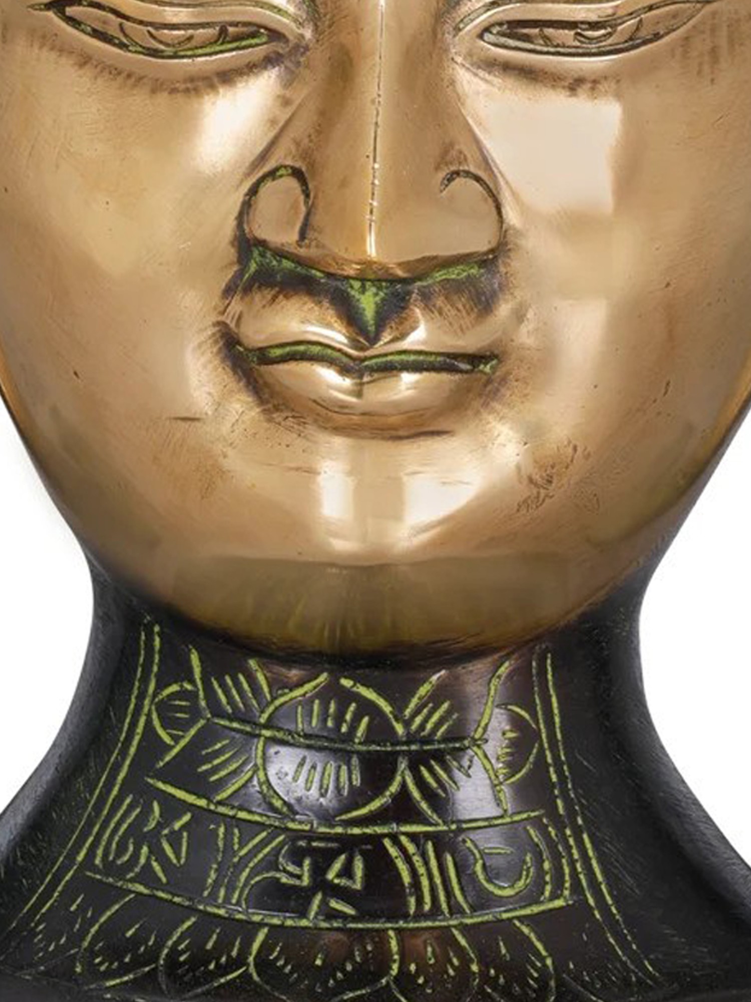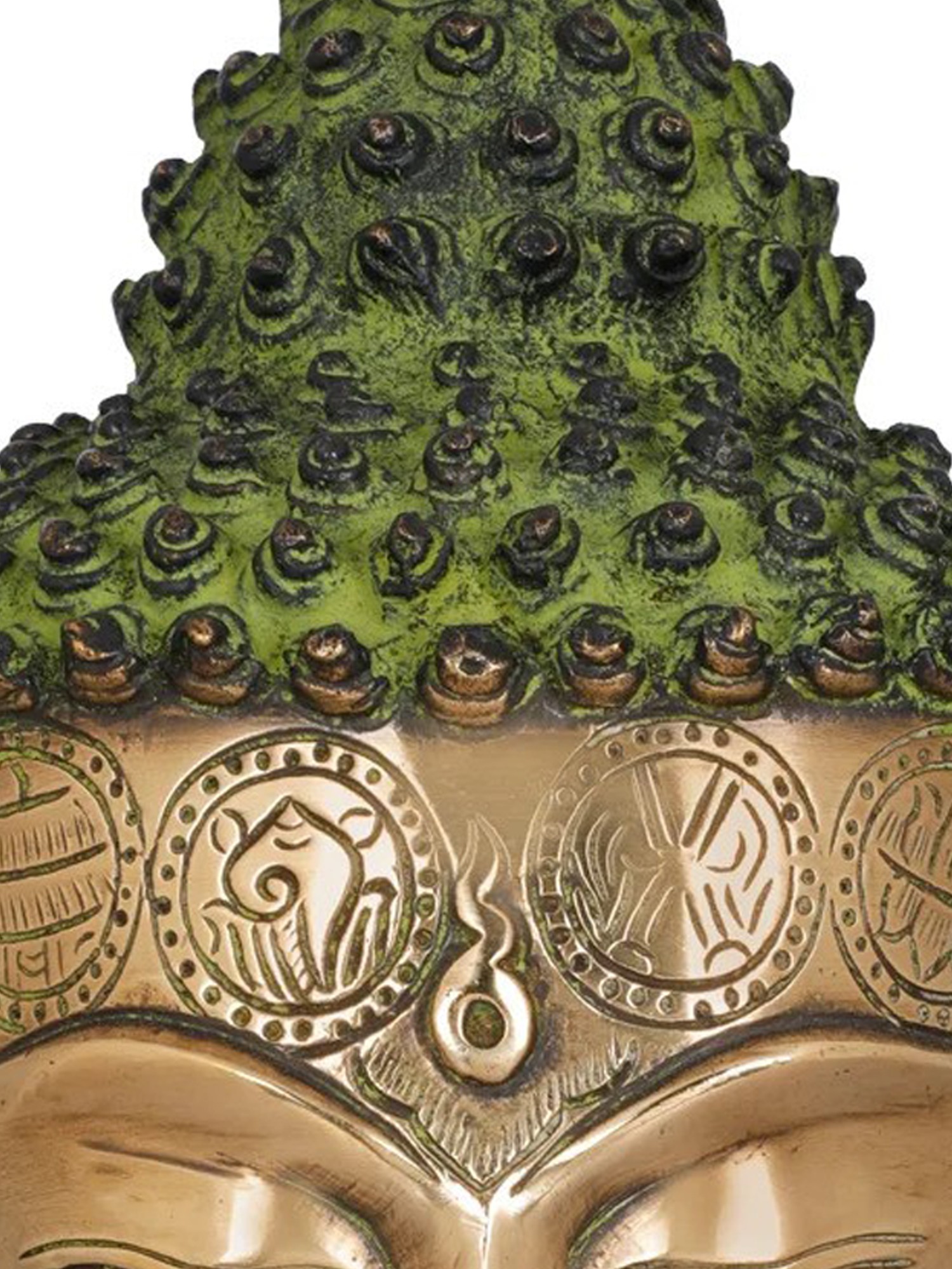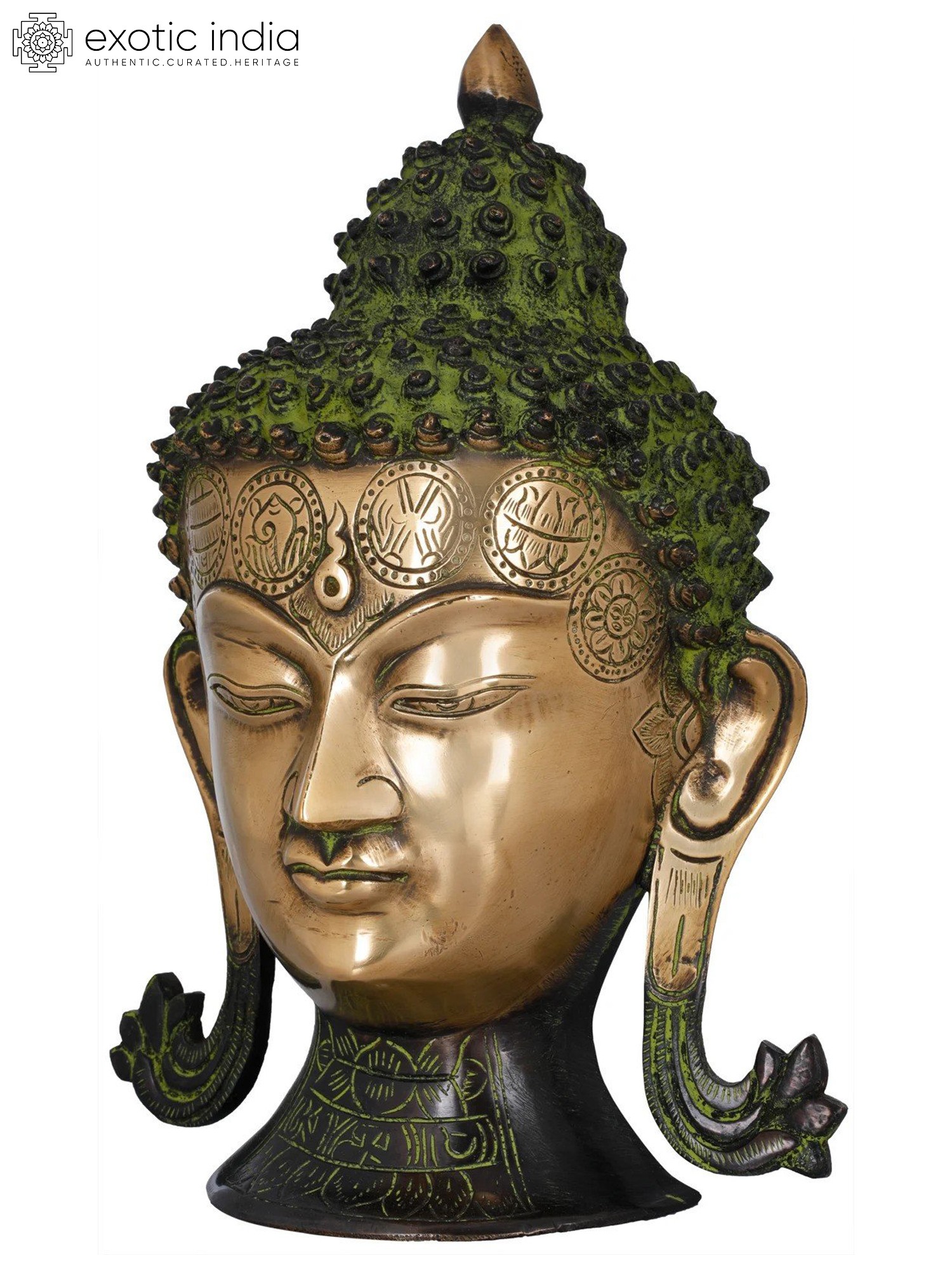 His bunch of coiled hair locks represent his years of continuous meditation to achieve enlightenment and the small wavy dot on the forehead is a mark of his third eye of wisdom. That glow and perfection of his features is sculpted in the most mesmerizing ways, that its presence on any wall or showcase will automatically enhance the charm of that area. Exotic India provides you with a collection of three exquisite colors of natural brass, chola and the rarely found shade of blend of black and green to choose from.