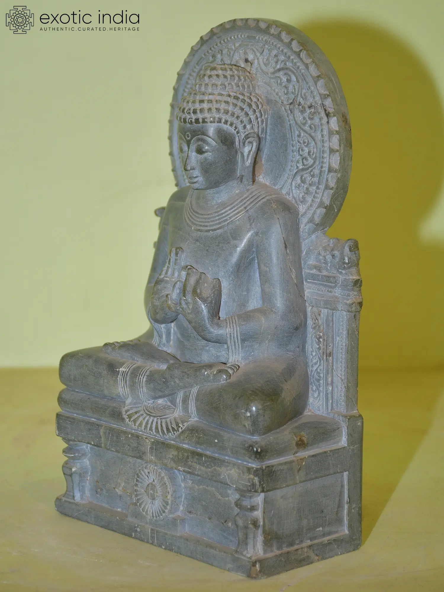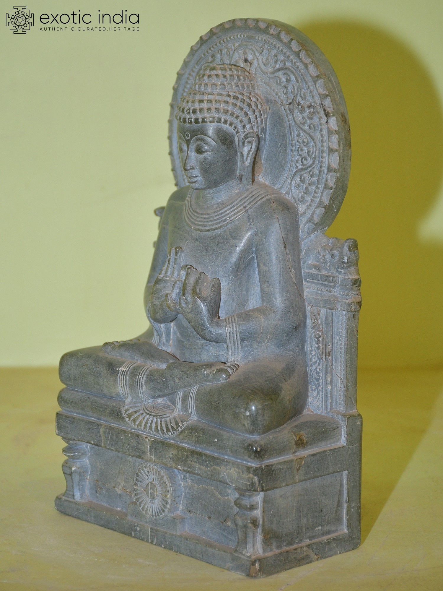 This exquisite statue captures Lord Buddha in the Dharmachakra Mudra, a gesture of profound spiritual significance. The Dharmachakra, or "Wheel of Dharma," represents the Buddha's first sermon after achieving enlightenment, where he set the Wheel of Law in motion, teaching the Four Noble Truths. This pivotal moment in Buddhist history marked the beginning of the propagation of his teachings, offering a path to liberation from suffering. The sculpture, meticulously hand-carved from Orissa stone, embodies the serene contemplation and compassionate wisdom that defines the Buddha.