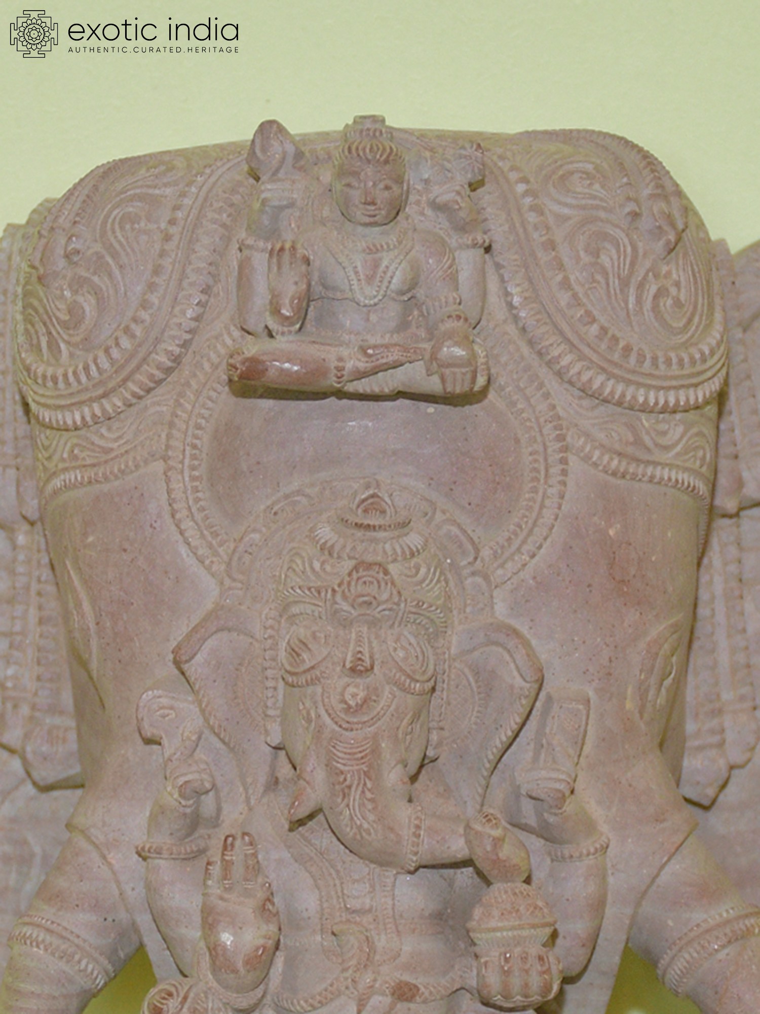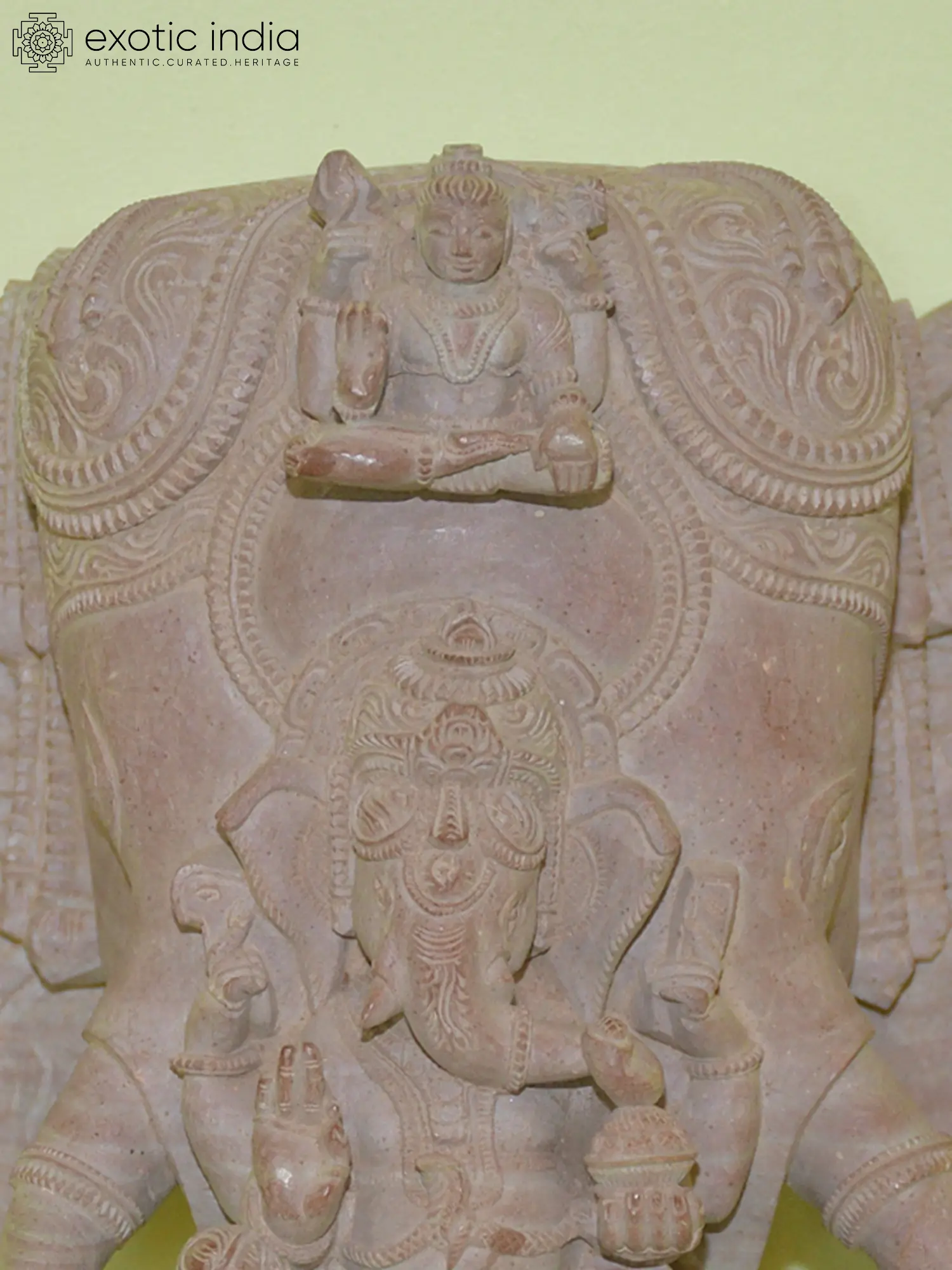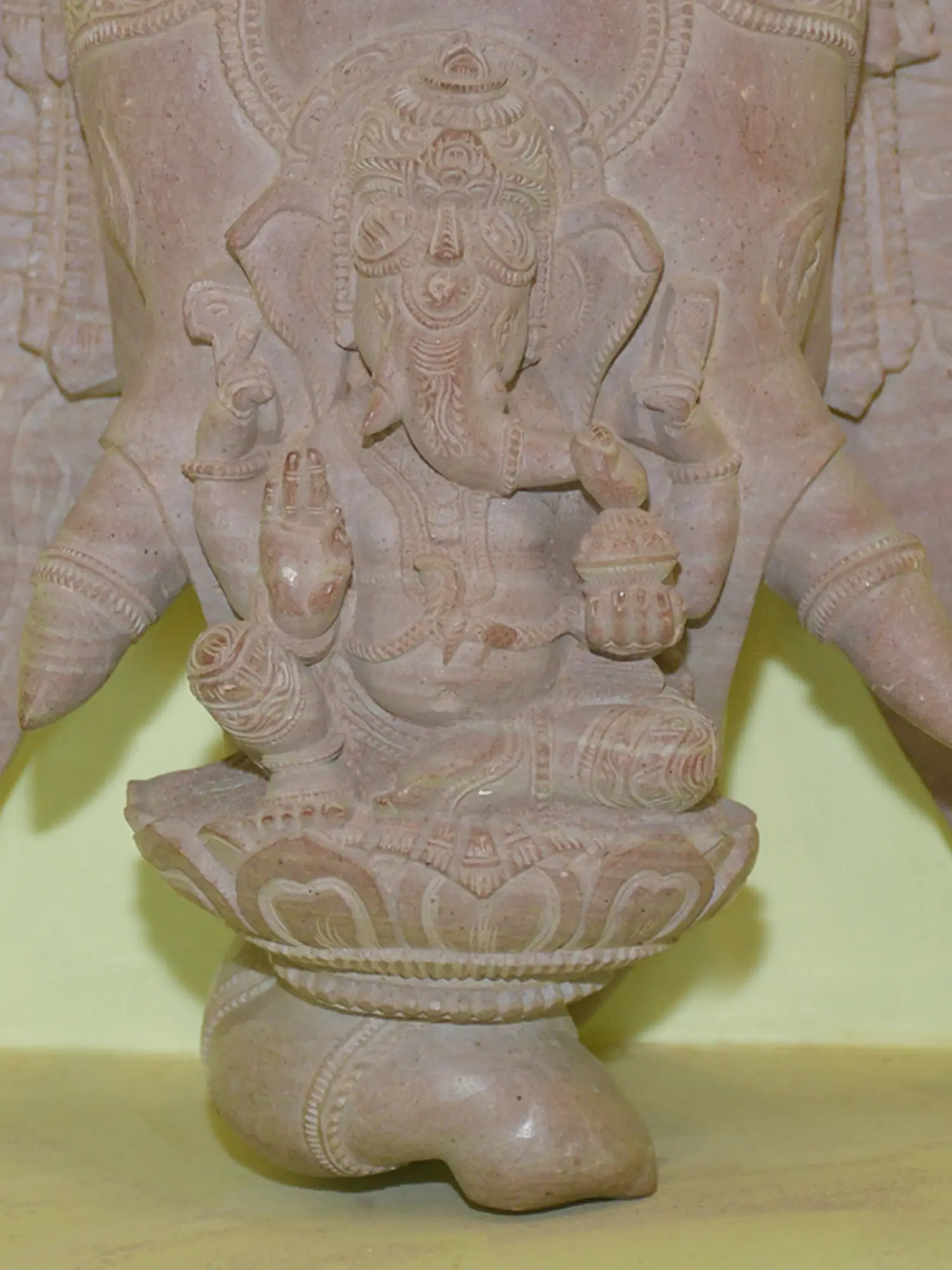 This exquisite hand-carved stone statue embodies the auspicious presence of Lord Ganesha, the beloved elephant-headed deity of Hinduism. Crafted from the finest Orissa stone, renowned for its subtle grain and earthy hues, this piece is a testament to the rich tradition of Indian stone carving. The artist's masterful hands have brought to life the divine form, imbuing it with a palpable sense of peace and power. Lord Ganesha, the remover of obstacles and the bestower of wisdom, is depicted here in a seated posture atop a blooming lotus, a symbol of purity and spiritual growth. His gentle expression, characteristic of Ganesha's benevolence, invites contemplation and reverence. The intricately carved tusks, the trunk curled gracefully, and the auspicious mudras of his hands all speak to the deep understanding of iconography that has been passed down through generations of artisans. The detailing extends to his ornate headdress and the serene presence of a smaller deity perched above, possibly representing a celestial being or a symbol of Ganesha's divine parentage. ––––––––––