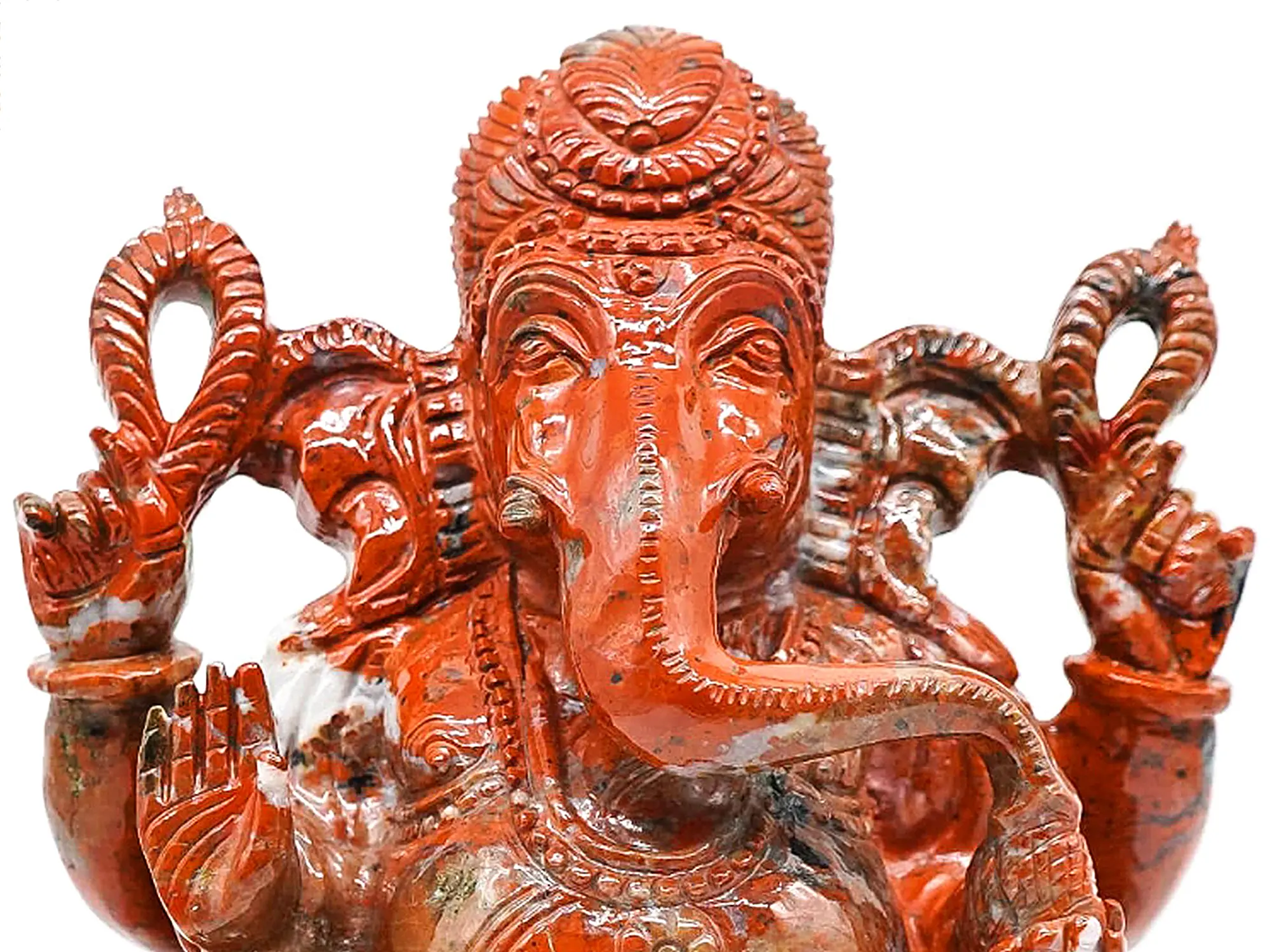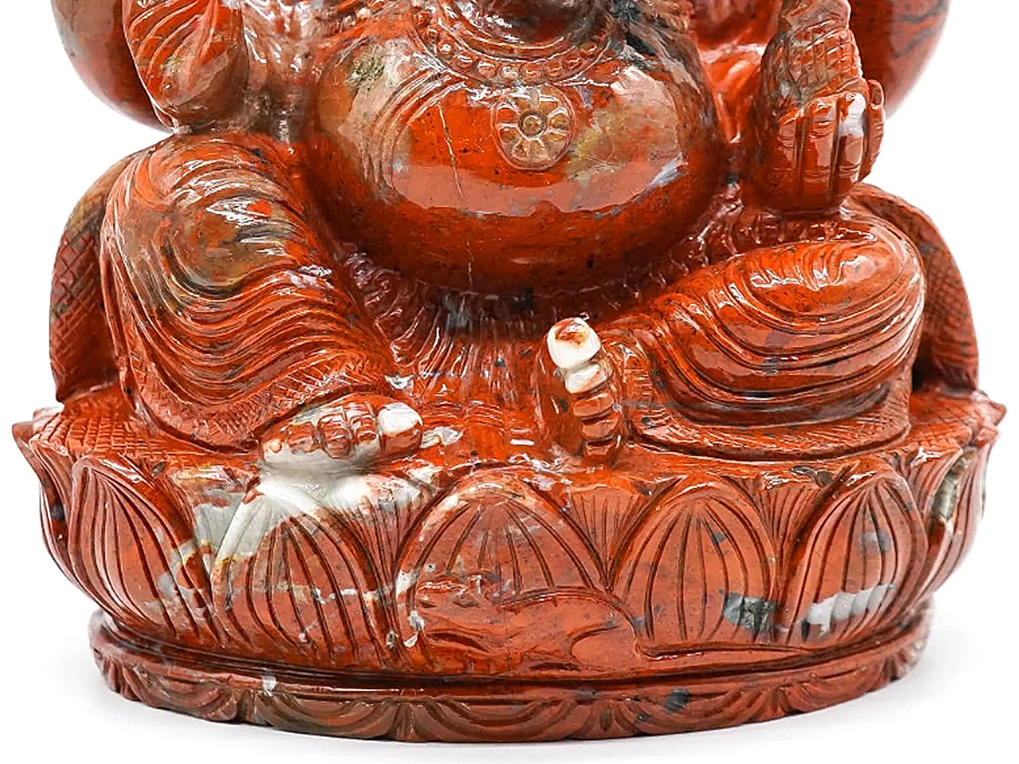 The fiery mineral ochre colour of this murti comes from the jasper medium. Jasper is a quartz/chalcedony whose colour comes from the high ferrous inclusions in silica. The sculpture that you see on this page has been carved from a block of jasper. The same has been imbued with a world of detail, which may be appreciated by zooming in on each aspect of Ganesha’s form.