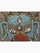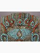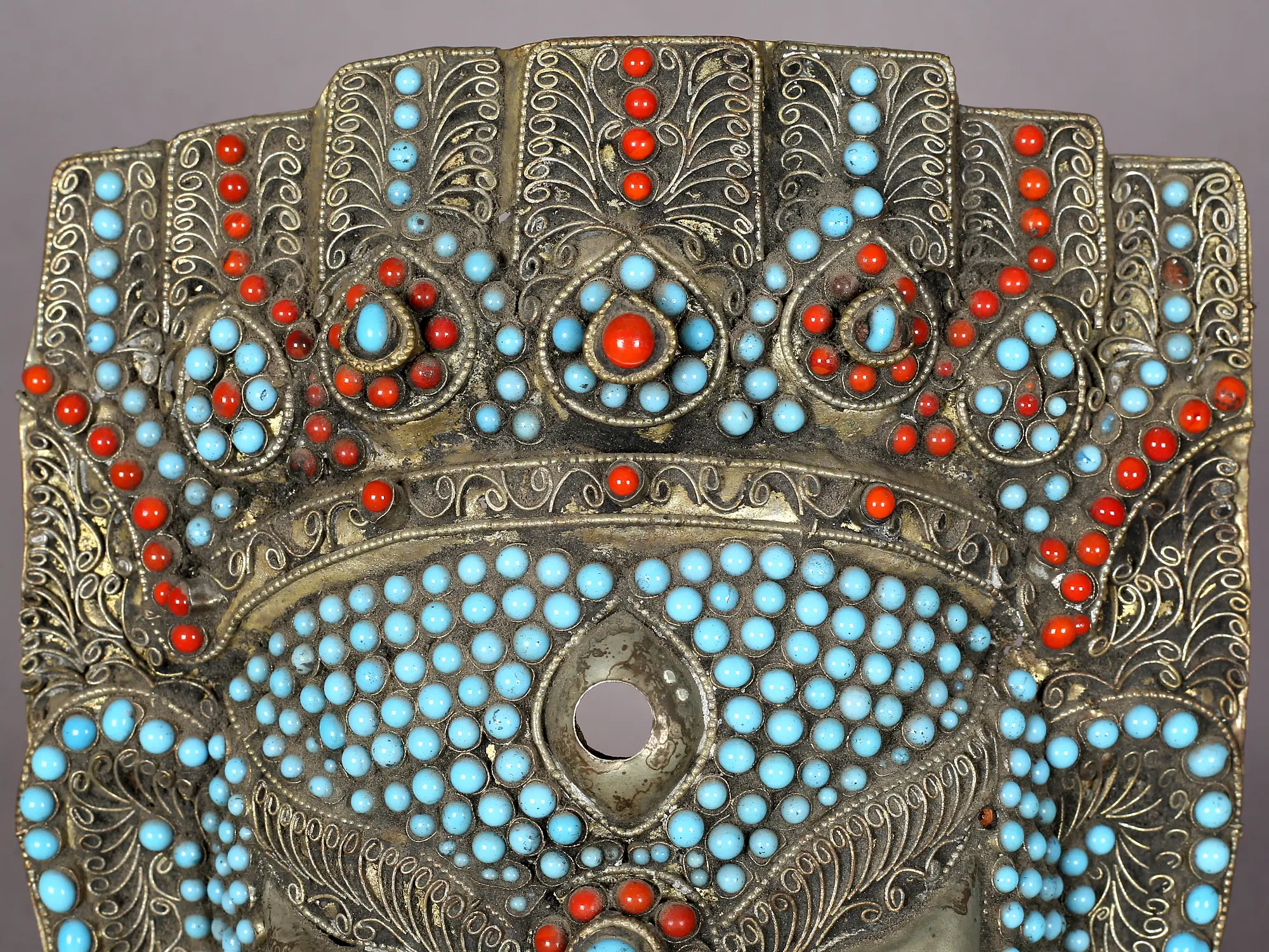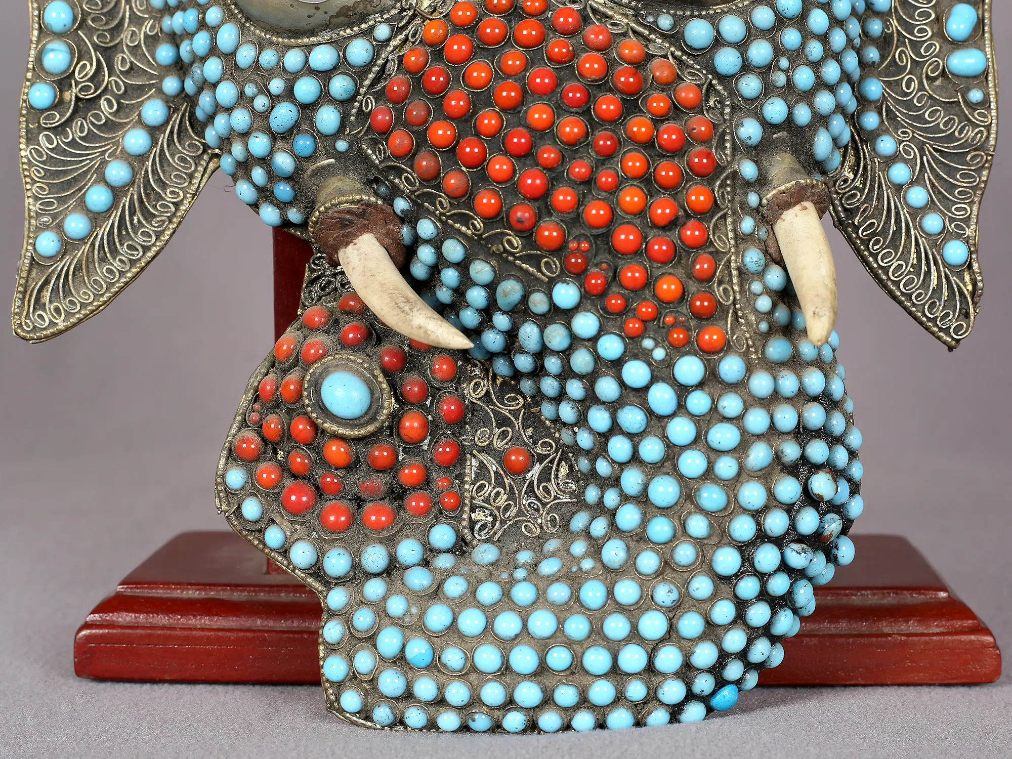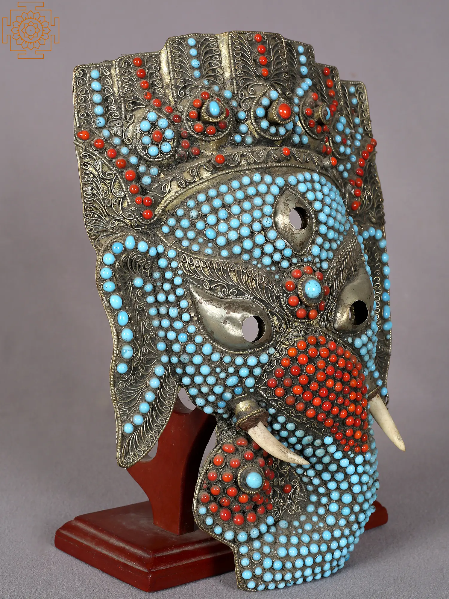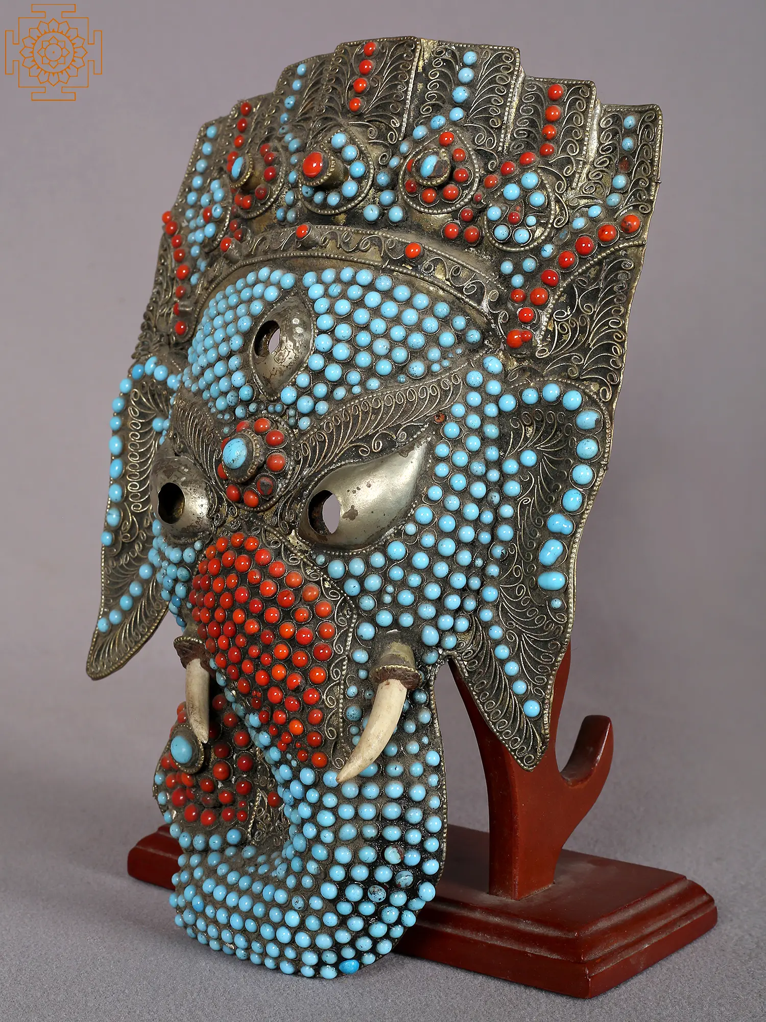 The mask is adorned with an intricate mosaic of vibrant turquoise and coral beads, meticulously inlaid into the metal. Turquoise, a stone revered for its protective qualities and association with the heavens, symbolizes wisdom and good fortune. Coral, often linked to passion, vitality, and warding off evil, adds a fiery dynamism to the piece. Together, these gemstones create a visually captivating contrast, drawing the eye to the divine visage. The placement of the stones evokes the divine energy and auspicious aura surrounding Lord Ganesha, making this mask a powerful symbol of spiritual protection and prosperity.