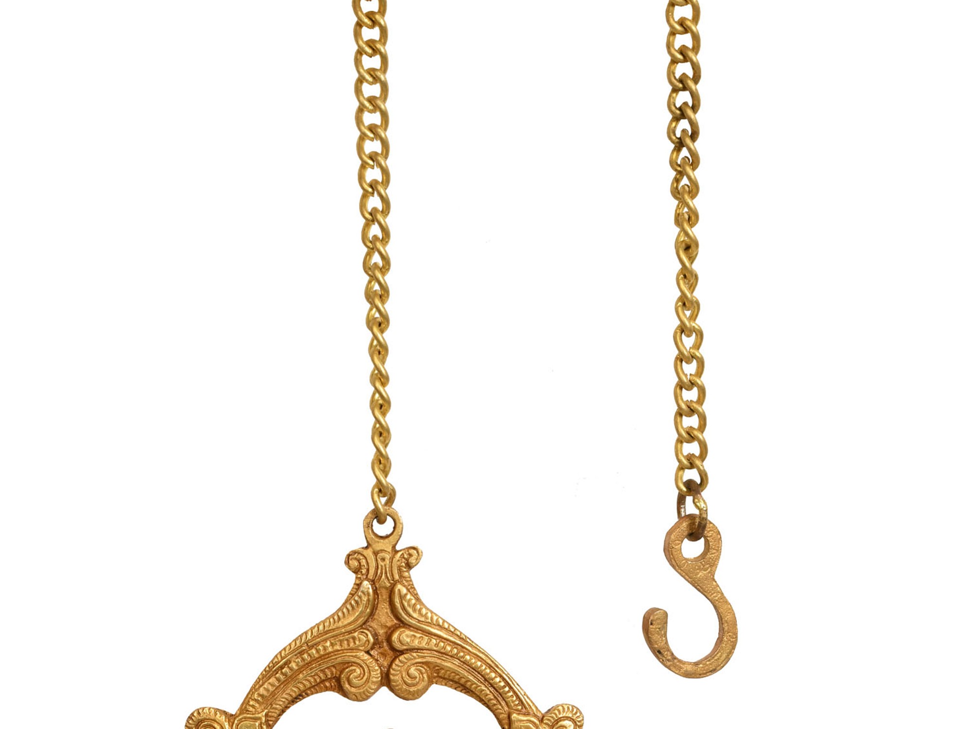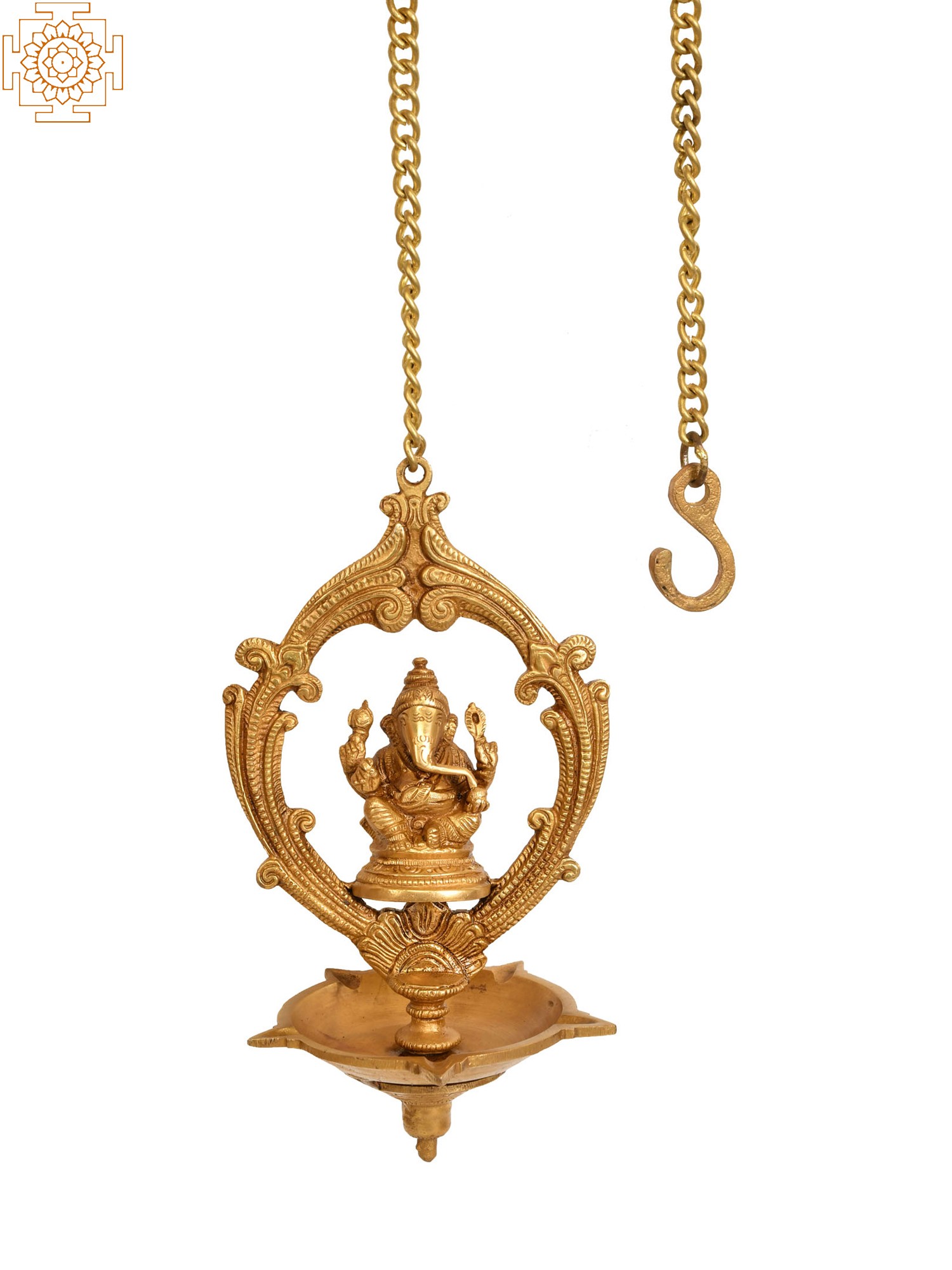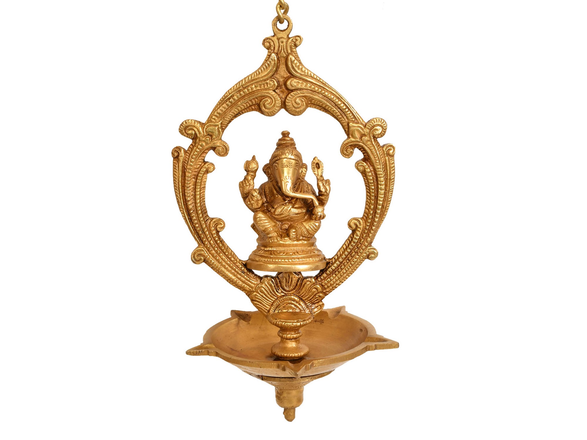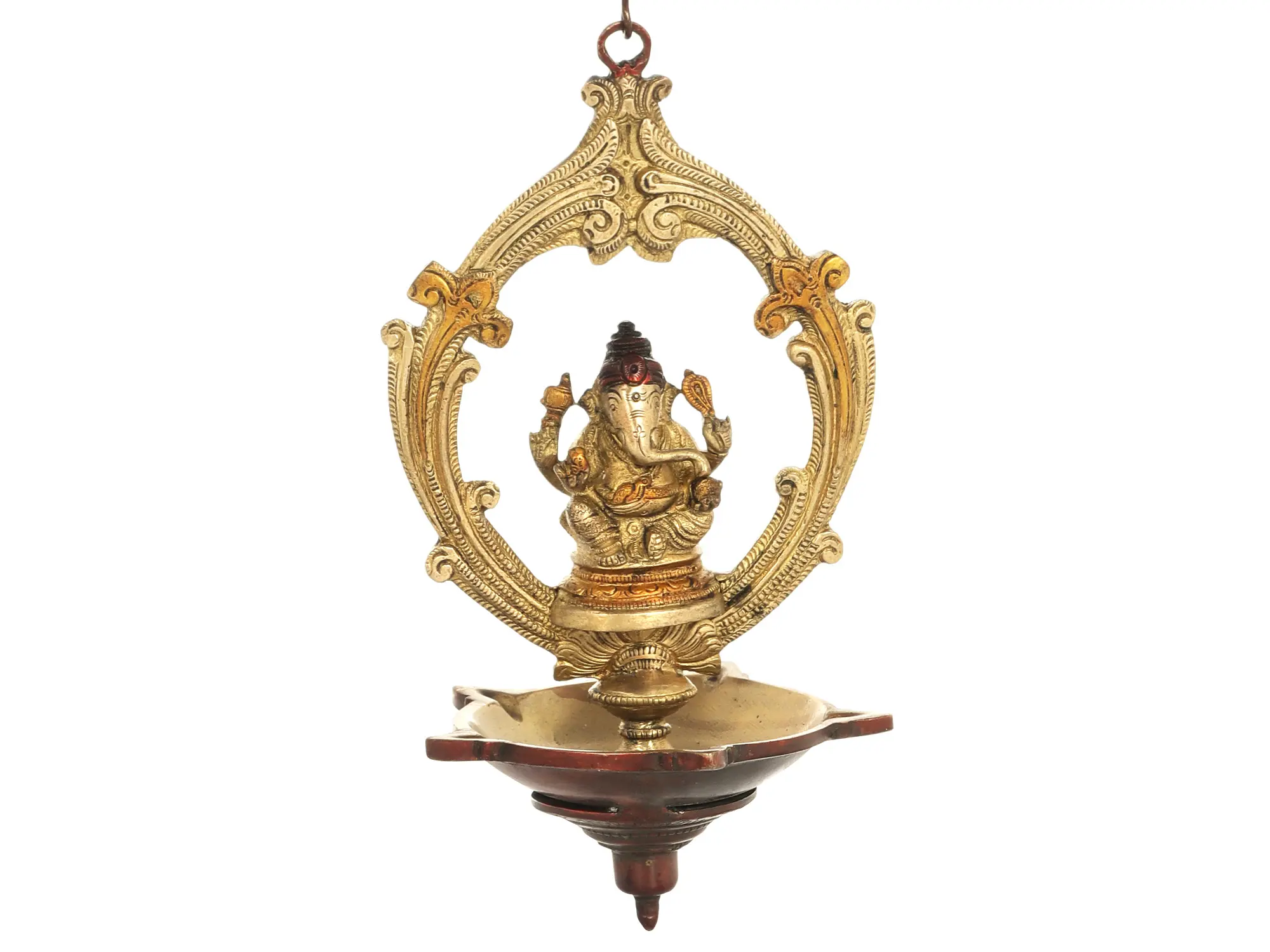 Illuminate your space with the divine presence of Lord Ganesha. Ganesha, the remover of obstacles, is a symbol of wisdom and good fortune. As you light this exquisite brass lamp, you invite his blessings into your home. The warm, gentle glow serves as a beacon of hope, dispelling darkness and negativity. Hang it in your sacred space, and let the radiance of Lord Ganesha guide your path, ensuring a life free from impediments and filled with joy and prosperity.