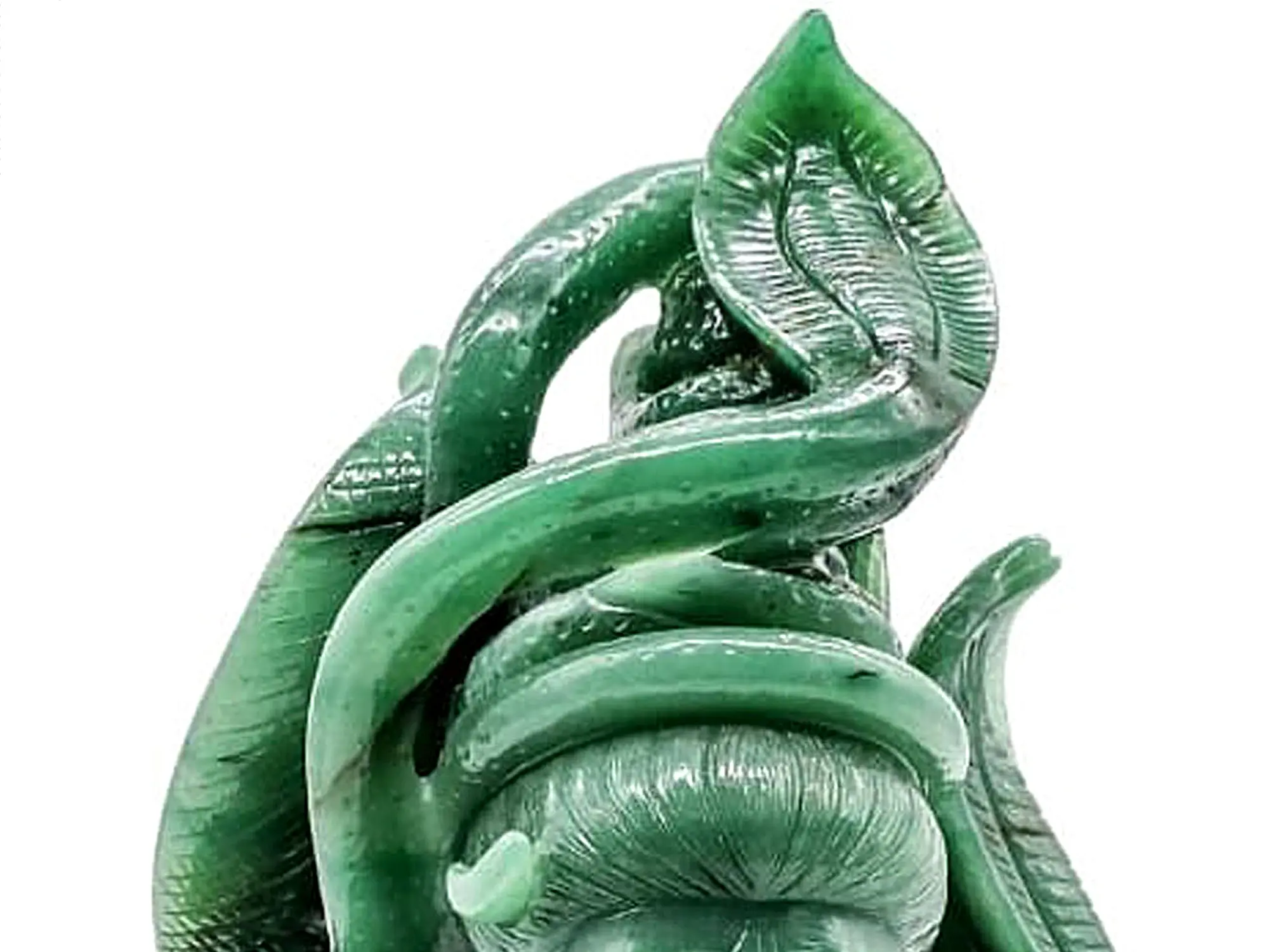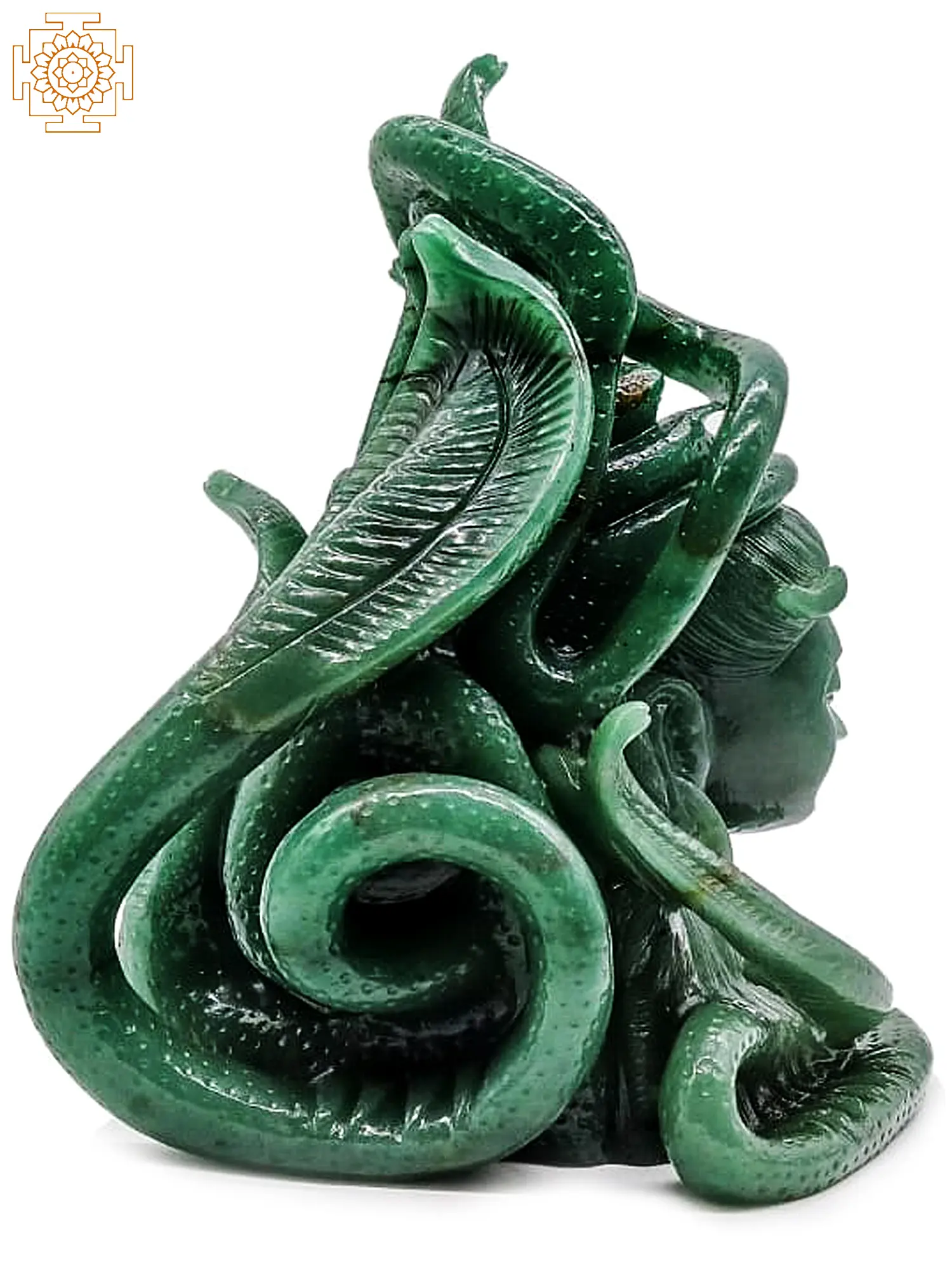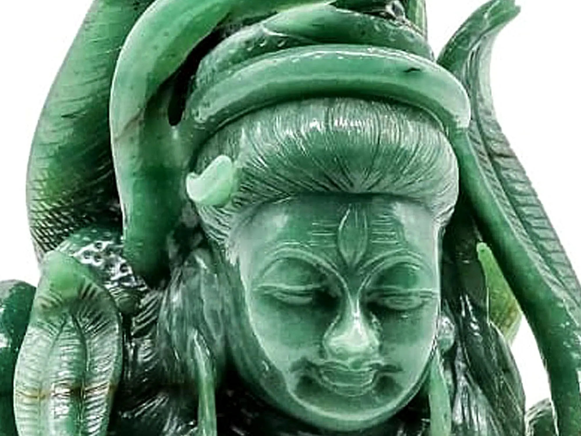 A contemplative Shiva bust. Made from aventurine, a form of quartz that resembles jade in terms of colour and texture. Sculpted with equal parts skill and equal parts devotion, the major part of the composition’s dynamism lies in the multitudinous snakes that cradle the head of Shiva.