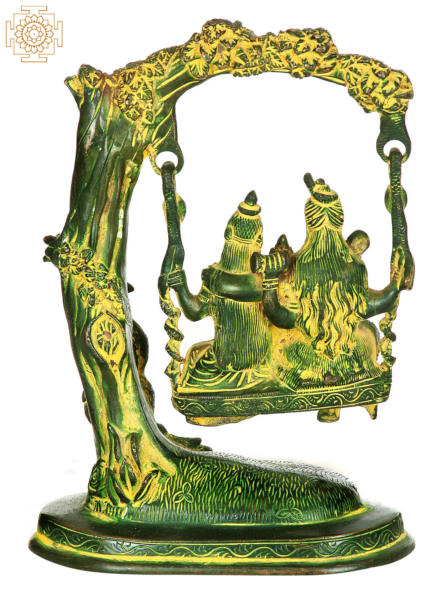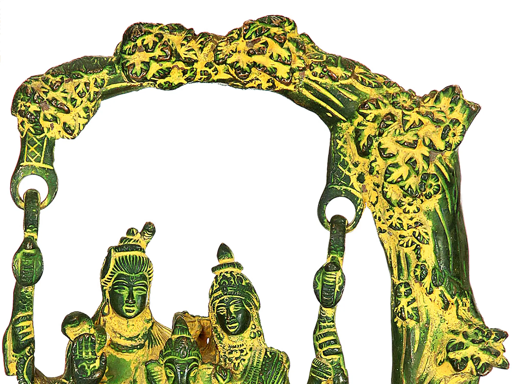 Behold a captivating representation of familial harmony and divine grace, handcrafted with devotion in brass. This sculpture depicts Lord Shiva, the destroyer of illusions and the auspicious one, joyfully seated on a swing alongside his consort, Parvati, the embodiment of power, love and motherhood. Nestled between them is their beloved son, Ganesha, the remover of obstacles and the lord of new beginnings. The swing, an ancient symbol of joy and leisure, is adorned with intricate details, suspended from a branch, perhaps reminiscent of the Kadamba tree, often associated with Krishna's playful pastimes, reflecting the carefree, blissful nature of divine love.