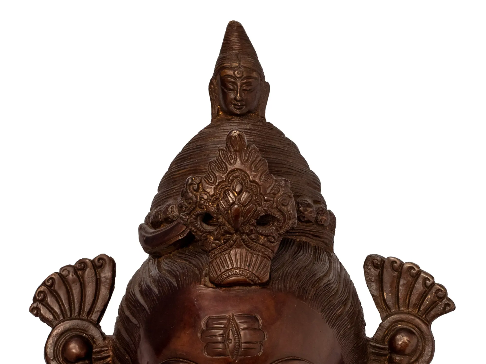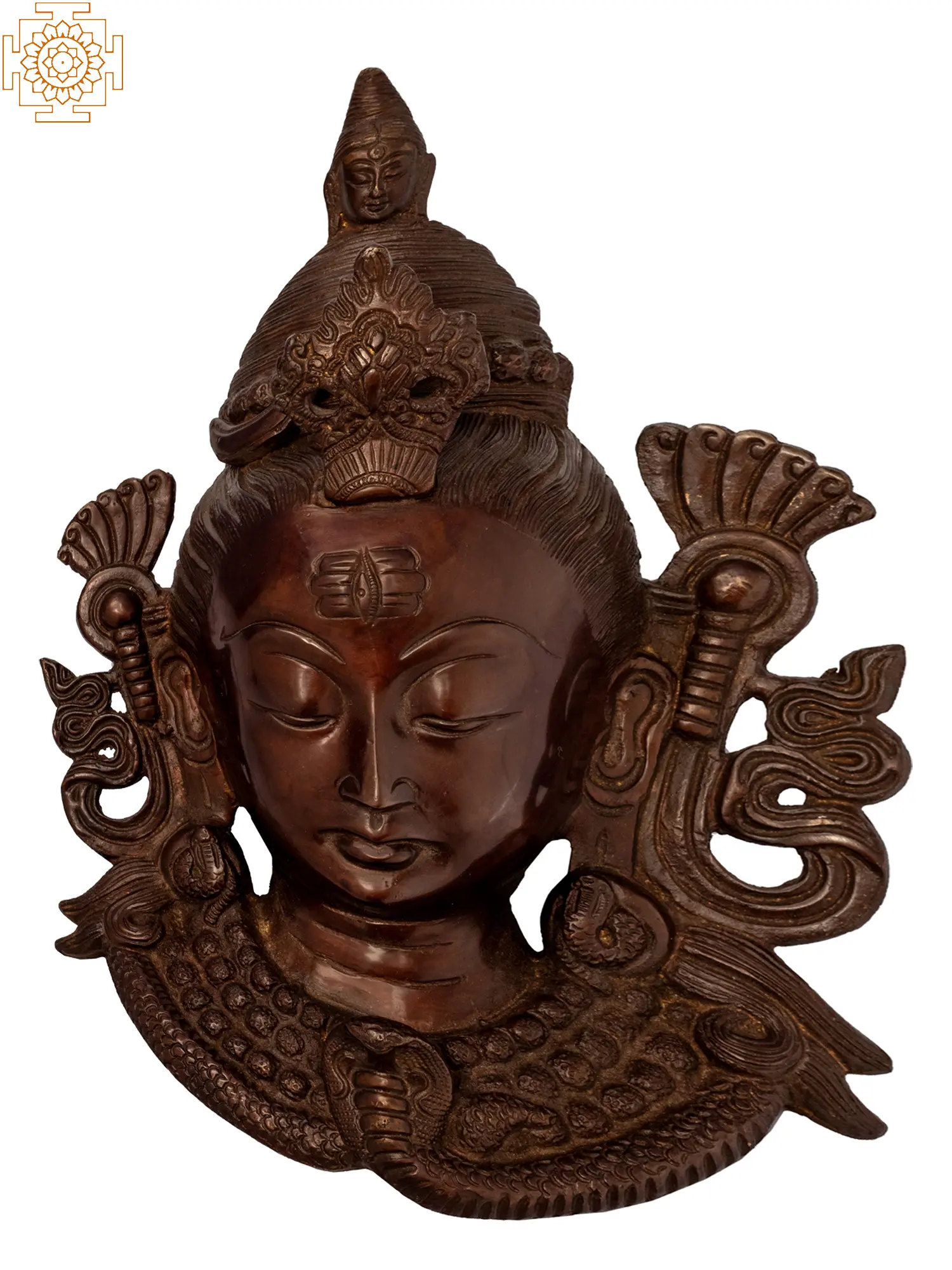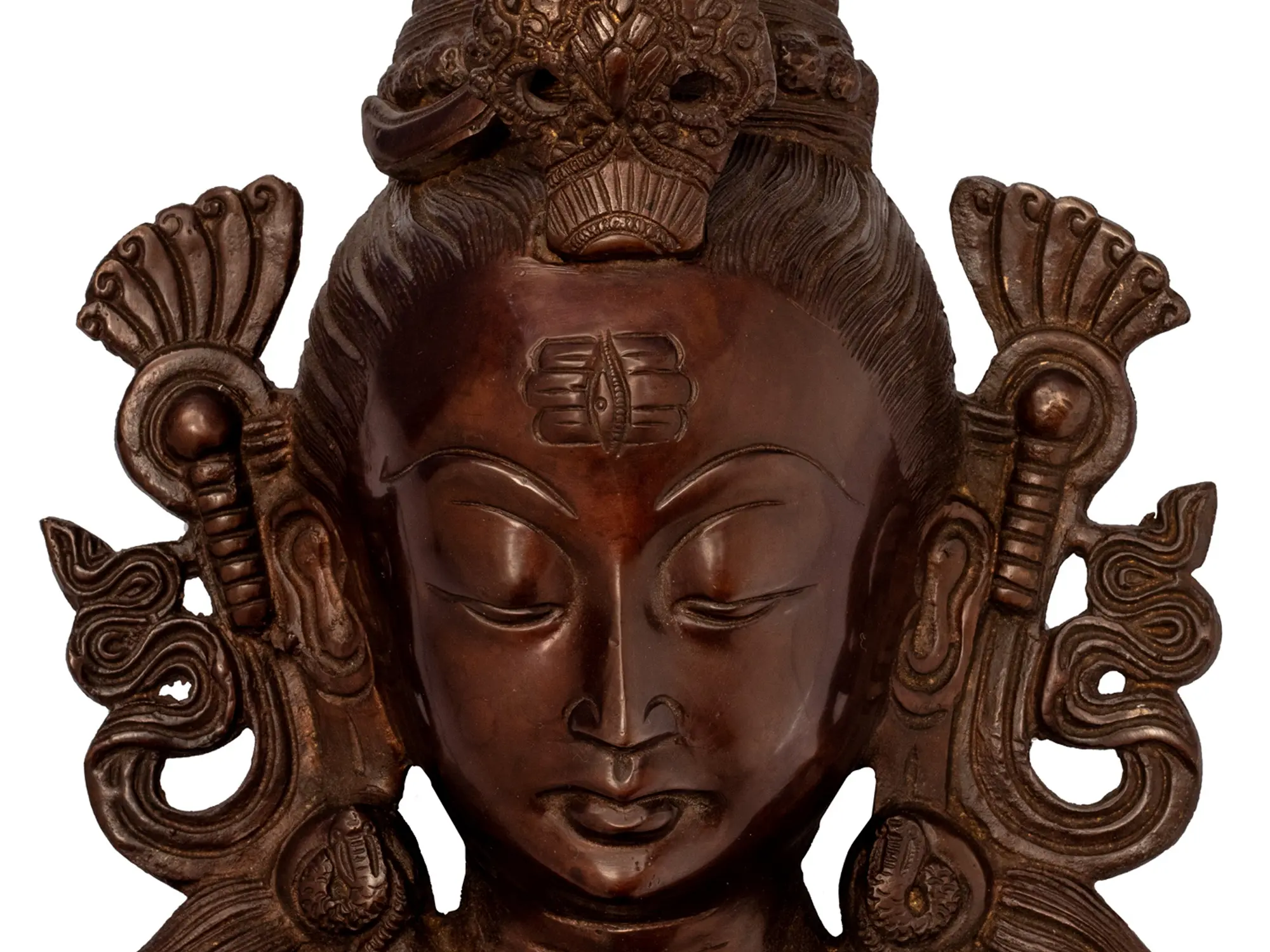 This magnificent brass wall hanging mask of Lord Shiva offers a profound depiction of his symbolism up close. The third eye, a focal point, symbolizes the awakening of consciousness, allowing us to access higher wisdom and embark on a spiritual journey of enlightenment. The snake represents the ego, either a prized ornament when mastered or a potential source of harm when untamed. It's coiled around Shiva's neck three times, representing the three forms of time – past, present, and future.