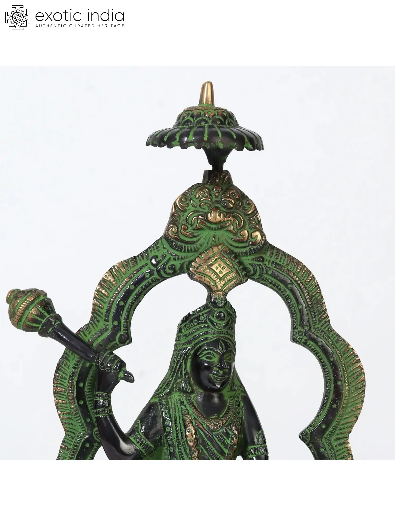 Crafted with devotion, this brass depiction of Mahavidya Bagalamukhi, one of the ten Tantrik deities known as the Mahavidyas, radiates the spiritual power of transformation. She is revered as the paralyzer of evil and ignorance, her right hand wielding a club ready to shatter misconceptions, and her left hand pulling at the demon's tongue, symbolizing the silencing of foes and the cessation of misguidance. Adorned in a radiant golden hue, she sits majestically on a throne, encompassing the ultimate knowledge and wisdom. This statue is a tribute to her divine role as the harbinger of truth and the vanquisher of delusions.