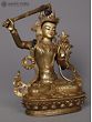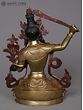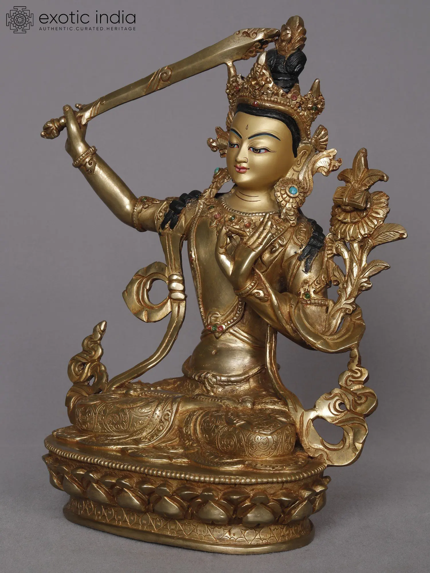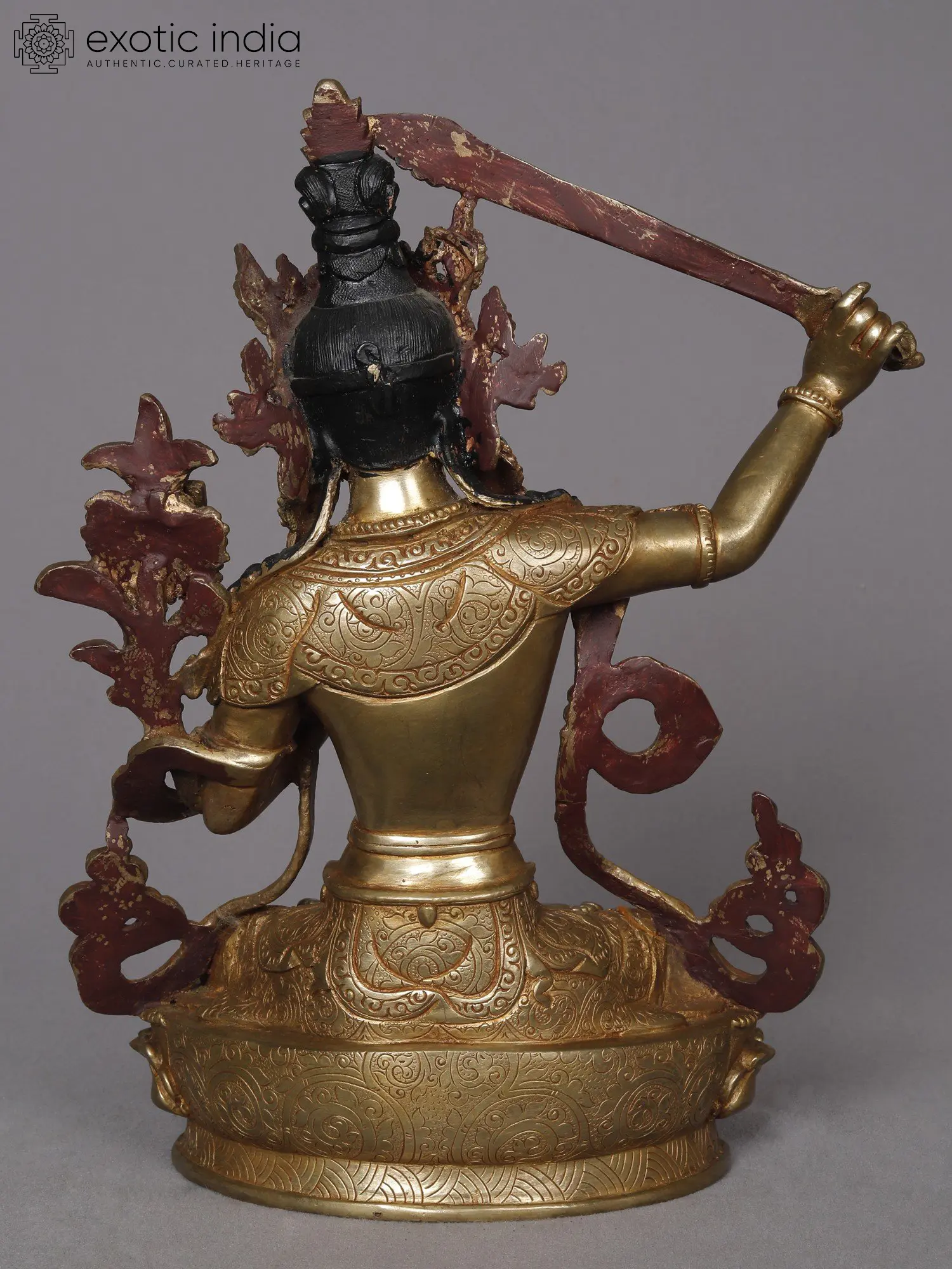 In his right hand, Manjushri grasps the flaming sword, the "Vajra Sword of Discriminating Light," a potent representation of Prajna's sharp insight. In his left hand, a resplendent blue lotus flower blooms gracefully, radiating its beauty. These symbolic elements encapsulate Manjushri's essence as a beacon of wisdom and enlightenment.