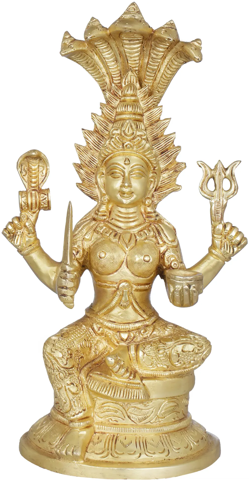 The statue portrays Mariamman with several significant iconographic elements that speak to her multifaceted powers. The prominent hooded serpent hood rising behind her head symbolizes protection, cosmic energy, and immortality. In Hindu lore, serpents are often associated with divine beings and primordial forces. She is depicted seated in a graceful yet powerful posture, radiating an aura of serene authority. Her multiple hands hold various potent symbols: a trident (trishul), representing the three gunas (Sattva, Rajas, Tamas) and her power to destroy evil; a mace, signifying strength and command; a dagger, symbolizing her ability to cut through ignorance and illusion; and a bowl, often interpreted as a vessel for offering or collecting blessings. These attributes underscore her role as a destroyer of malevolent forces and a bestower of boons and protection.