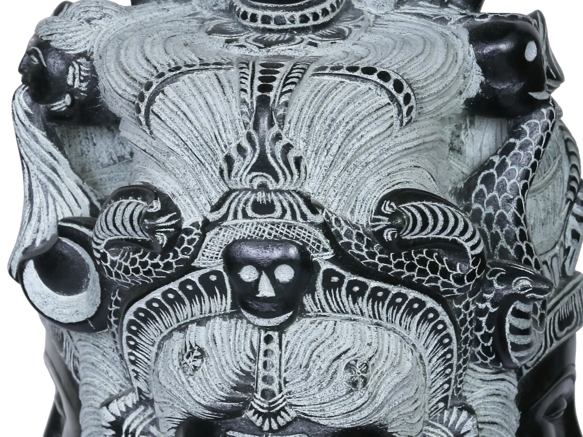 The artistry extends to reveal the integral presence of Goddess Parvati, Shiva's consort, and their son, Lord Ganesha, the remover of obstacles. Their figures are subtly yet prominently integrated into the rear of the sculpture, signifying their inseparable connection to Shiva and their roles within the divine family. Parvati, representing Shakti or feminine power, embodies love, fertility, and devotion, complementing Shiva's ascetic power. Ganesha, with his elephant head, symbolizes wisdom, intellect, and new beginnings. The inclusion of these deities highlights the holistic nature of the divine, encompassing creation, preservation, and transformation. The intricate details, from the textured scales of the cobras to the delicate carvings of the divine forms, speak to the artisan's deep understanding of Hindu iconography and their ability to translate it into tangible form.