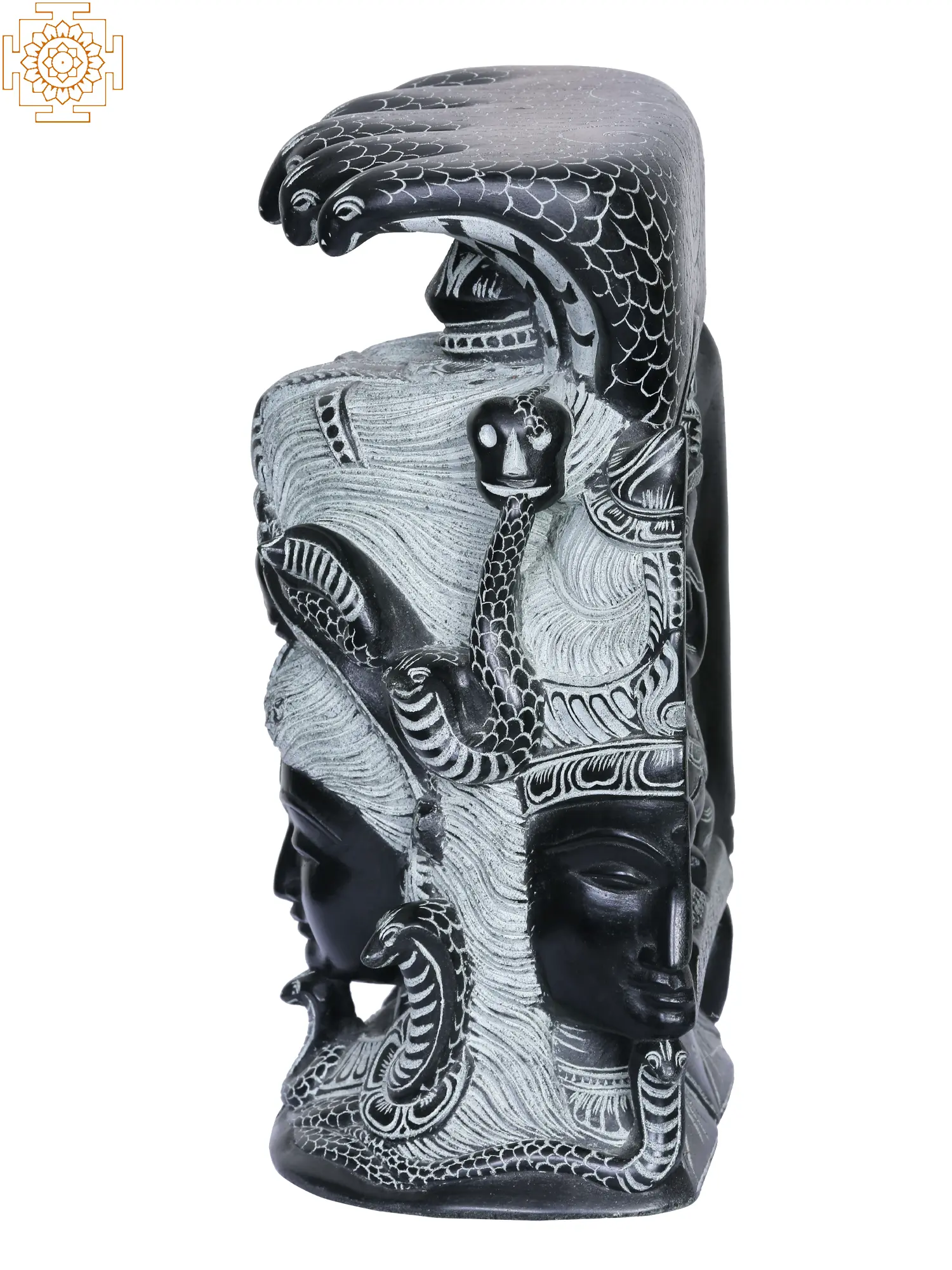 This magnificent stone sculpture is a breathtaking representation of the divine forces that shape our universe. Carved with exceptional skill in the renowned artistic hub of Mahabalipuram in South India, this piece encapsulates profound spiritual symbolism and artistic mastery. The primary focus is Lord Shiva, the destroyer and transformer, depicted with his characteristic serene yet powerful countenance. Adorning his magnificent hair is a multi-headed cobra, a symbol of cosmic energy, protection, and the eternal cycle of creation and destruction. The cobra's hood, spread wide, offers a protective canopy, mirroring Shiva's role as the guardian of the cosmos.