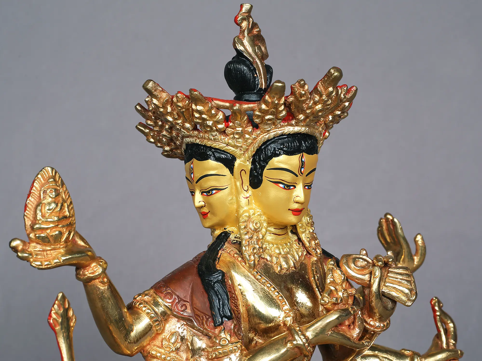 Now comes the most important part of Nepalese art which is gold gilding. This is done by the traditional fire gilding method. A mixture of mercury and 18K gold is applied on the surface of the statue and heat is applied using a flame torch. The result is that mercury evaporates along with impurities, leaving a pure 24K gold finish.