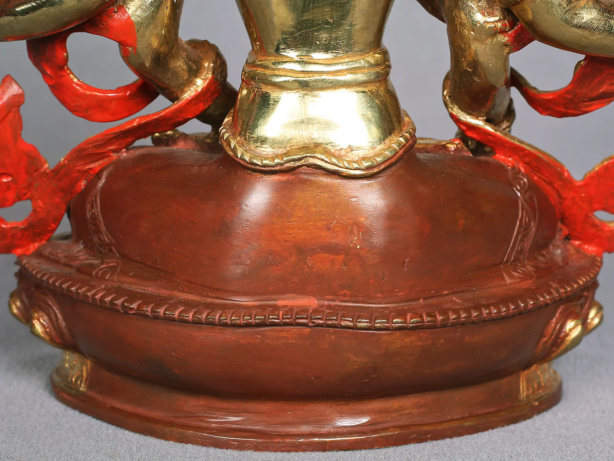 Nepalese statues and sculptures have a high copper content and therefore develop a slightly reddish patina on the surface as they age. However, the most unique feature of Nepalese copper statues is their decorative detailing. The pieces are heavily gilded and sometimes inlaid with semi-precious stones. This embellishment protects them from getting tarnished. The traditional lost-wax method for casting Nepalese copper statues remains the most practiced technique in Nepal for many centuries. This process involves many steps and requires skilled artists.