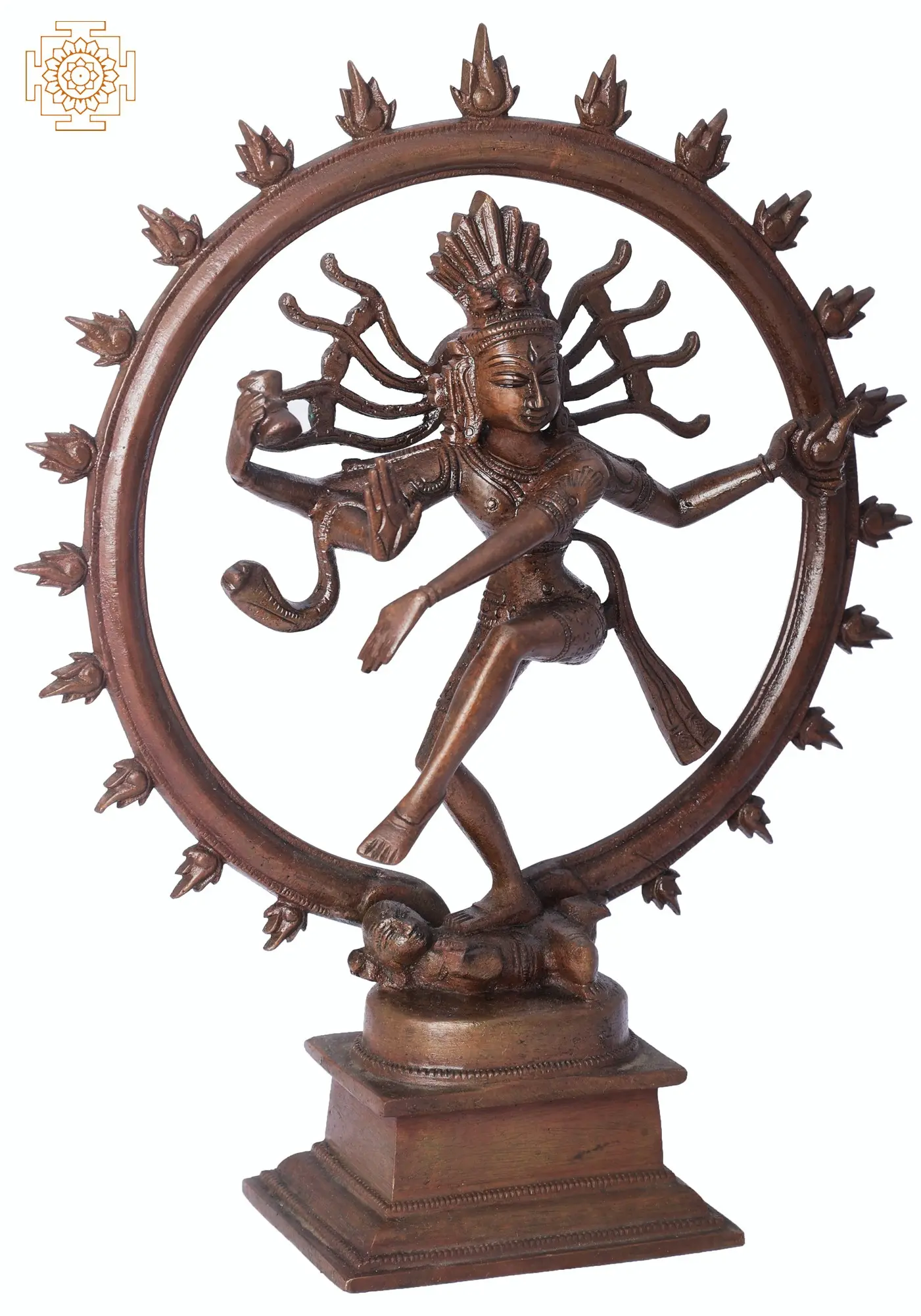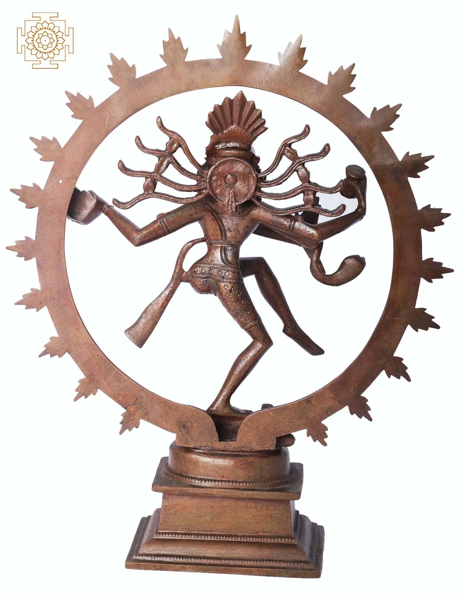Behold the magnificent Nataraja, a profound representation of Lord Shiva as the Cosmic Dancer. This exquisite bronze sculpture, meticulously crafted using the ancient Madhuchista Vidhana (lost-wax) technique in Swamimalai, a region renowned for its traditional bronze casting, captures the divine energy of Shiva's Tandava dance. The Panchaloha, a sacred alloy of five metals, imbues this piece with an enduring aura and a rich, warm patina that deepens with time, hinting at the timelessness of the cosmic cycle it represents. The Nataraja embodies the cyclical nature of existence: creation, preservation, destruction, illusion, and liberation. Each element of the sculpture tells a story. The ring of fire surrounding Shiva symbolizes the universe, the ceaseless cosmic flux, and the cycle of birth and death. His raised right foot crushes the demon Apasmara, representing the eradication of ignorance and ego, the obstacles to spiritual awakening. His upper right hand holds the damaru, a drum whose rhythmic beat marks the pulse of creation and the passage of time. The upper left hand, often depicted pouring the elixir of immortality, signifies liberation and the attainment of divine grace. The lower right hand is in the Abhaya Mudra, a gesture of reassurance and protection, dispelling fear from devotees. The dancing posture itself, dynamic and fluid, conveys the vibrant, chaotic, yet perfectly balanced nature of the universe.