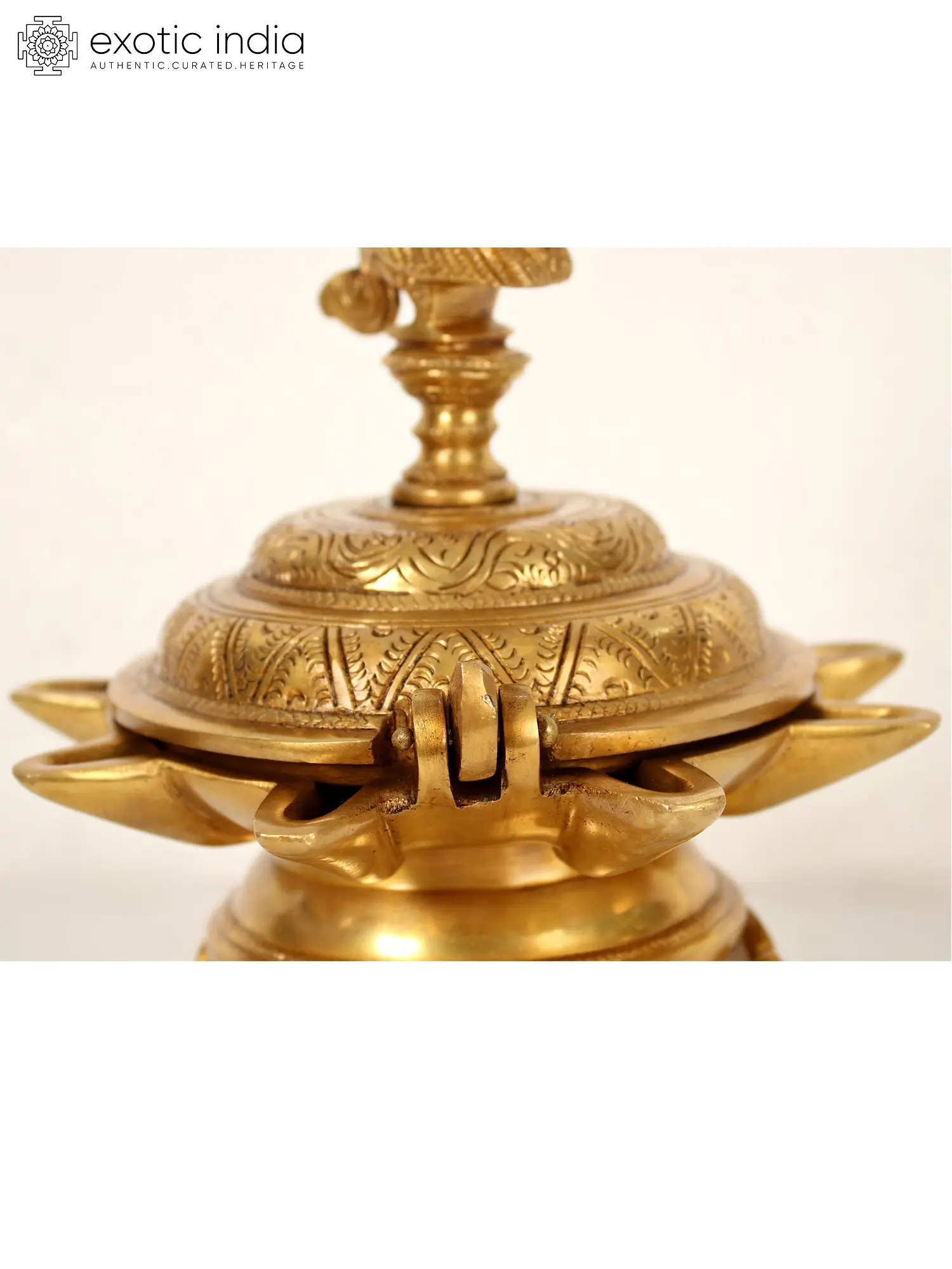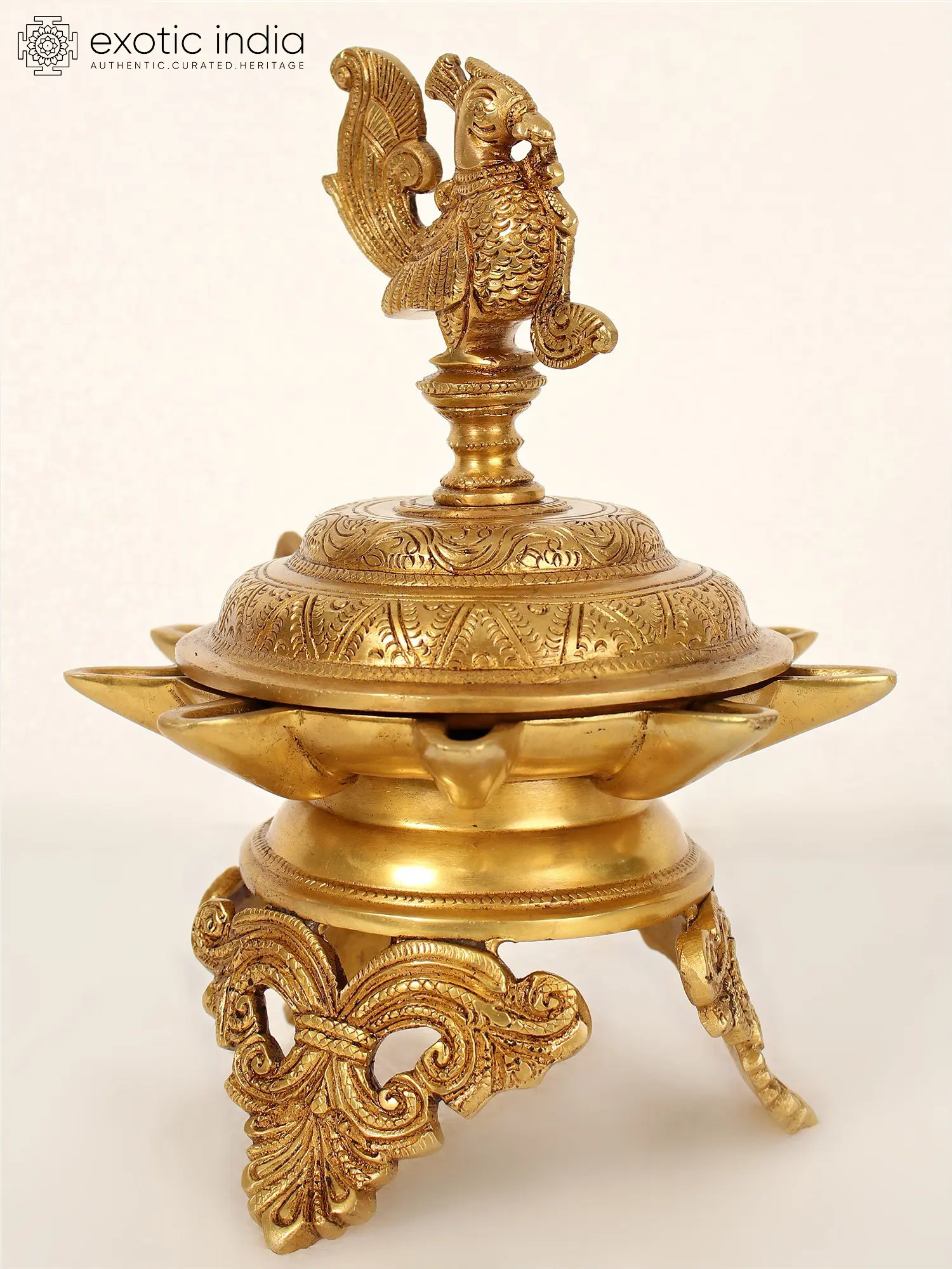 This verse from Valmiki Ramayan describes the beautiful ambiance created by the dancing of peacocks. The birds have been respected and represented in many art forms from the land of Bharata. This nine-wick peacock lamp is one of the finest uses of the graceful motifs of peacocks in art. The brass lamp comes with an attached lid with a graceful peacock motif situated atop. The lamp basins have nine crisp wicks. When the lid is closed it only covers the oil basin and the wicks remain exposed to spread the holy light. The lamp also has beautifully ornated stands looking like coiled vines. This lamp is at the peak of artistry and ritualistic objectification. Lighting this lamp brings grace, beauty, and blessings to a space.