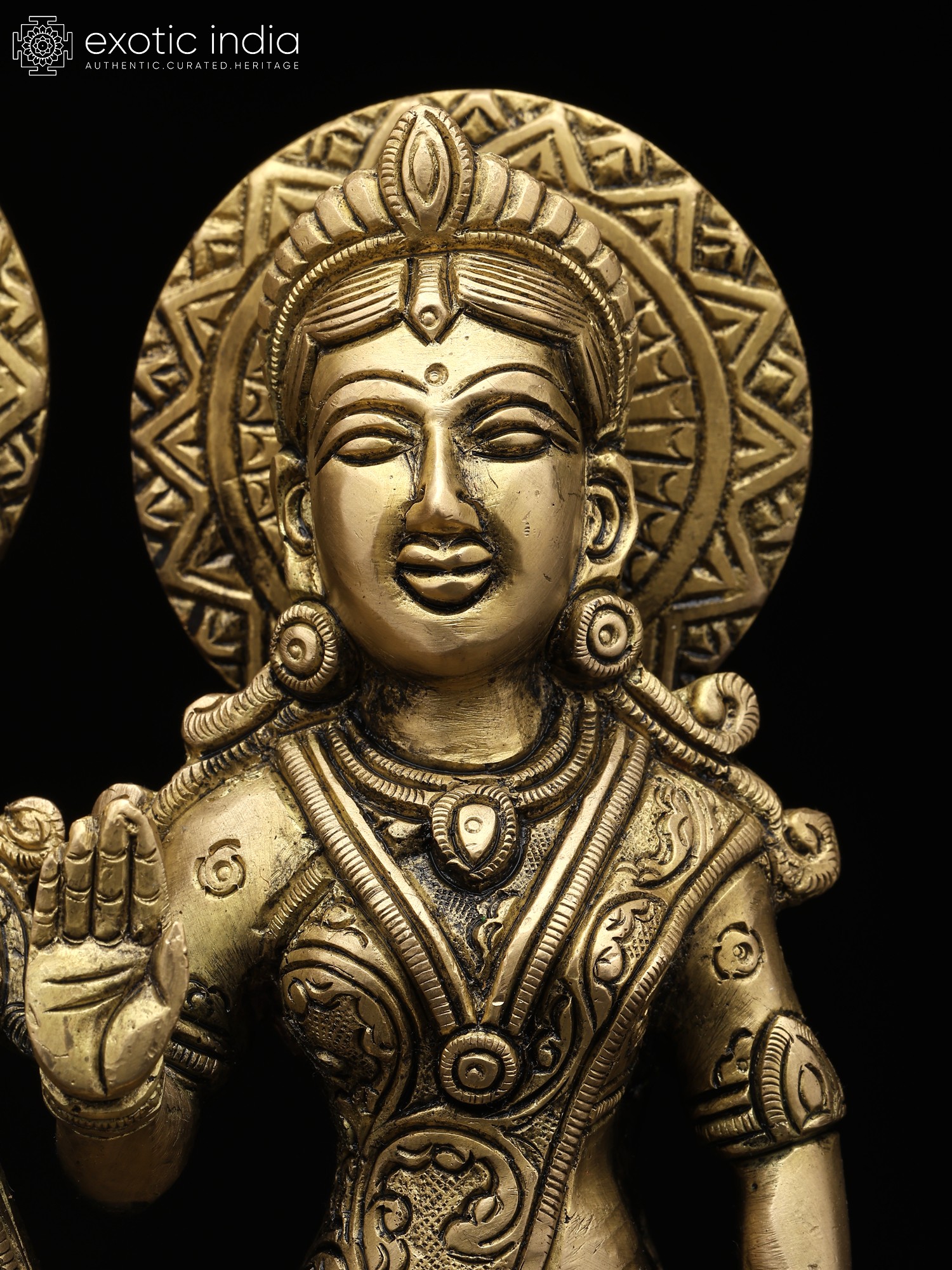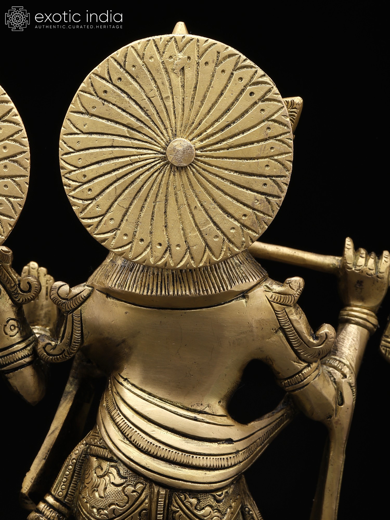 Every curve and contour of this handcrafted brass statue speaks to the skill and dedication of the artisans who created it. The delicate ornamentation on their garments, the serene expressions on their faces, and the graceful poses all contribute to the statue's captivating presence. Krishna is poised with his flute, ready to fill the world with the enchanting melody of divine love. Radha stands elegantly beside him, her hand in a gesture of blessing, signifying her boundless compassion and grace. The intricate halo behind each figure adds to their divine aura, further emphasizing their transcendental nature. This handcrafted piece embodies the rich artistic traditions of India. This statue serves as a beautiful reminder of the power of love, devotion, and the eternal quest for union with the divine. It is more than just a decorative object; it is a powerful symbol of spiritual aspiration and the transformative potential of love. It is an exquisite piece, suitable for enhancing your sacred space or as a meaningful gift for someone special. The statue's warm and inviting presence will bring a sense of peace and harmony to any environment.