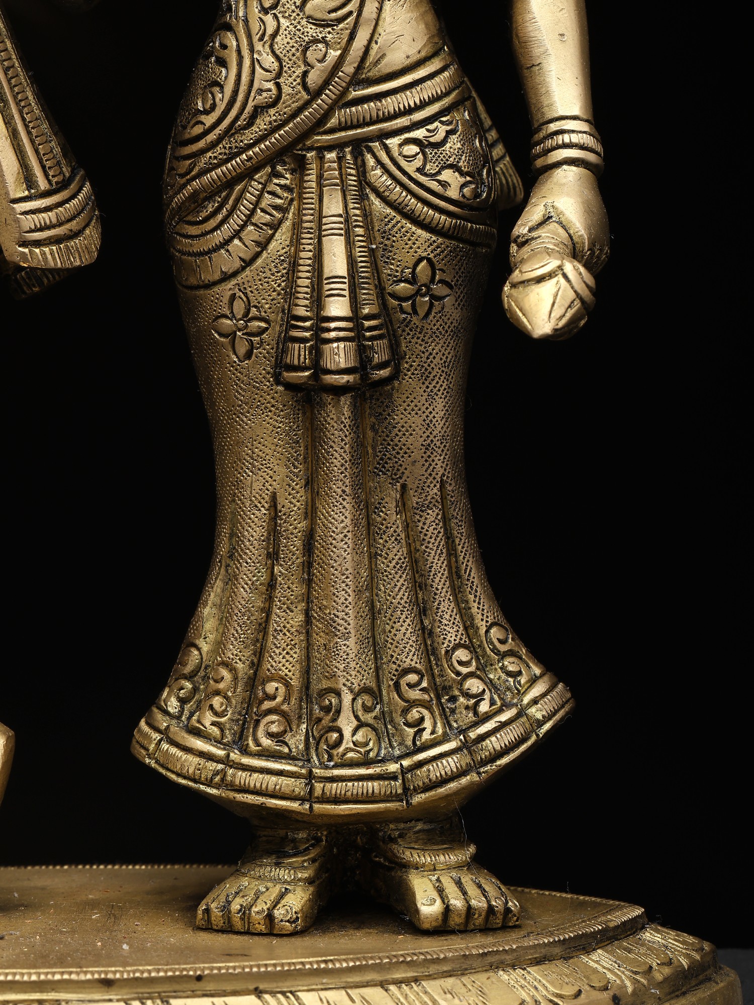 This finely crafted statue depicts Radha and Krishna, the embodiment of divine love and devotion within the Hindu tradition. The pair are not merely lovers but are considered the ultimate union of the masculine and feminine principles, a powerful symbol of spiritual and emotional fulfillment. The rich detail and warm, golden hues of the brass bring their eternal story to life, capturing the essence of their transcendental bond. Krishna, often depicted with his enchanting flute, is not only a cowherd but a cosmic deity. His playful nature, evident in the tales of his childhood pranks and heroic feats, masks his true identity as the preserver and protector of the universe. Radha, on the other hand, is the epitome of devotion, her love for Krishna surpassing all earthly attachments. Their relationship is a complex tapestry of longing, surrender, and ultimate union with the divine.