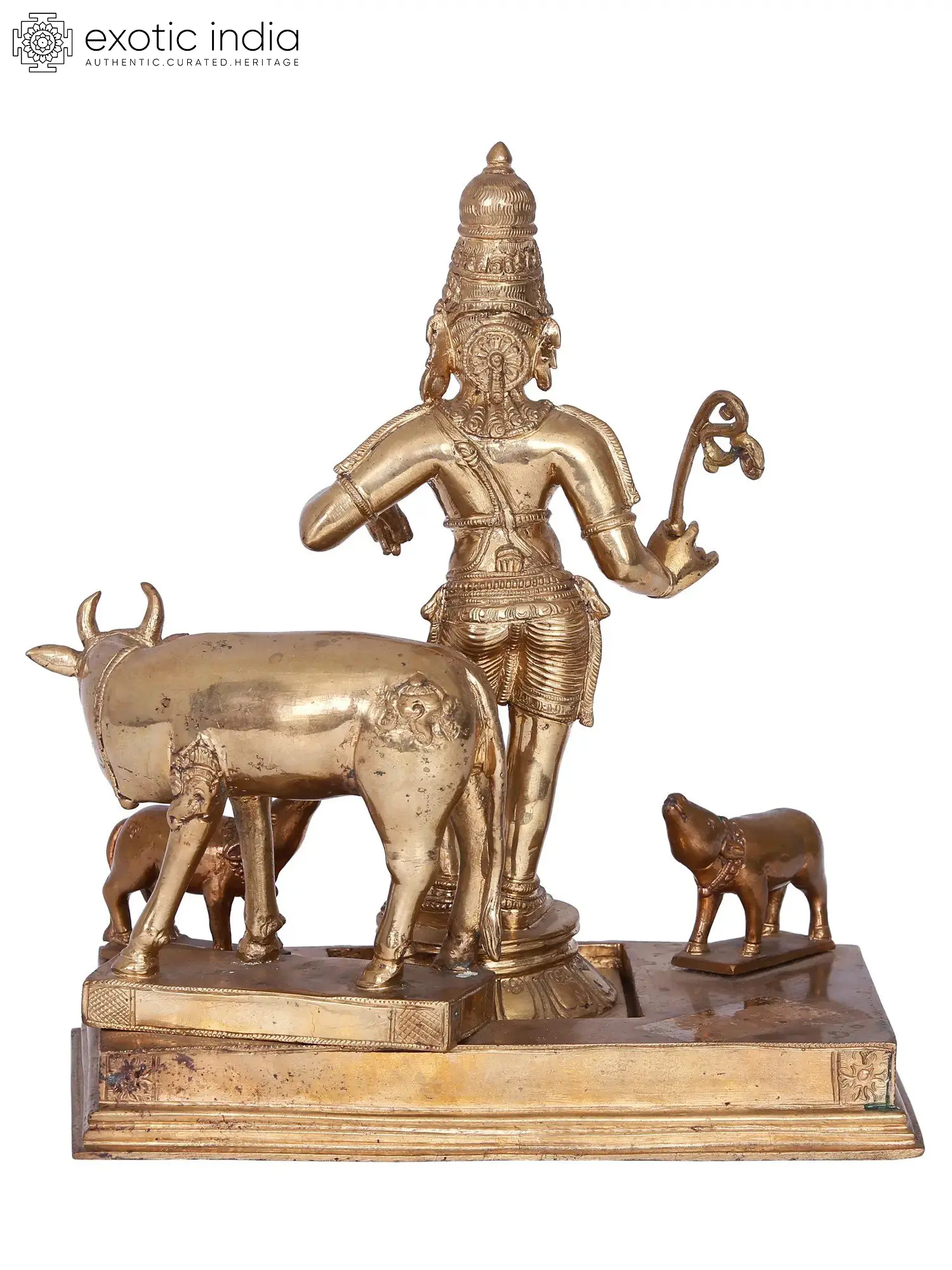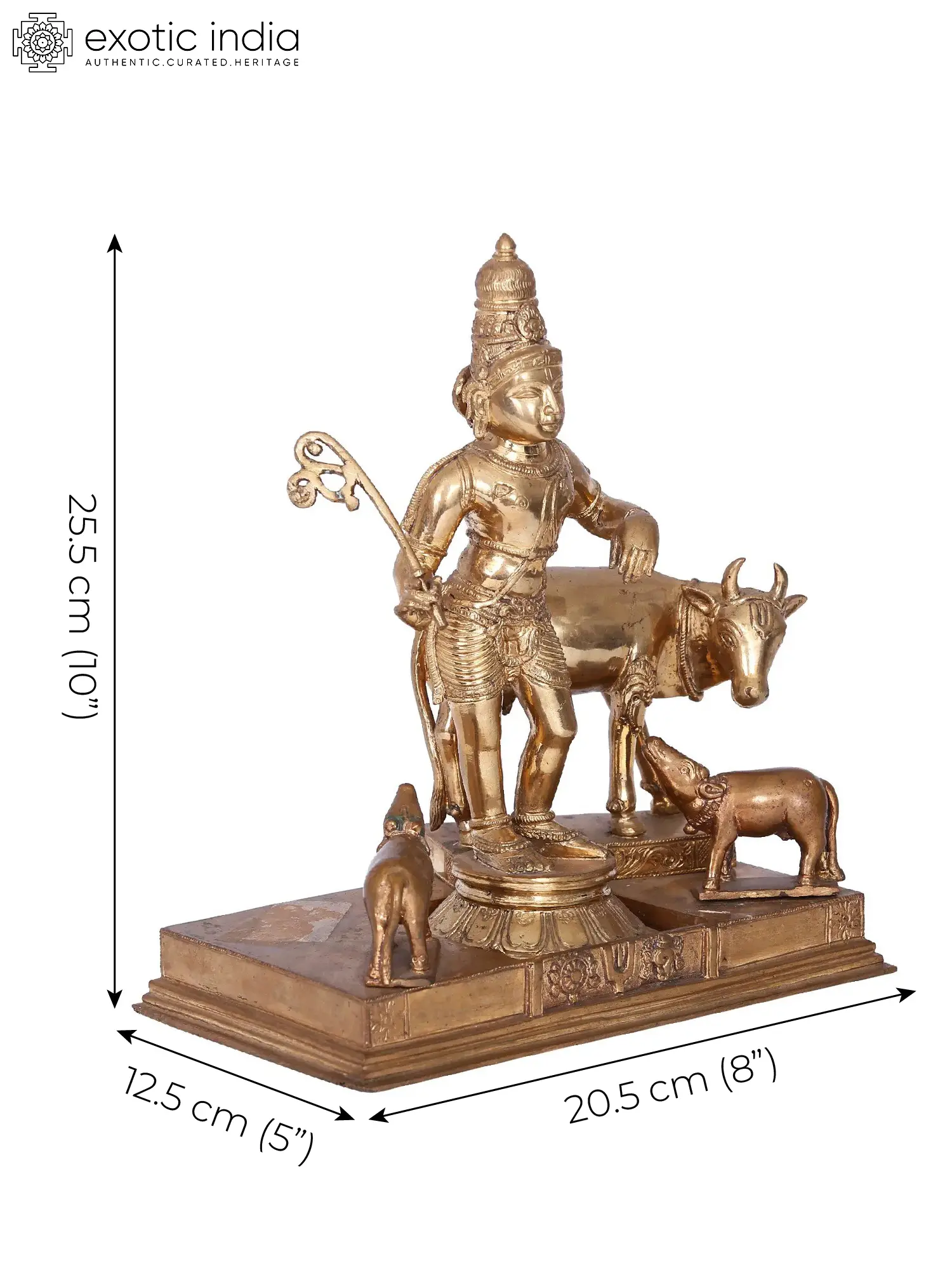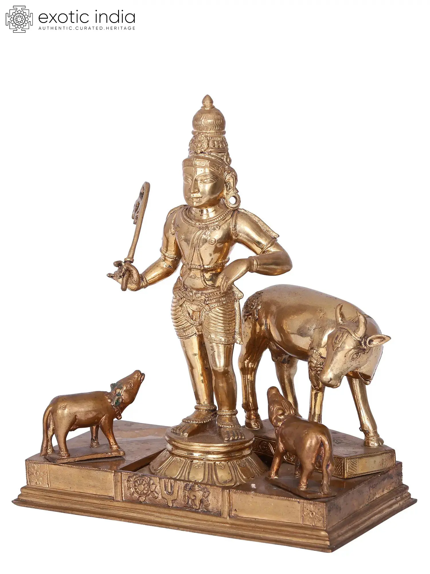 Immerse yourself in the pastoral charm with our Rajagopal as Cowherder sculpture, a splendid creation through Madhuchista Vidhanam in Swamimalai's Panchaloha Bronze. This artwork beautifully portrays Lord Krishna in his endearing role as a cow herder. Beyond its artistic finesse, the sculpture embodies the Hindu philosophical concept of 'Simple Living,' emphasising Krishna's connection with nature and simplicity. The lost-wax technique captures the essence of Rajagopal's pastoral life, inviting you to appreciate the beauty of a humble and harmonious existence.