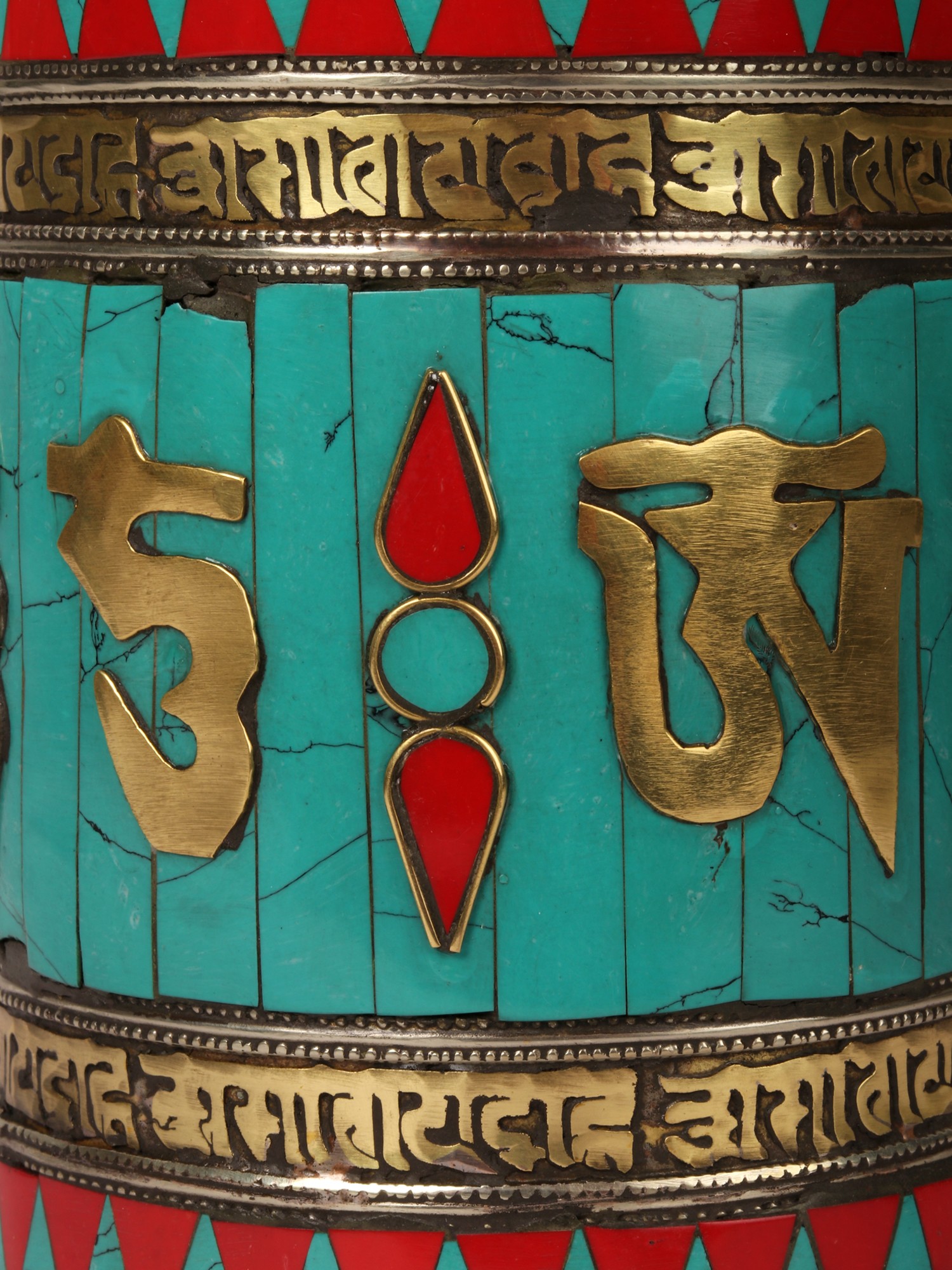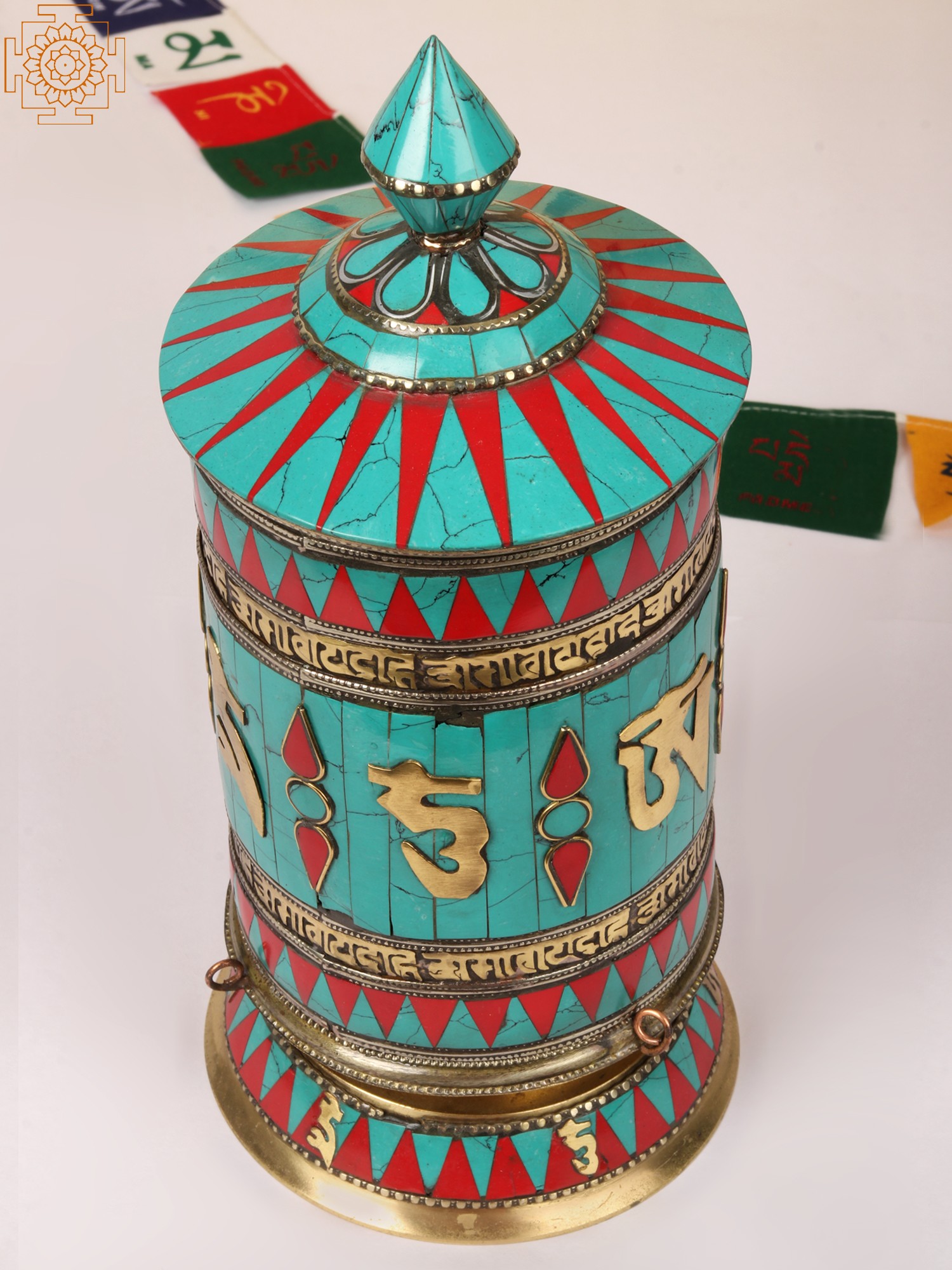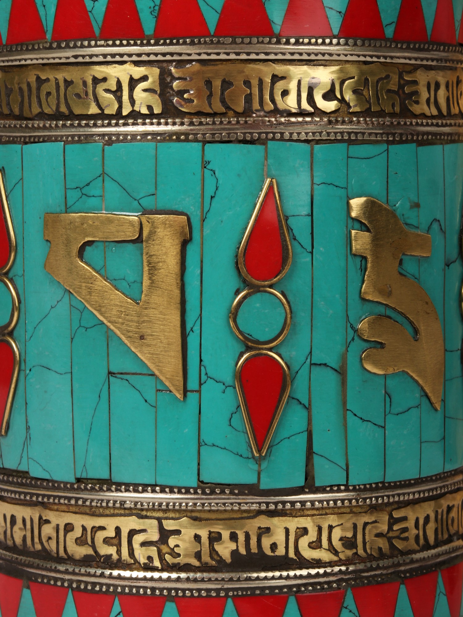 The prayer wheels are an integral part of the Tibetan Buddhist religious practices. They are the ritual objects used for continuing meditation and chanting of mantra. This Rotating Prayer Wheel with Mantras in Tibetan script is a captivating treasure from Nepal. Crafted with precision from brass and adorned with intricate inlay work, it holds the essence of Tibetan spirituality. As it turns, the inscribed mantras release sacred vibrations, believed to bestow blessings and peace. This exquisite piece not only celebrates artistry but also offers a tangible connection to the rich tapestry of Tibetan culture, inviting you to embark on a spiritual journey with every rotation.