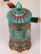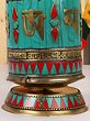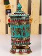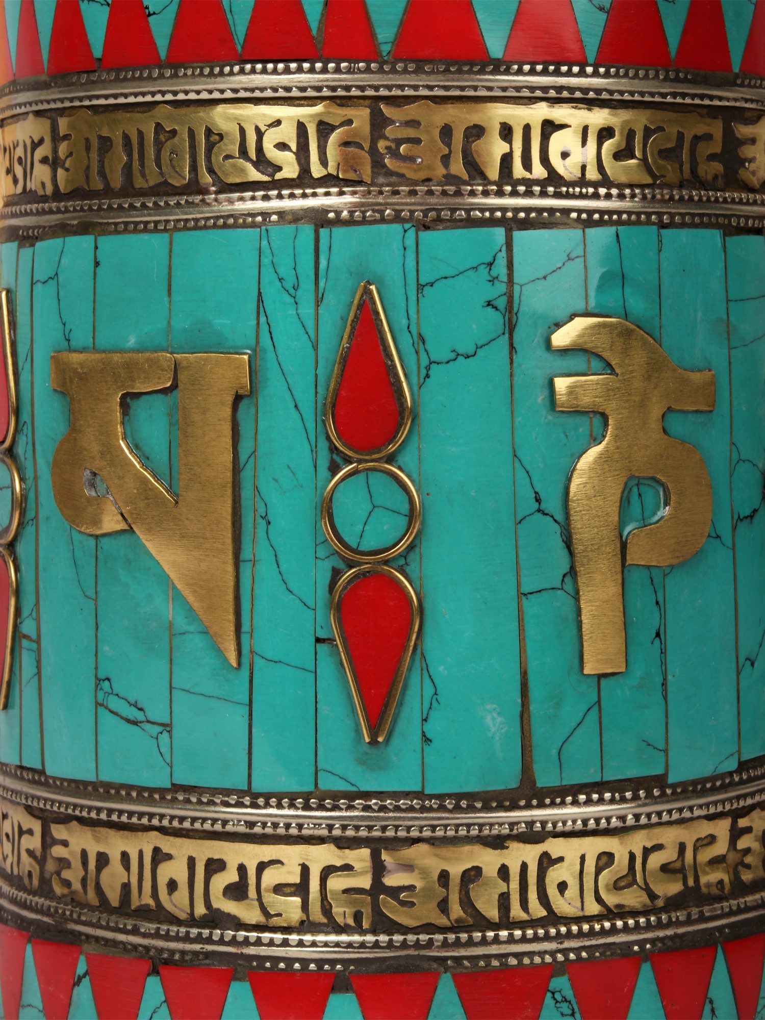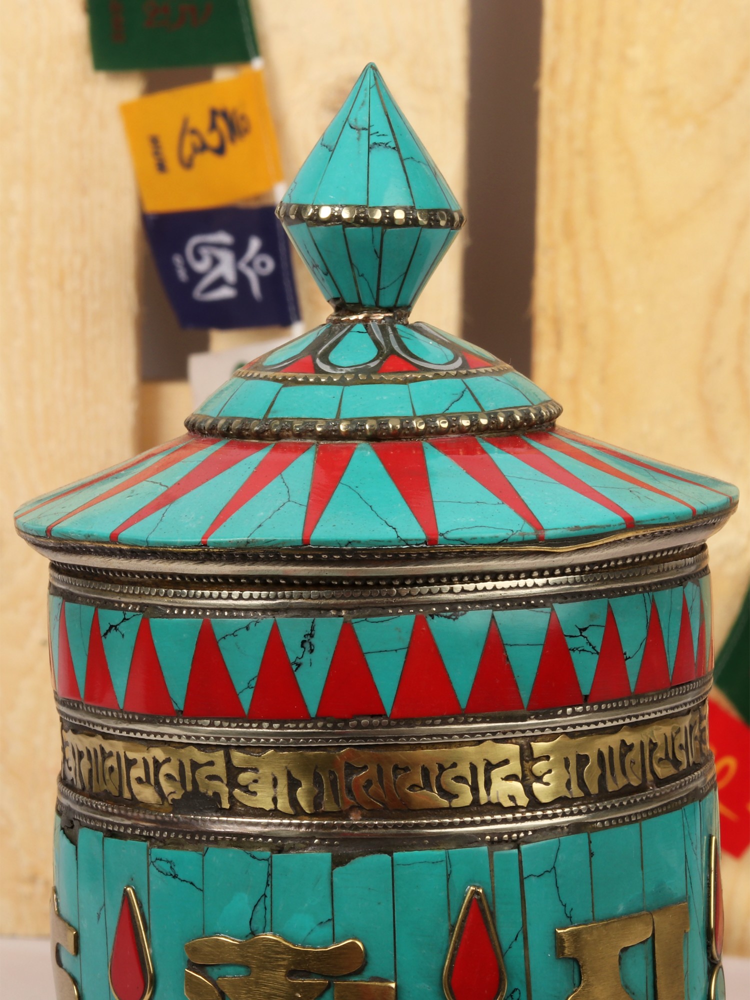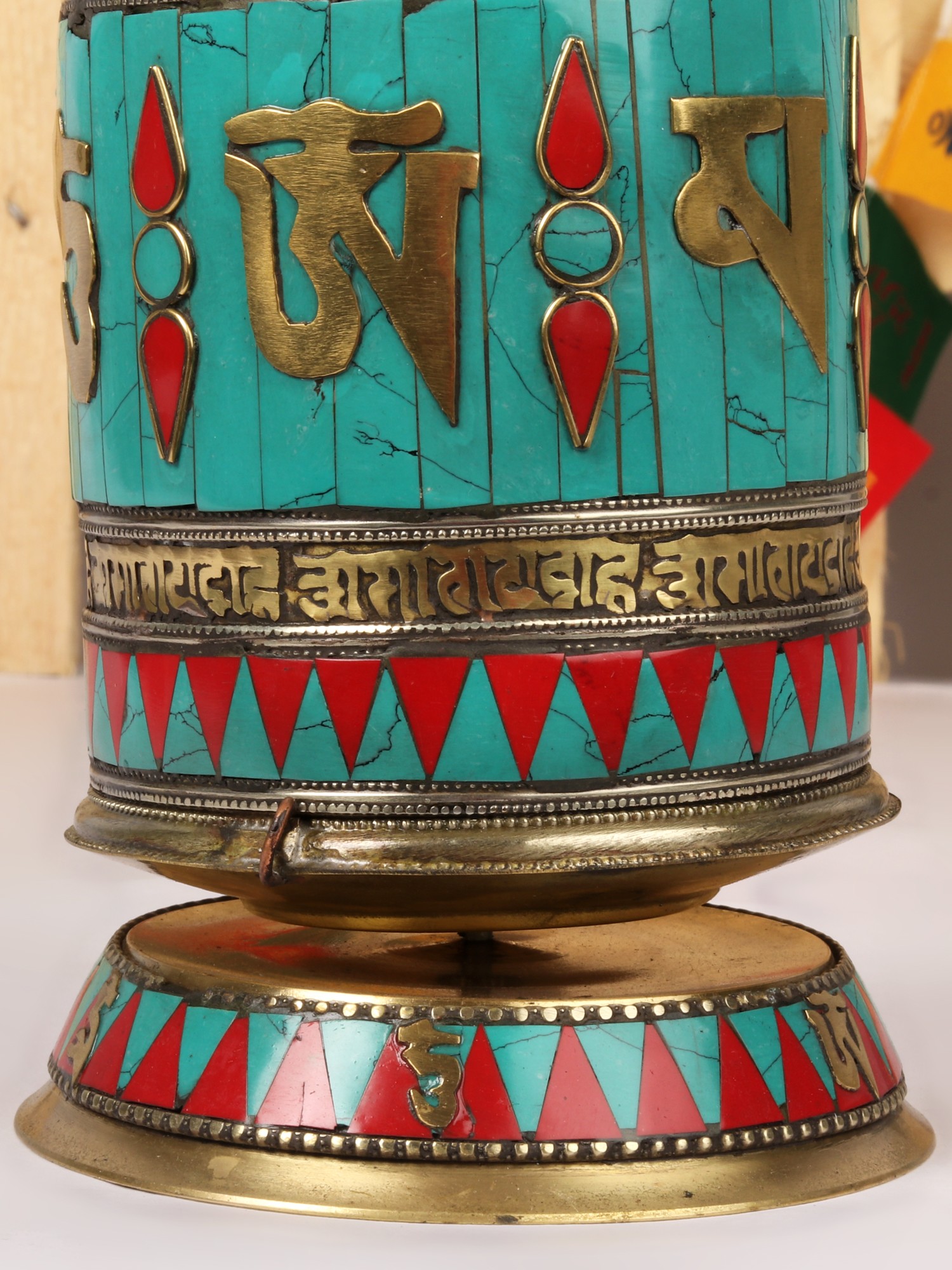The prayer wheels are an integral part of the Tibetan Buddhist religious practices. They are the ritual objects used for continuing meditation and chanting of mantra. This Rotating Prayer Wheel with Mantras in Tibetan script is a captivating treasure from Nepal. Crafted with precision from brass and adorned with intricate inlay work, it holds the essence of Tibetan spirituality. As it turns, the inscribed mantras release sacred vibrations, believed to bestow blessings and peace. This exquisite piece not only celebrates artistry but also offers a tangible connection to the rich tapestry of Tibetan culture, inviting you to embark on a spiritual journey with every rotation.