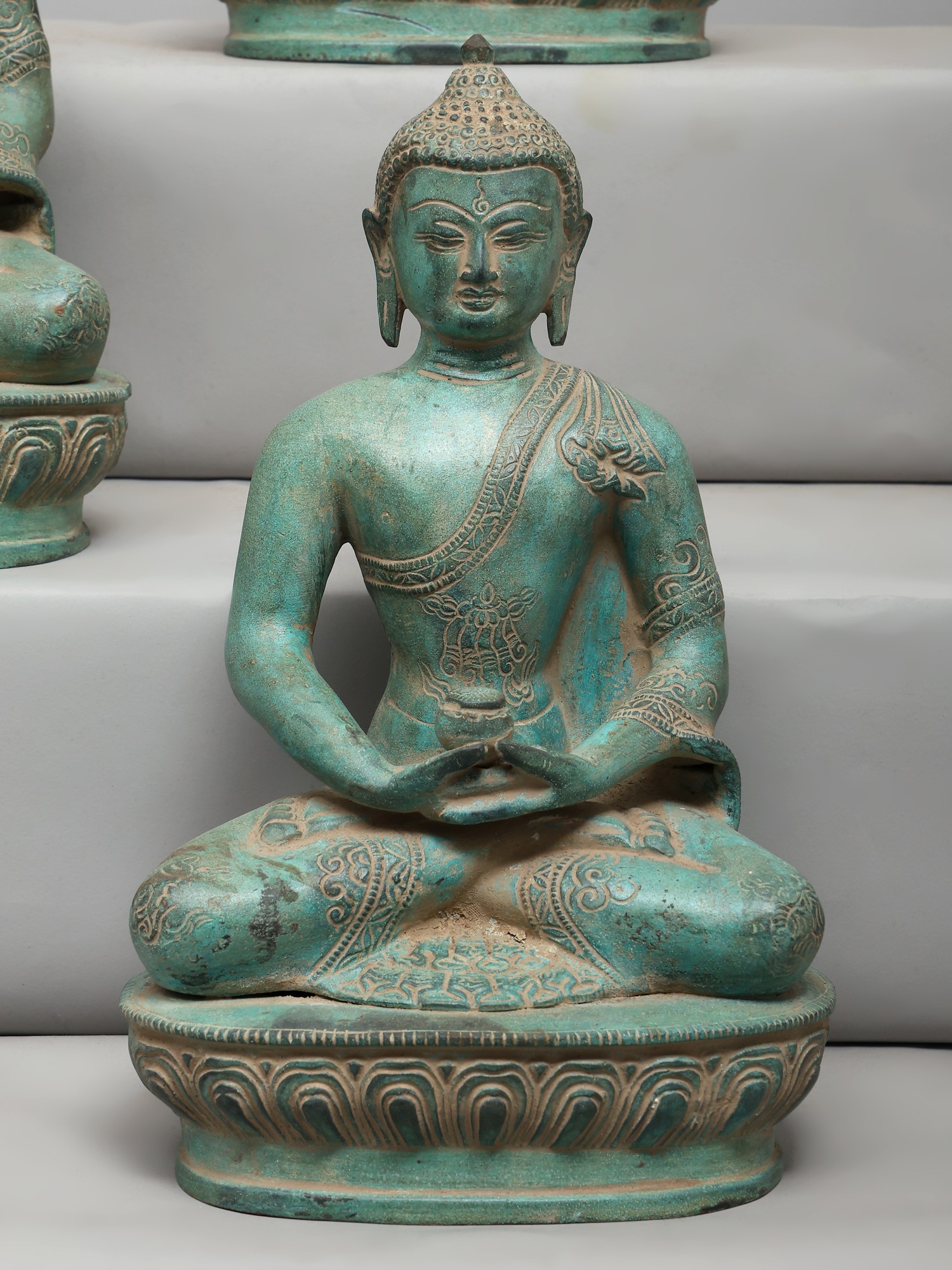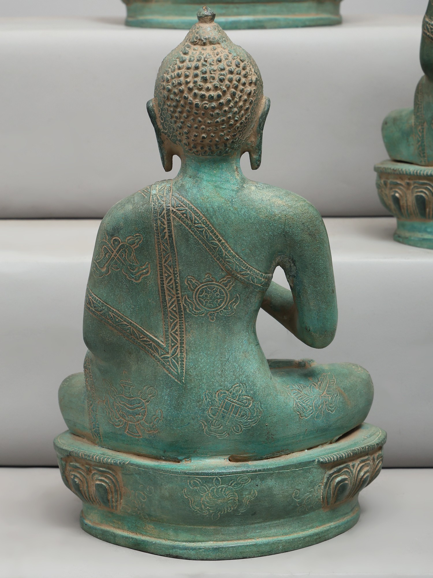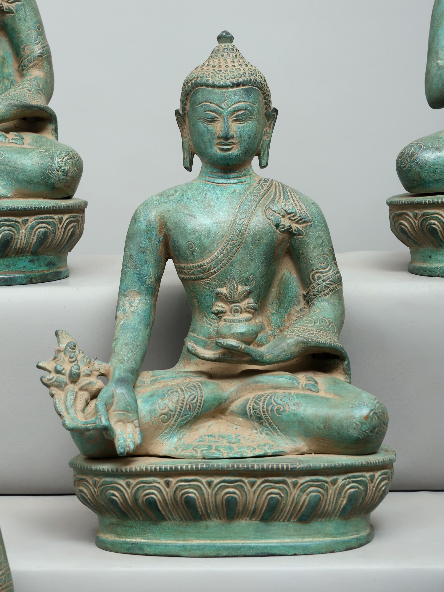 This exquisite set of five brass statues captures the profound essence of Buddhist teachings, each figure meticulously rendered to embody a distinct mudra, or symbolic hand gesture. These are not mere decorative objects but potent conduits of spiritual energy, designed to bring peace, wisdom, and compassion into your living space. The aged patina, a testament to the skilled artistry and traditional casting techniques, evokes a sense of antiquity and deep spiritual resonance. The verdigris finish, reminiscent of ancient bronze unearthed from sacred sites, hints at the timeless nature of the Buddha's message.