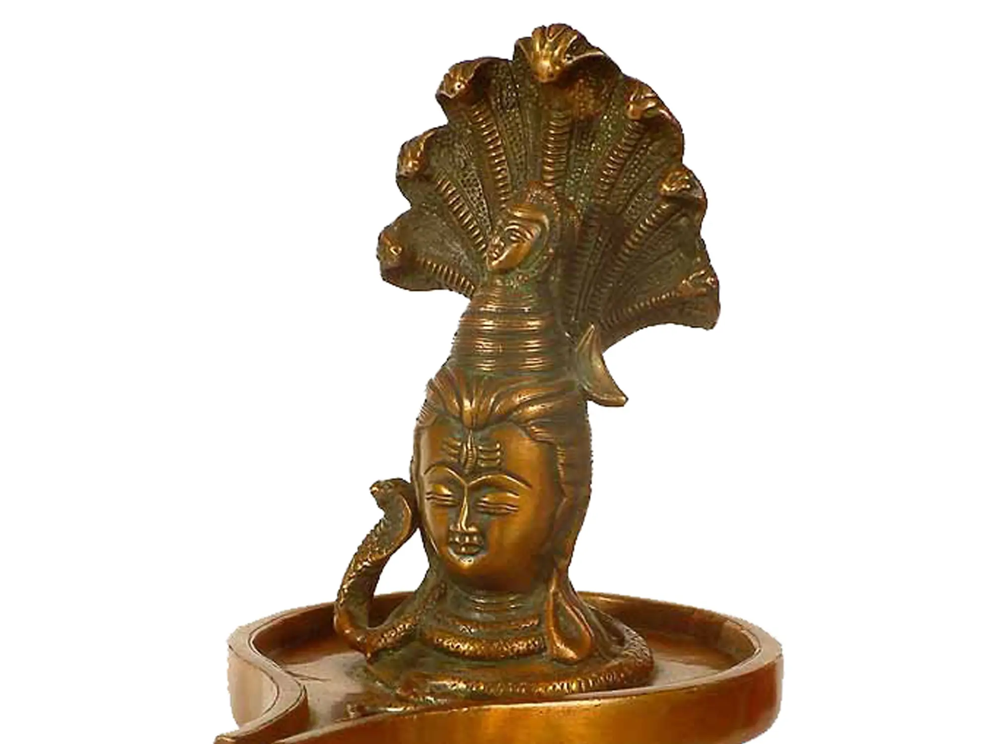 The sculpture is ingeniously designed to function as a traditional oil lamp, a Divya, or Diya. The base, sculpted with ornate patterns, supports a basin that can hold oil and a wick. This aspect transforms the static representation of the divine into an active participant in devotion. Lighting the lamp symbolizes the dispelling of ignorance, the illumination of the inner self, and the offering of light to the divine. In this context, the light itself becomes a prayer, a beacon of spiritual seeking directed towards Lord Shiva. The Lingam itself, an abstract or aniconic representation of Shiva, is central to Shaivism. It symbolizes the formless, all-pervading, and infinite nature of the divine. Shiva's serene face emerging from the Lingam signifies that even within the formless absolute, there is consciousness, compassion, and divine presence. This unique depiction merges the aniconic and anthropomorphic aspects of Shiva, offering a holistic representation of his multifaceted divinity. The skilled hands of Indian artisans have breathed life into this brass form, ensuring each detail, from the tranquil expression on Shiva's face to the subtle undulations of the cobra's scales, resonates with spiritual significance. This piece is more than a statue; it is an invitation to connect with the divine, to light a lamp of knowledge, and to invite peace and spiritual growth into your sacred space.